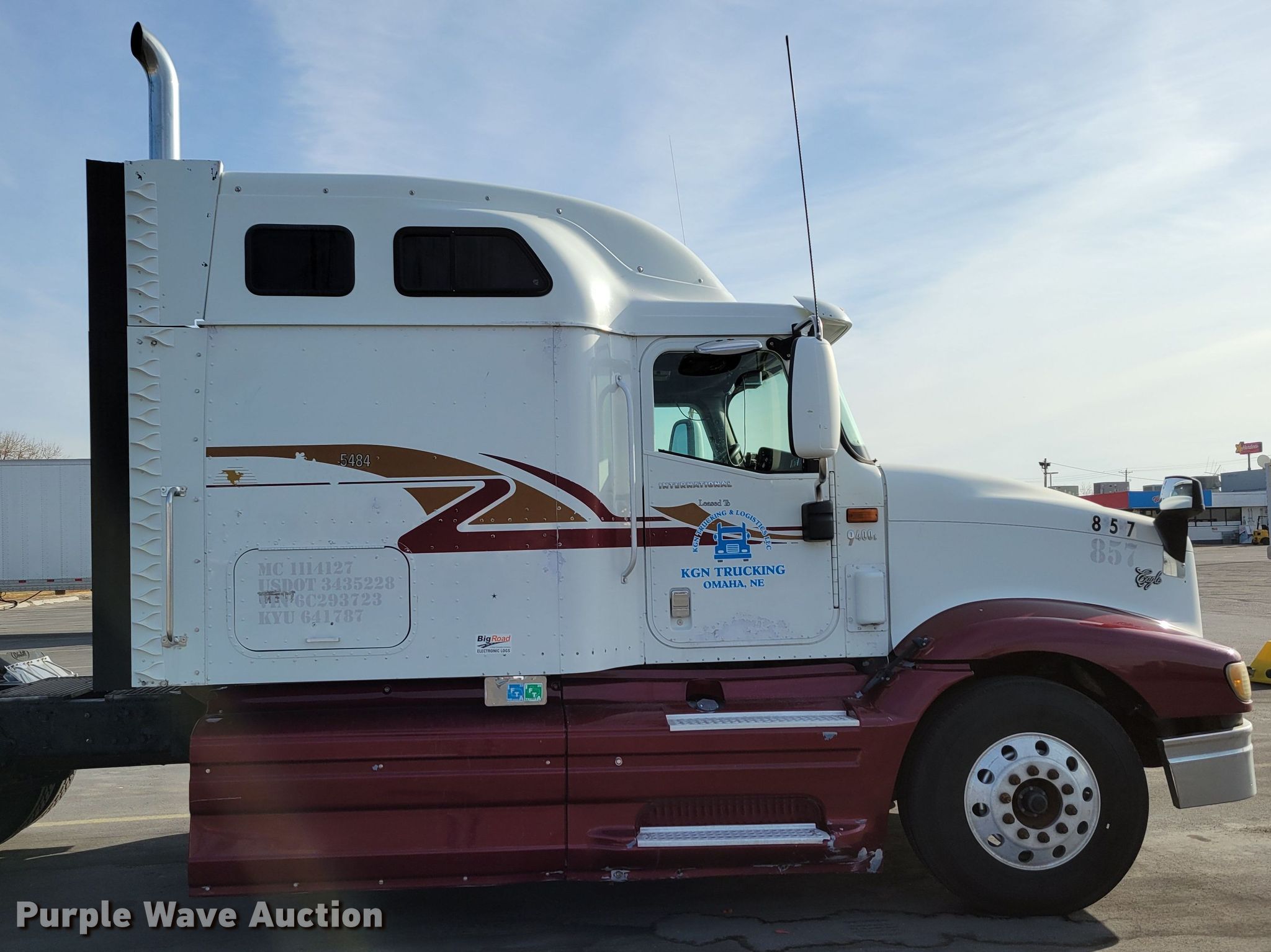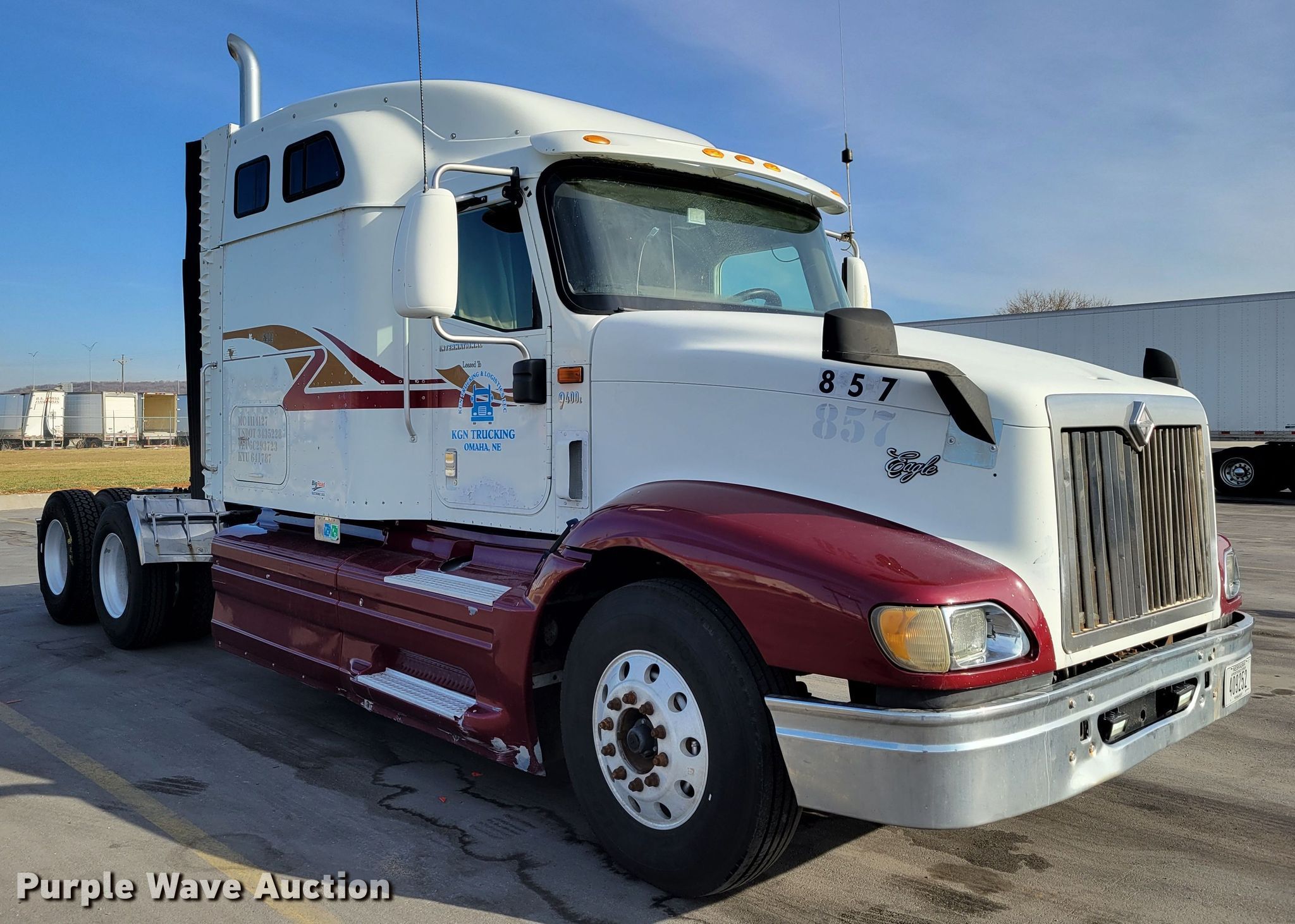 2006 International Eagle 9400i semi truck. Miles: 311,287 on odometer, Hours: 14,435 on meter, VIN: 2HSCNAPR96C293723, Unit #: 857. Engine Cummins ISX, Displacement: 14.9L, Cylinders: 6, Fuel type: Diesel, Engine brake. Transmission Eaton Fuller, Manual, Speed: 10. Chassis Axles: Tandem, Suspension: Air Dump valves, Brakes: Air, PTO, GVWR: 52,000 lbs FAWR: 12,000 lbs, IAWR: 20,000 lbs, RAWR: 20,000 lbs, Wheelbase: 248". Interior AC, Heat, Heated mirrors, Power windows, Power locks, Cruise control, Air ride cab, Sleeper Sleeper length: 70", Beds: Single, Refrigerator, Rear climate control. Features Deck plate: Aluminum, Fifth wheel type: Air operated, Sliding, Fuel tank: Dual. Tires Size: 11R22.5. Notes Monitor will be removed. Nebraska title. KGN Trucking. 3210 South 7th Street. Council Bluffs, IA 51501
