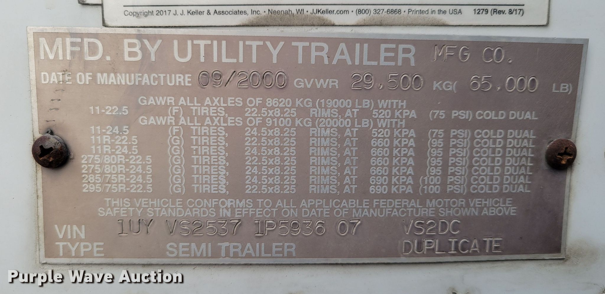 2001 Utility Trailer V52DC dry van trailer. VIN: 1UYVS25371P593607, Unit #: 855. Dimensions Overall: 53' L x 102" W. Features Deck type: Wood. Chassis Landing gear: Dual, Two speed, Suspension: Air, Brakes: Air, Axles: Tandem, GVWR: 65,000 lbs. Tires Steel wheels, Size: 295/75R22.5. Notes Left rear hub seal leaks. Nebraska title. KGN Trucking. 3210 South 7th Street. Council Bluffs, IA 51501