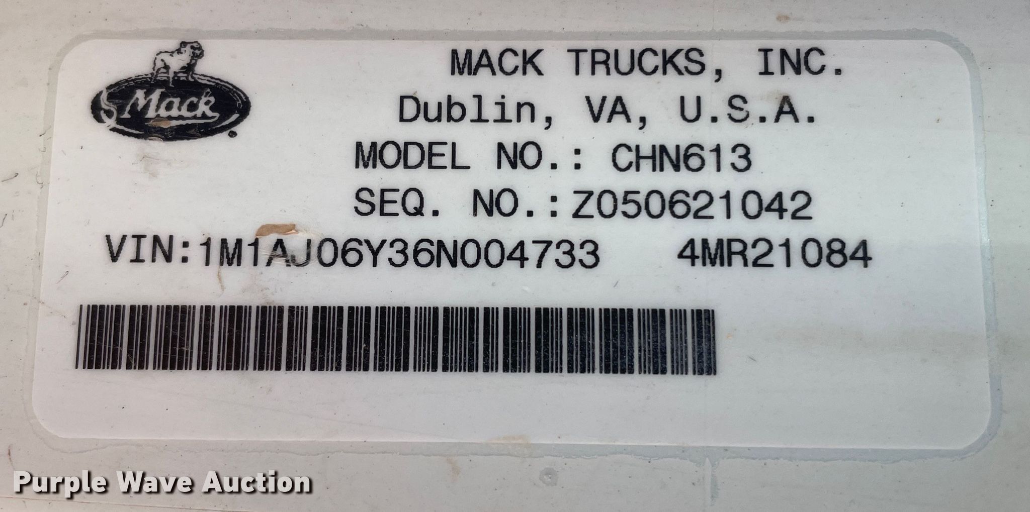 Purple Wave is selling a used Truck Tractor in Texas. This item is a 2006 Mack CHN613 semi truck with the following: Miles: 734,150 on odometer, Hours: 7,084 on meter, VIN: 1M1AJ06Y36N004733, Unit #: 09