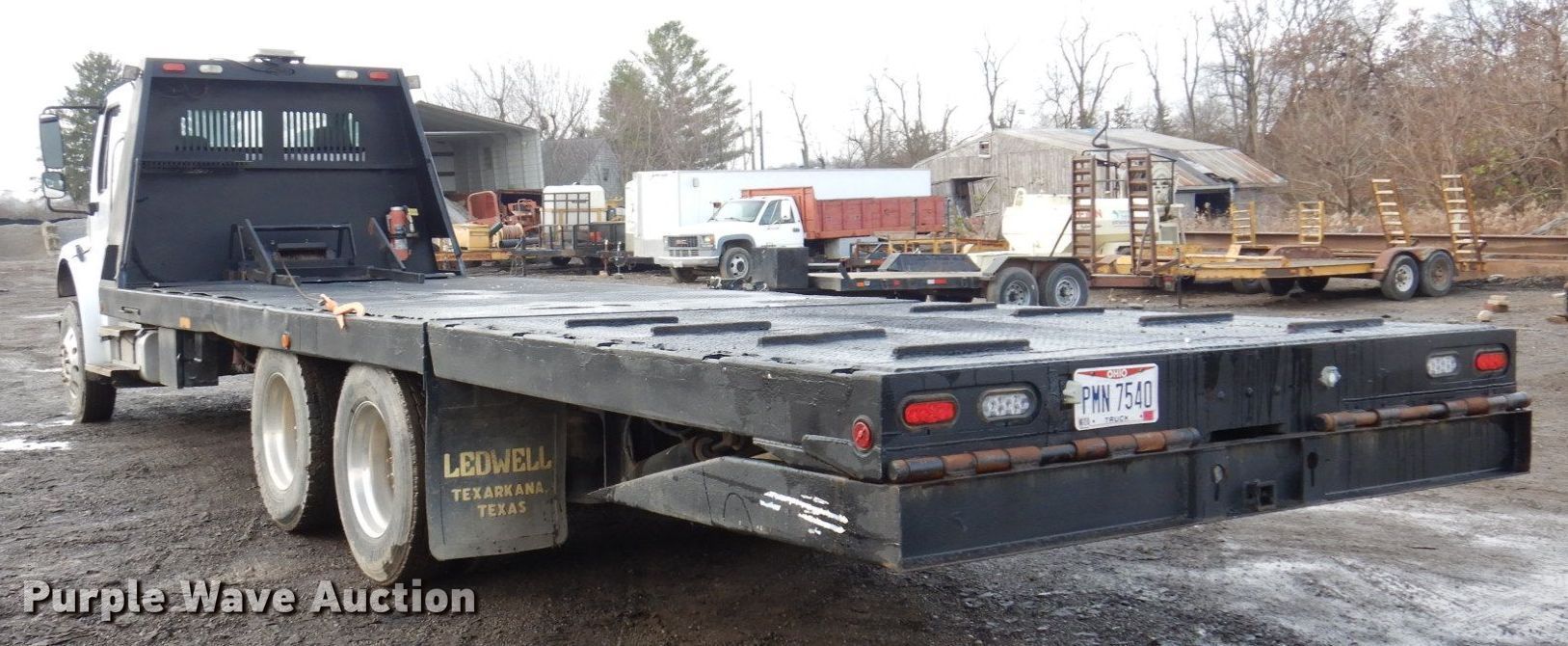 2007 Freightliner M2 flatbed truck. Miles: 155,320 on odometer, Hours: 11,631 on meter, VIN: 1FVHCYDJ77DZ17424. Engine Mercedes Benz, Displacement: 7.2L, Cylinders: 6, Fuel type: Diesel. Transmission Eaton Fuller, Manual, Speed: 9. Chassis Axles: Tandem, Suspension: Air, Brakes: Air, PTO, GVWR: 54,320 lbs, Wheelbase: 252". Interior AC, Heat, Heated mirrors, Power windows, Power locks, Cruise control, Brake controller. Features Flatbed Ledwell LW28HT, 28' L x 98" W, Hydratail: 9' 2" L, Ramps: 60" L, Winch Capacity: 20,000 lbs. Tires Size: 275/80R22.5. Notes Dash warning indicator: Check engine. Ohio title. Mileage has not been verified. Exempt will be written in the odometer disclosure on the title.. Title distribution may be delayed up to 14 days from verification of funds. Oheil Irrigation Company. 2109 East Social Row Road. Dayton, OH 45458