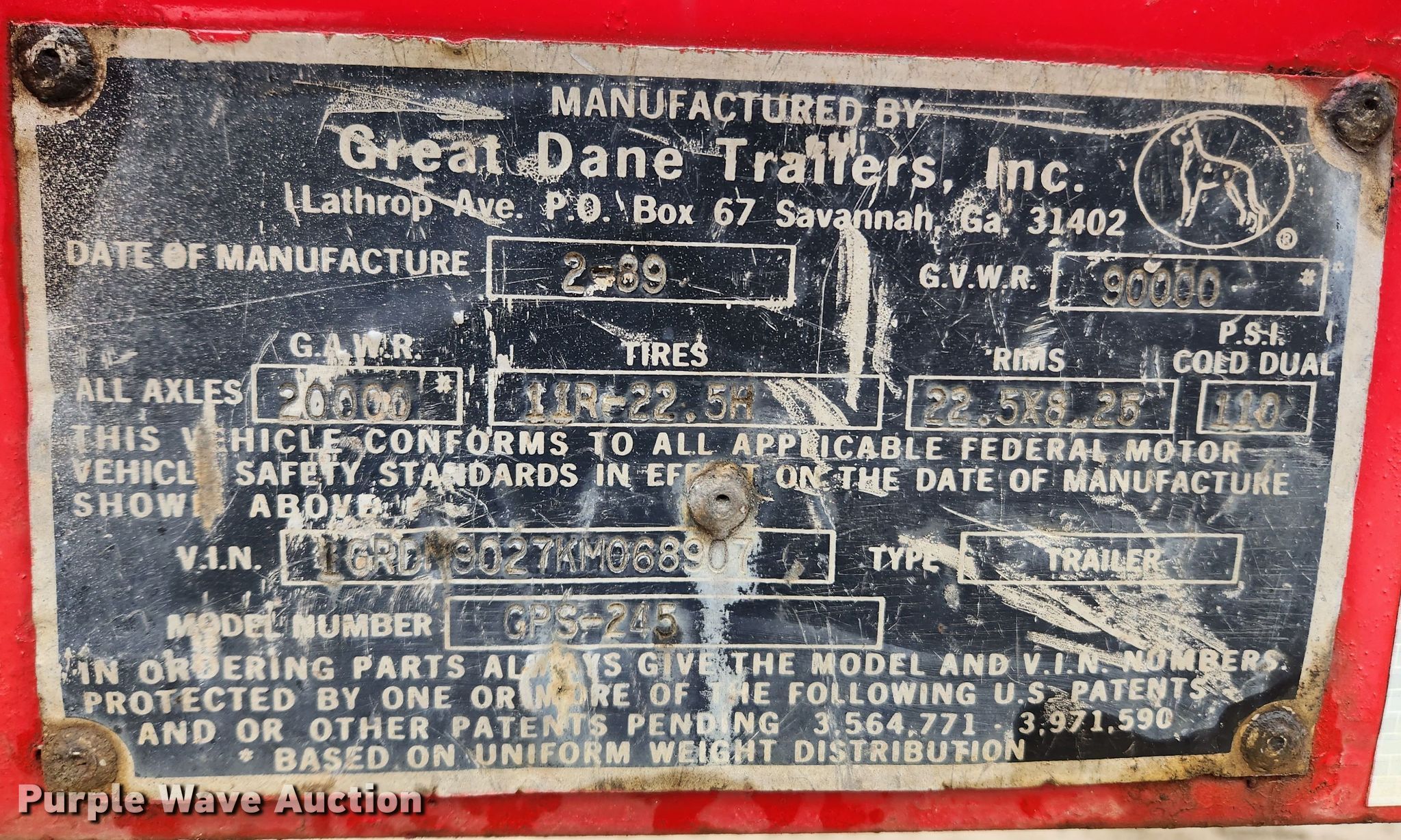 Purple Wave is selling a used Flat or Drop Deck Trailer in Missouri. This item is a 1989 Great Dane GPS-245 flatbed trailer with the following: VIN: 1GRDM9027KM068907