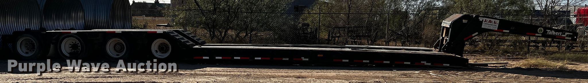 2013 Talbert lowboy equipment trailer. VIN: 40FSK5337D1032740, VIN: 40FAK0513D1032700. Dimensions Overall: 58' L x 102" W, Deck: 26' L x 102" W, Rear deck length: 19'. Features Deck type: Wood, Outriggers: Swing-out Board size: 12", Neck type: Detachable, Self-contained hydraulics. Chassis Suspension: Air, Brakes: Air, Axles: Triple, GVWR: 137,820 lbs, Pin-on axle. Tires Steel wheels, Size: 255/70R22.5. Trailer-Texas title. Title distribution may be delayed up to 30 days from verification of funds. Pin on axle -Transfer of ownership documentation will be a bill of sale. J.A.L. Contractors Retirement - Open inspection Dec. 28. 2122 Lamesa Highway. Big Spring, TX 79720