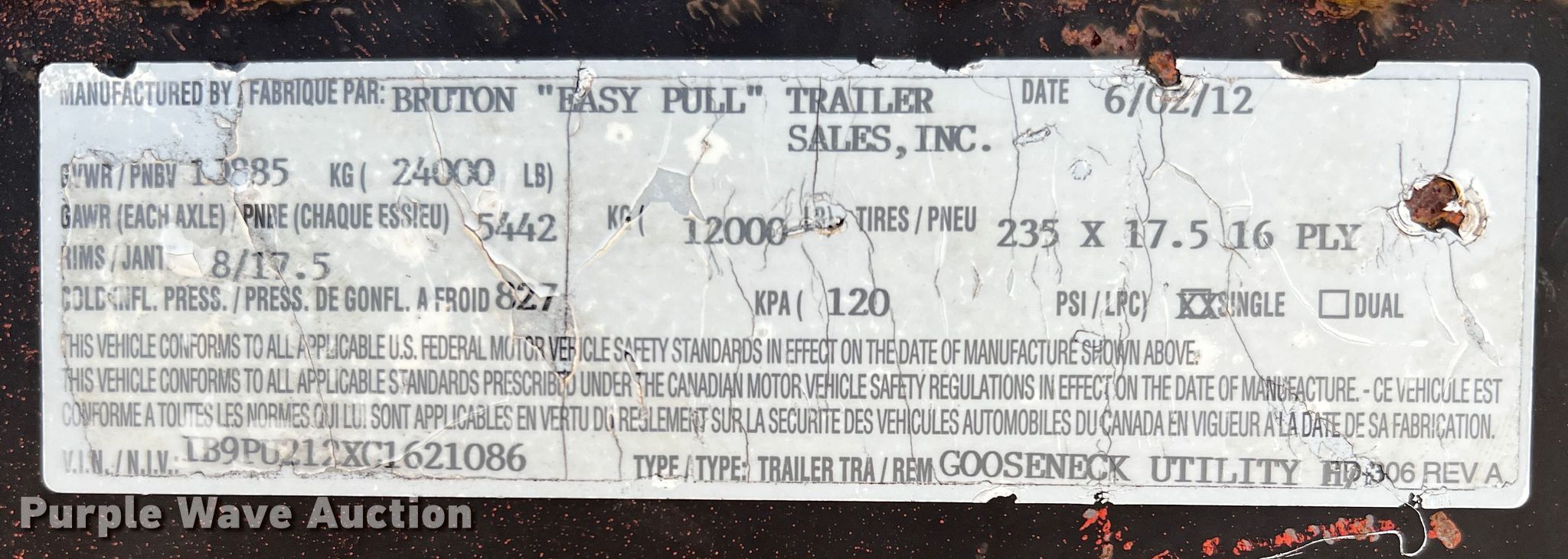 Purple Wave is selling a used Equip. Trailer in Texas. This item is a 2012 Bruton equipment trailer with the following: VIN: 1B9PU212XC1621086