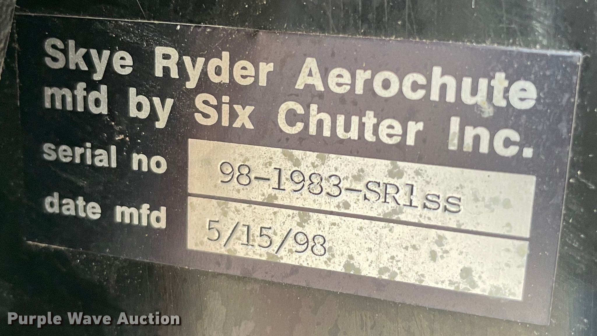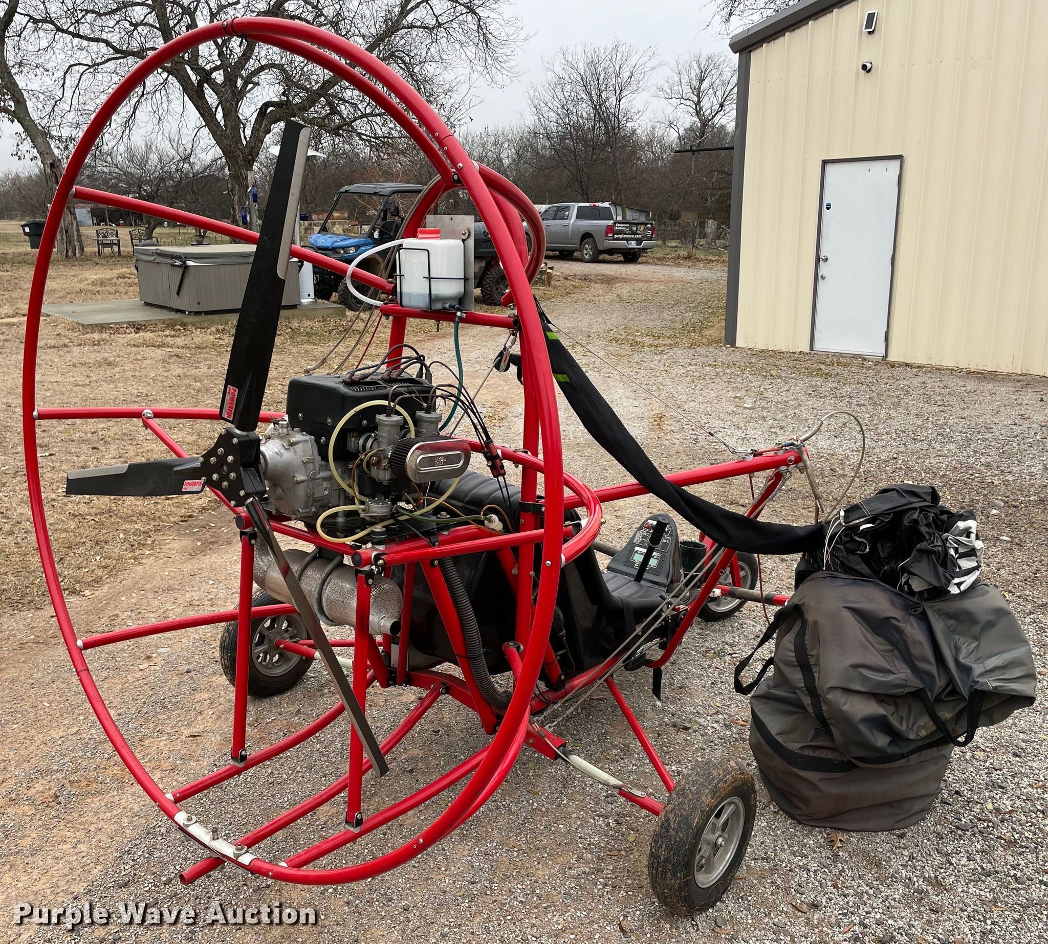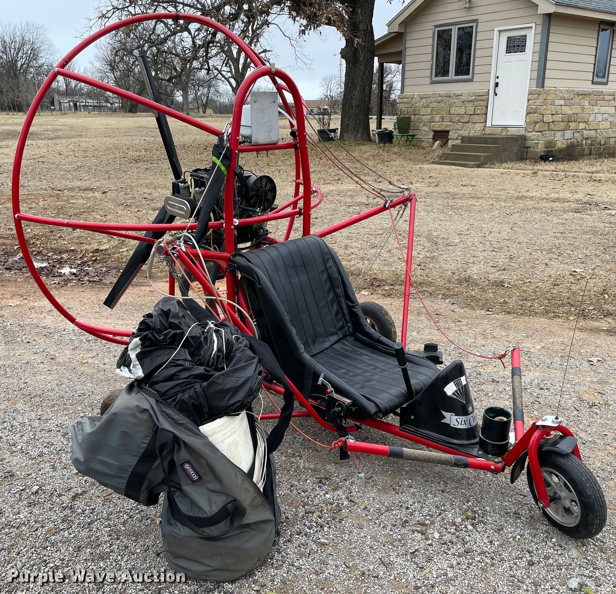 Purple Wave is selling a used Aircraft in Oklahoma. This item is a 1998 Six Chuter Skye Ryder Aerochute power parachute with the following: Hours: 119 on meter, Serial: 98-1983-SR1S, Two cylinder gas engine, Parachute, 26" propeller blades, Helmet, Garmin GPS, 3.00-8 front tire, 4.80/4.00-8 rear tires