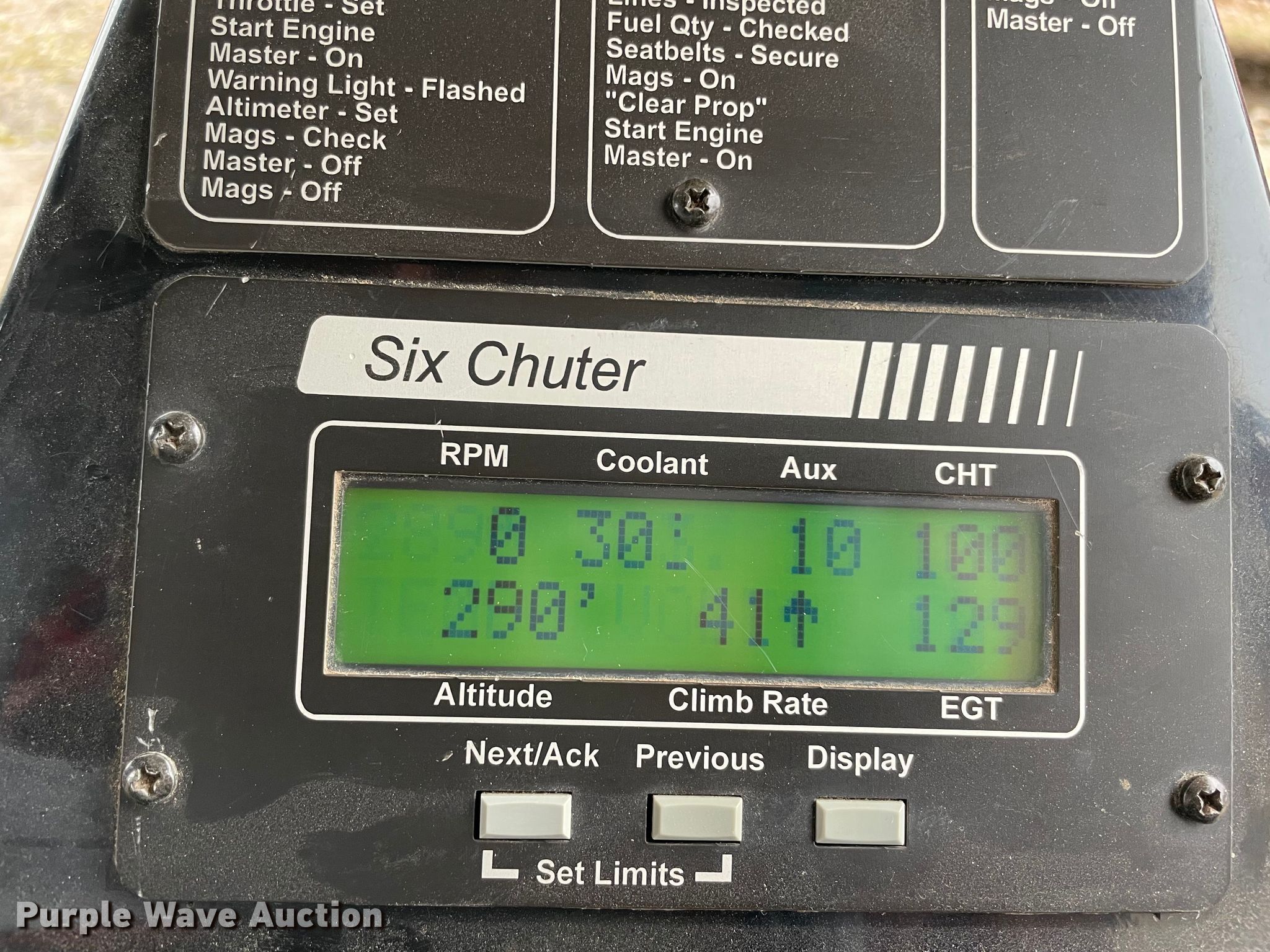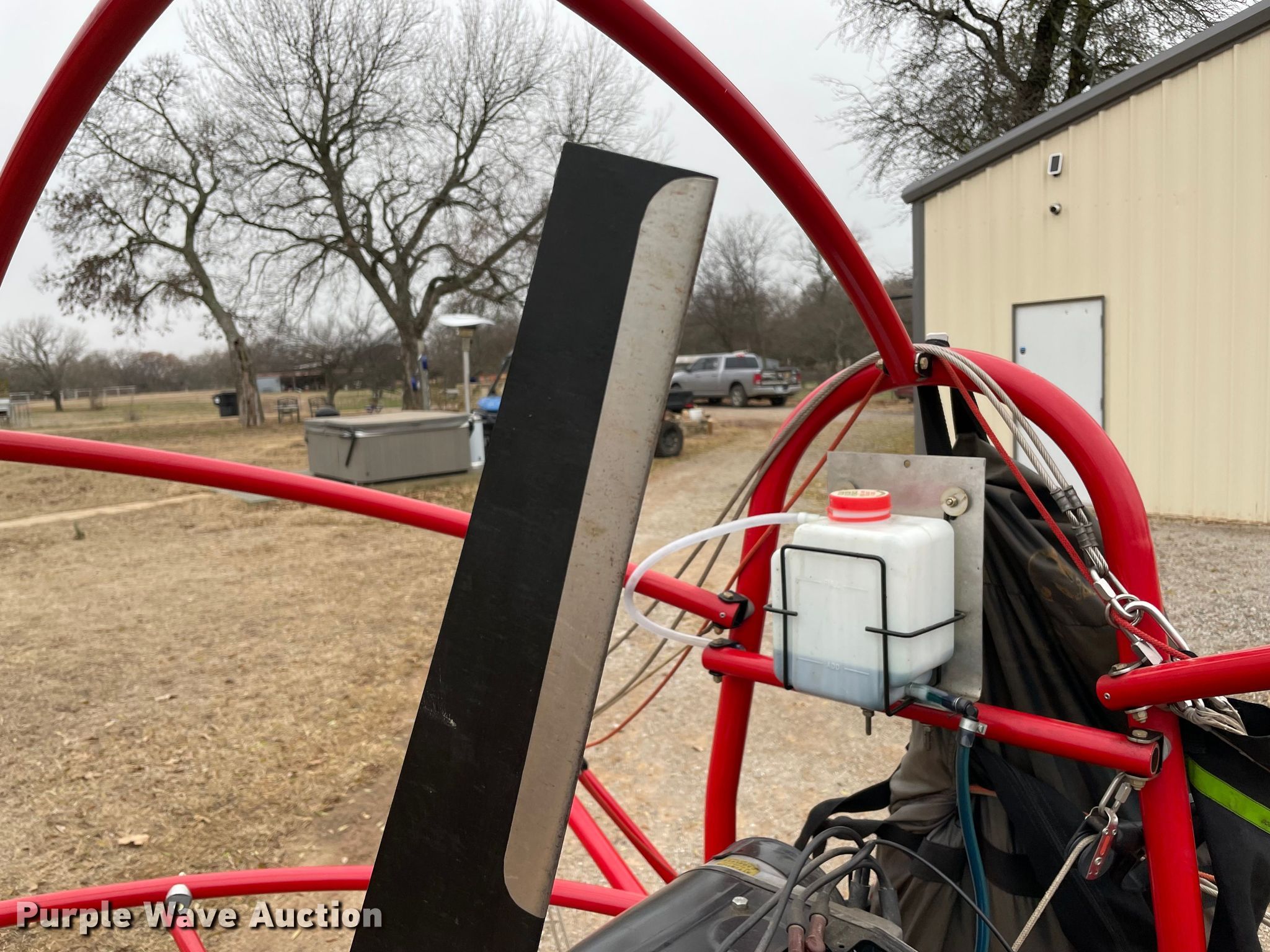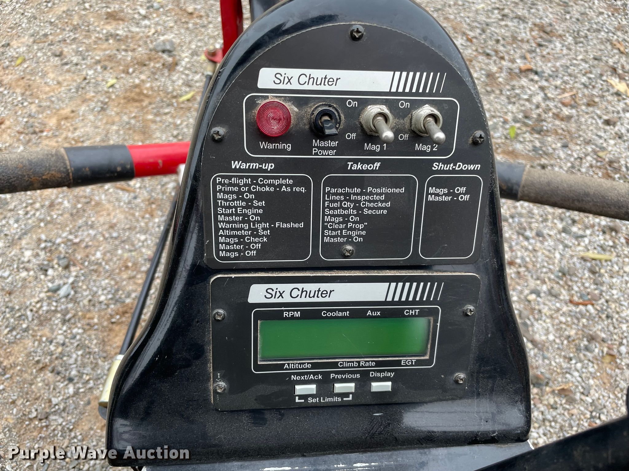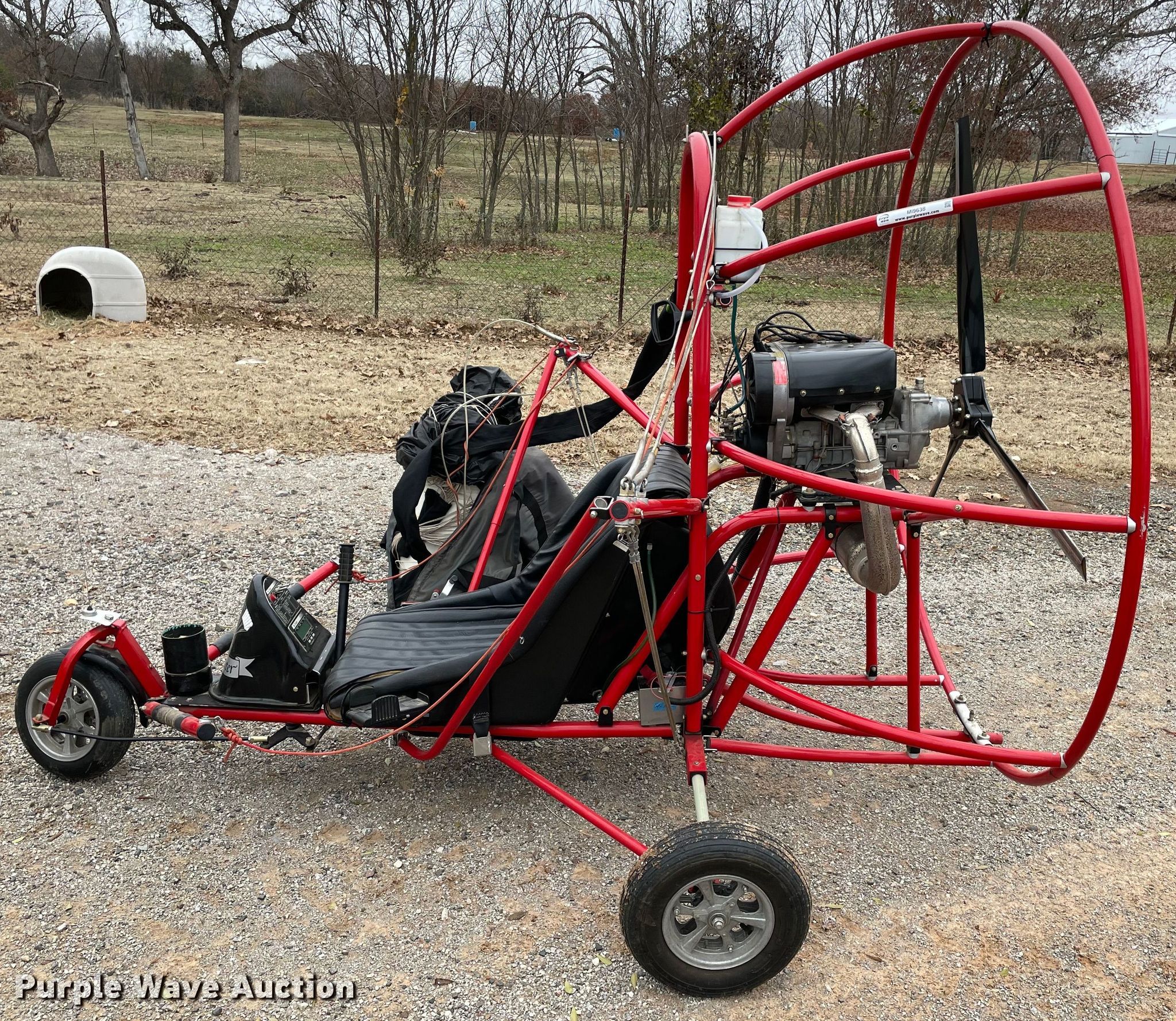 Purple Wave is selling a used Aircraft in Oklahoma. This item is a 1998 Six Chuter Skye Ryder Aerochute power parachute with the following: Hours: 119 on meter, Serial: 98-1983-SR1S, Two cylinder gas engine, Parachute, 26" propeller blades, Helmet, Garmin GPS, 3.00-8 front tire, 4.80/4.00-8 rear tires