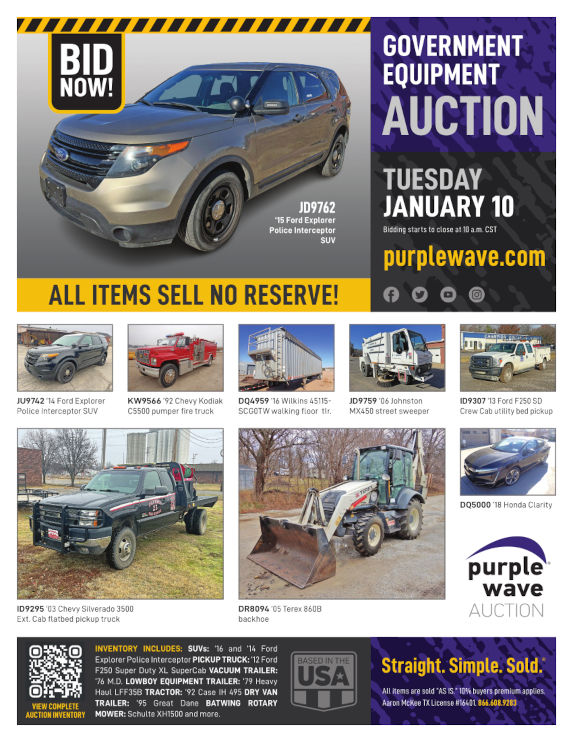 This auction is conducted by Purple Wave, Inc., whose home office is 825 Levee Drive, Manhattan, Kansas. Aaron McKee, Texas auctioneer license # 16401, operates Purple Wave, Inc. Complaints against us may be directed to the Texas Department of Licensing and Regulation, P.O. Box 12157, Austin, Texas 78711, (512) 463-6599. For additional required information, see the attached document.
