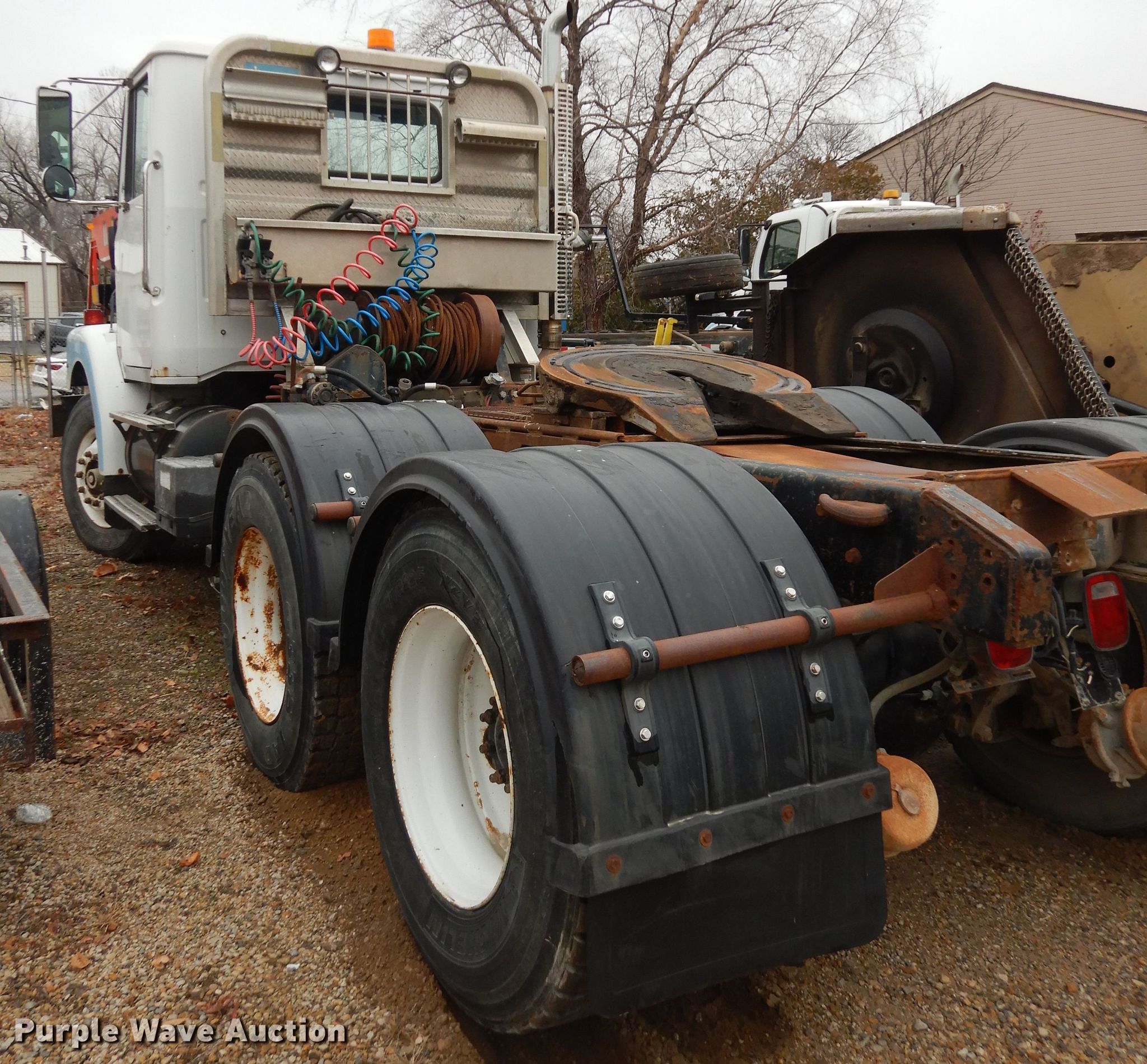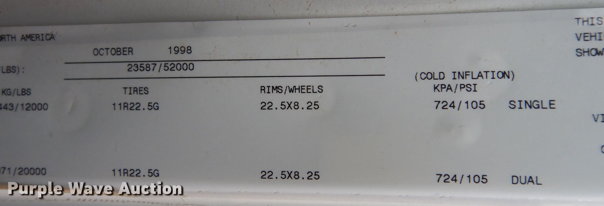 1999 Volvo WG semi truck. Miles: 76,587 on odometer, VIN: 4VHJCBHE8XN867086, Unit #: 307. Engine Volvo VE D7, Displacement: 6.7L, Cylinders: 6, Fuel type: Diesel. Transmission Eaton Fuller, Manual, Speed: 10. Chassis Axles: Tandem, Suspension: Spring over walking beam, Brakes: Air, Truck chassis: 14' 2", GVWR: 52,000 lbs FAWR: 12,000 lbs, RAWR: 20,000 lbs, Wheelbase: 170". Interior AC, Heat, Cruise control. Features Deck plate: Steel, Winch Koenig 46120LMU30B, Capacity: 30,000 lbs, Fifth wheel type: Air operated, Sliding, Fuel tank: Dual. Tires Size: 11R22.5. Notes Dash warning indicator: Check engine, Non-operational brakes. Kansas title. Seller is a government entity who will be assigning and distributing the title. Please contact the seller for distribution questions. City of Lawrence. 1141 Haskell Ave. Lawrence, KS 66044