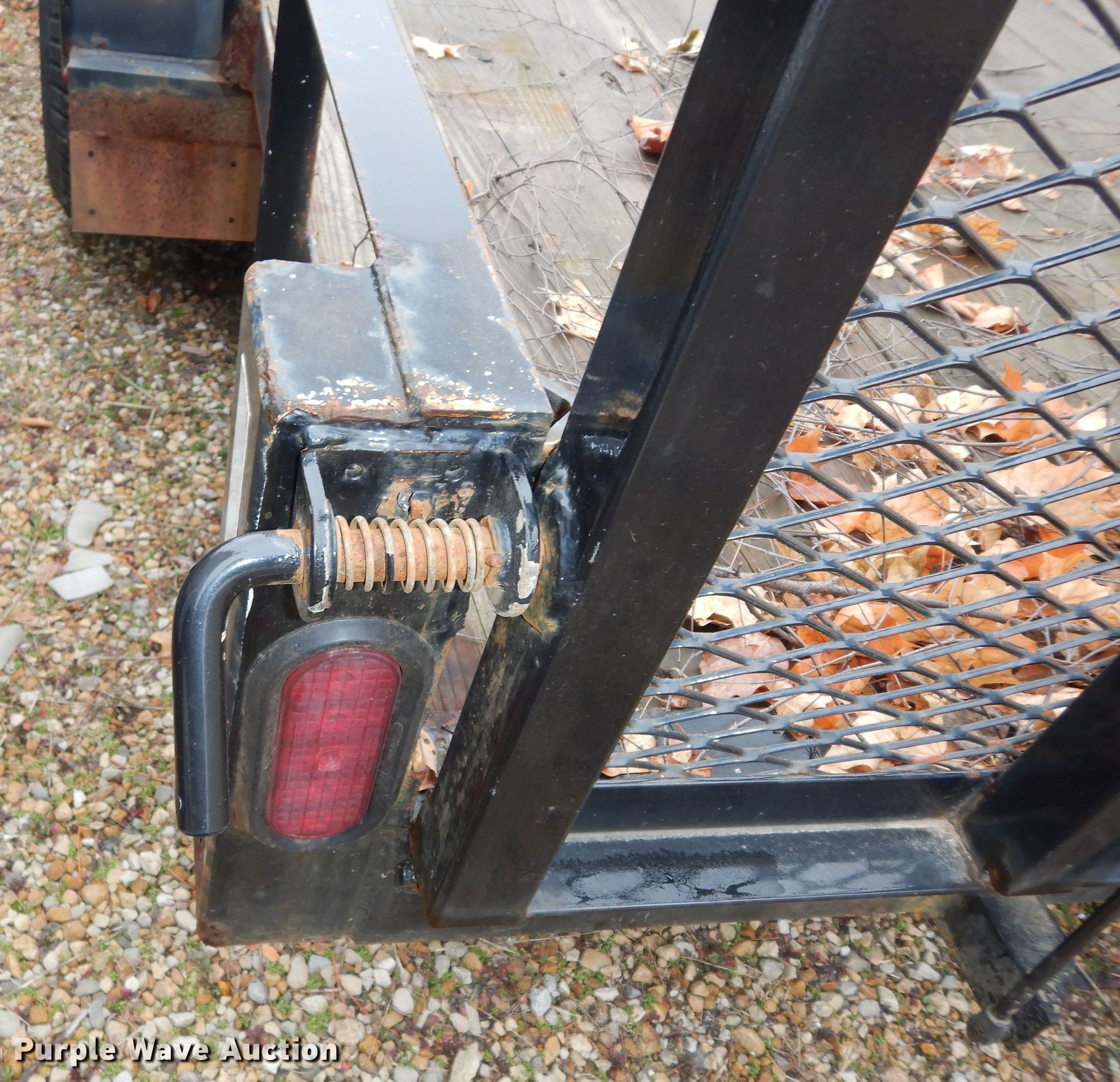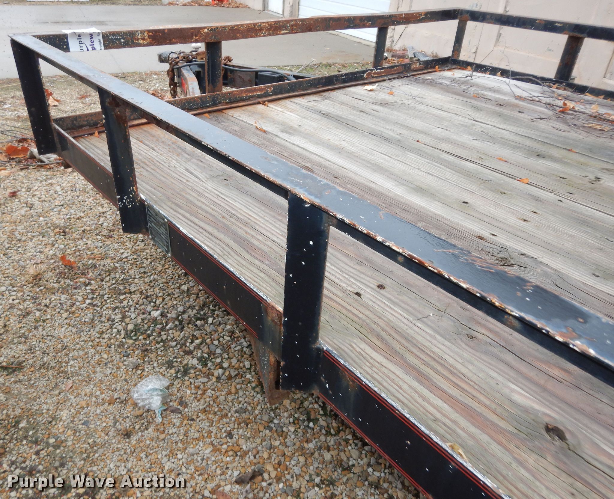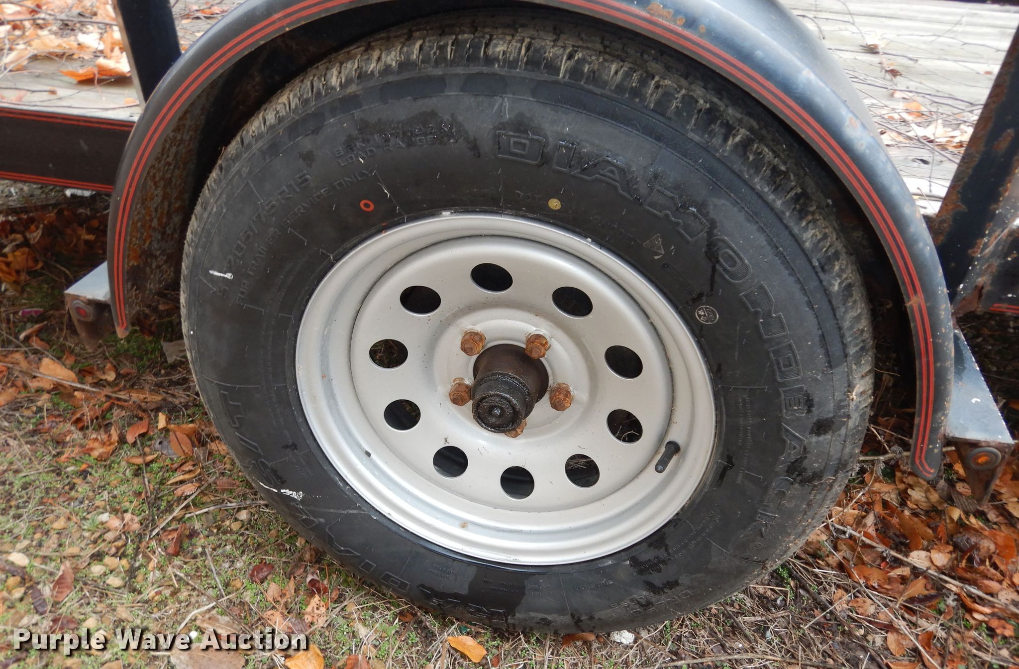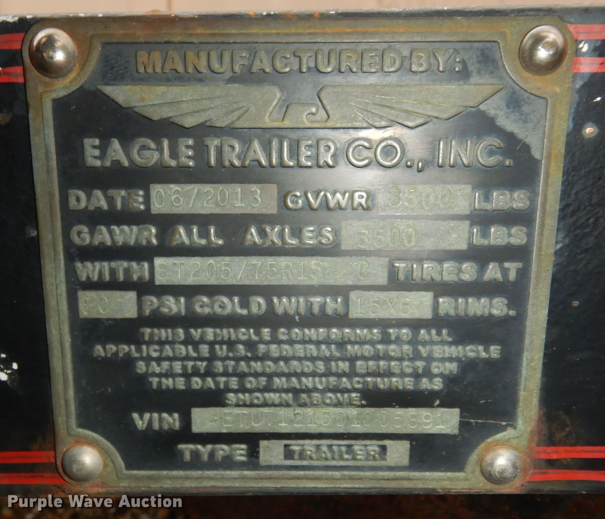 2013 Eagle utility trailer. VIN: 4ETU71215D1005891. Dimensions Overall: 16' 6" L x 8' 4" W, Deck: 12' 3" L x 6' 9" W, Side height: 11", Ramps: Manual Length: 4'. Features Deck type: Wood. Chassis Ball hitch: 2", Landing gear: Single, Suspension: Spring, GVWR: 3,500 lbs, GAWR: 3,500 lbs. Tires Steel wheels, Size: 205/75R15. Kansas title. Title distribution may be delayed up to 14 days from verification of funds. City of Lawrence. 1141 Haskell Ave. Lawrence, KS 66044