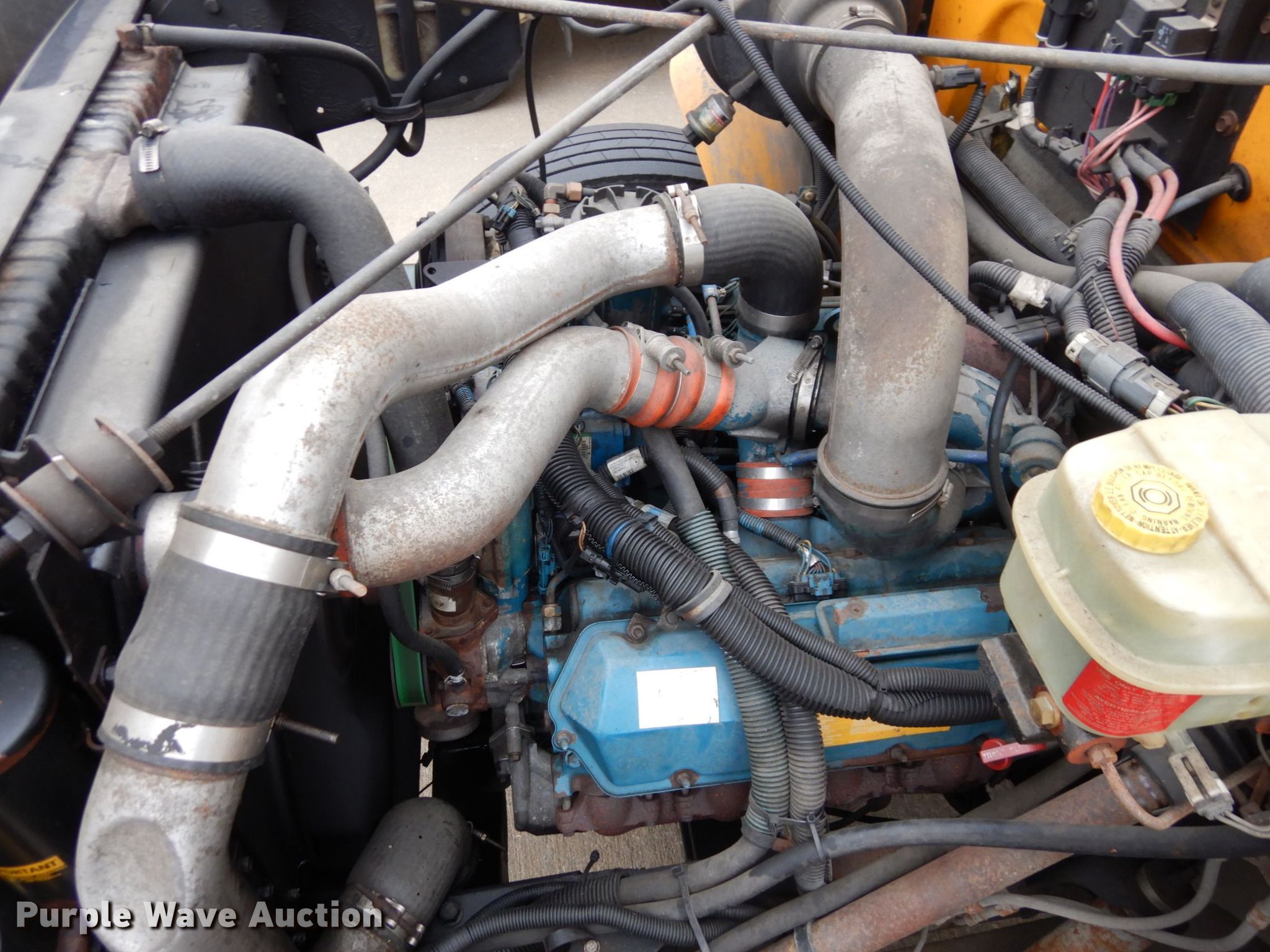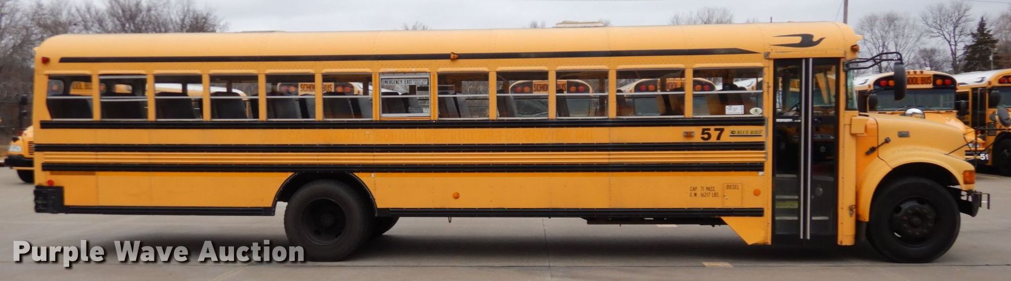 2003 Blue Bird school bus. Miles: 125,067 on odometer, Hours: 9,471 on meter, VIN: 4DRBBABP83B956558. Engine International T444E, Displacement: 7.3L, Cylinders: 8, Fuel type: Diesel. Transmission Automatic. Chassis Axles: Single, Suspension: Spring, Brakes: Hydraulic, GVWR: 29,800 lbs. Interior Heat, Heated mirrors, Cruise control, Passengers: 71. Tires Size: 11R22.5. Missouri title. Title distribution may be delayed up to 14 days from verification of funds. Grandview Consolidated School District #4. 13208 Park Hills Dr. Grandview, MO 64030
