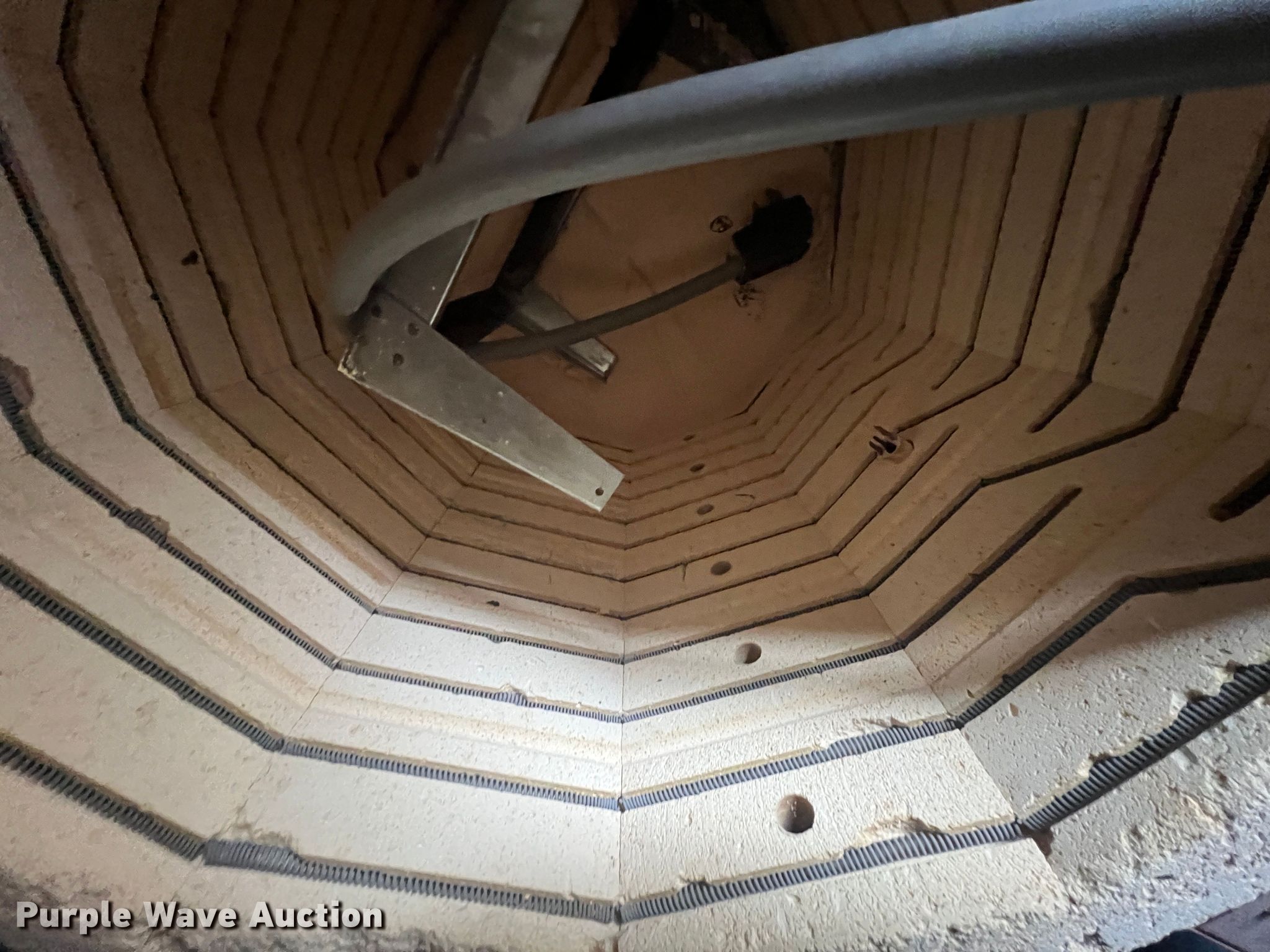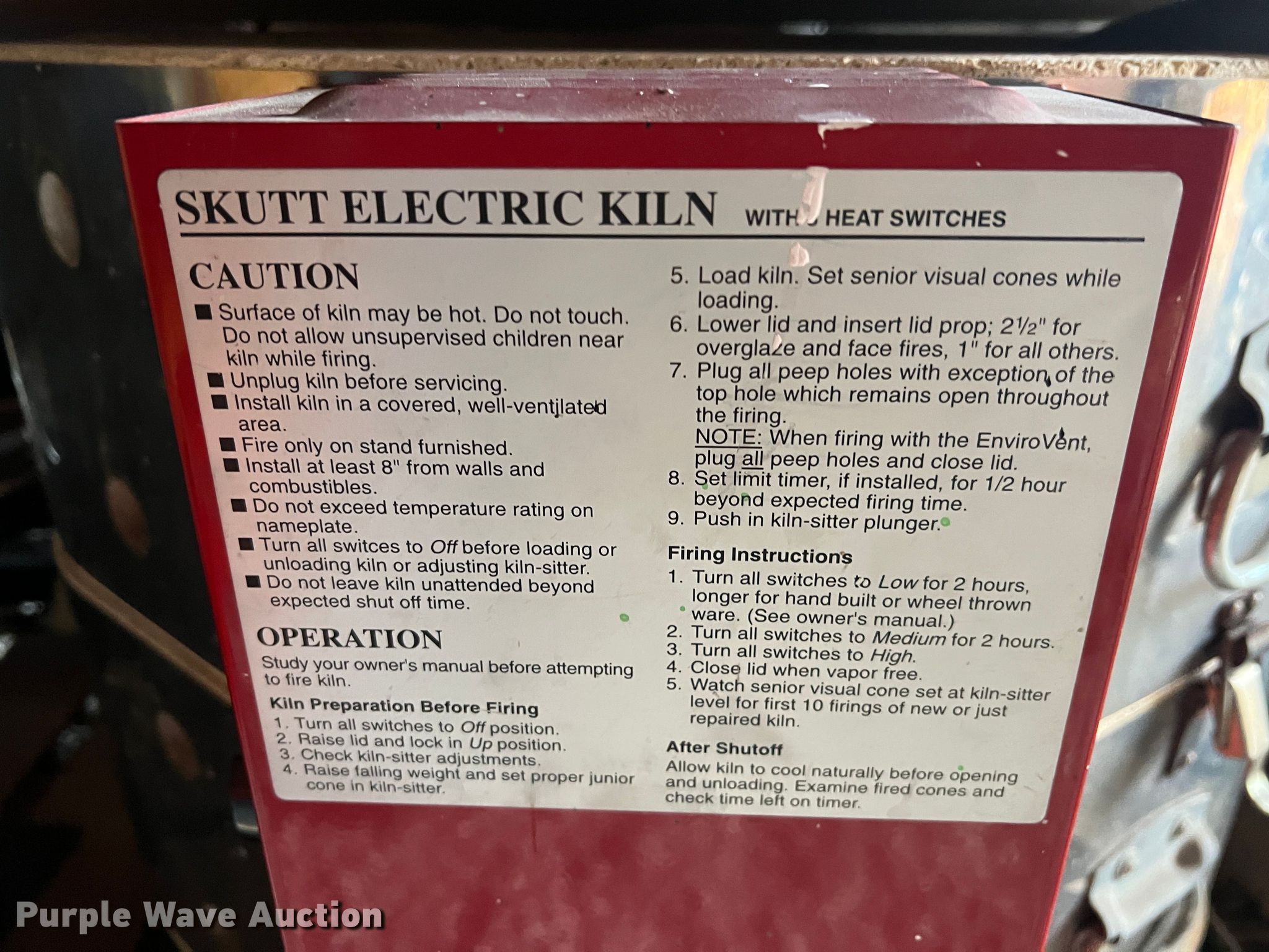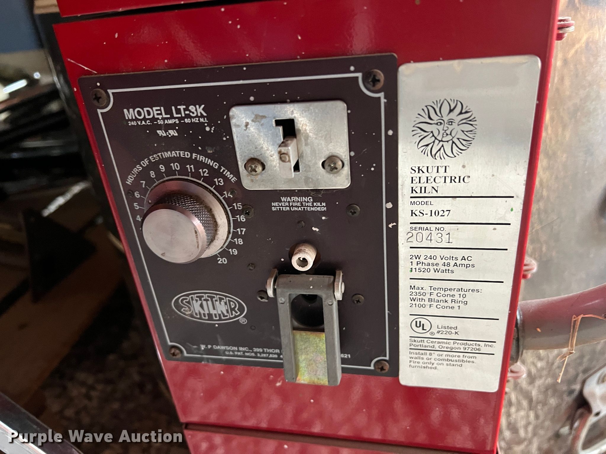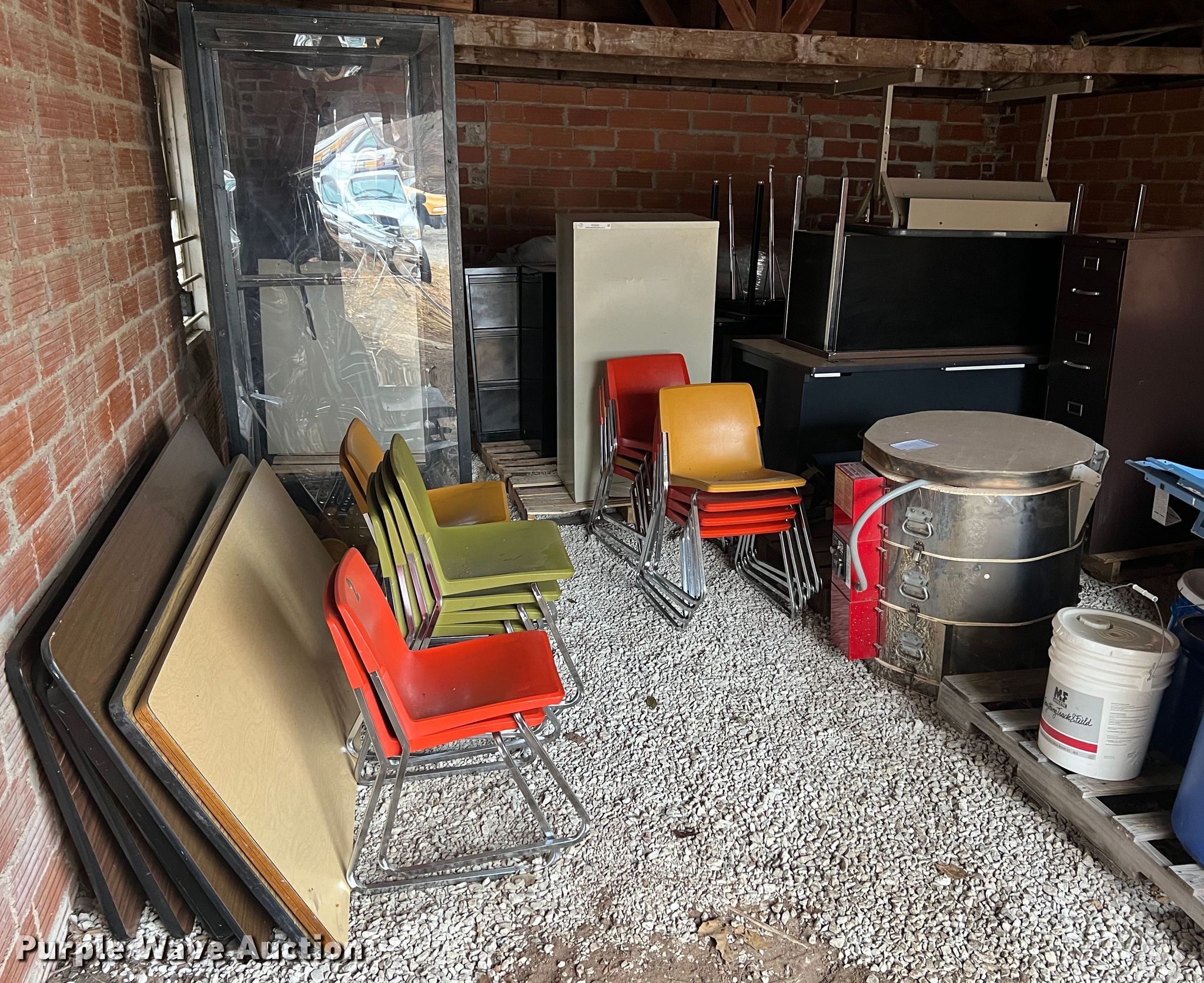Purple Wave is selling a used Office Supplies and Equip. in Kansas. This item is a Office supplies and equipment with the following: (19) chairs, (10) tables, (5) filing cabinets, (2) desks, Skutt LT-3K electric kiln, Single phase, Cracked brick, Unknown operating condition