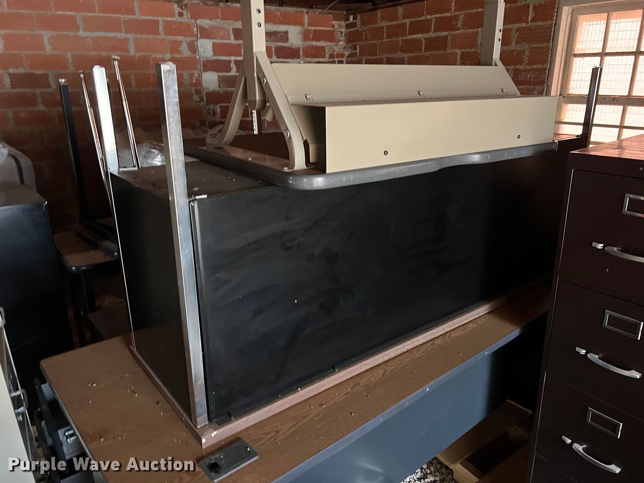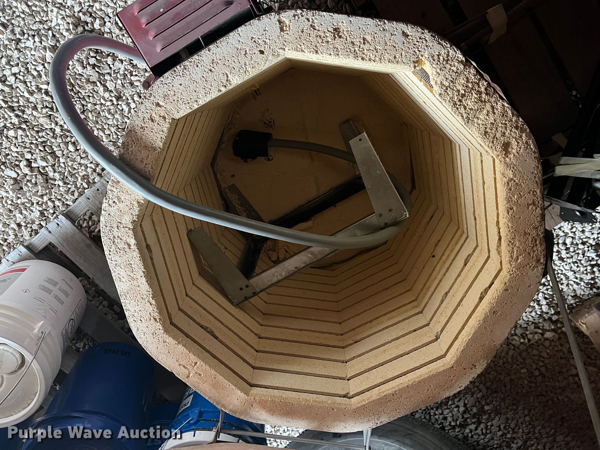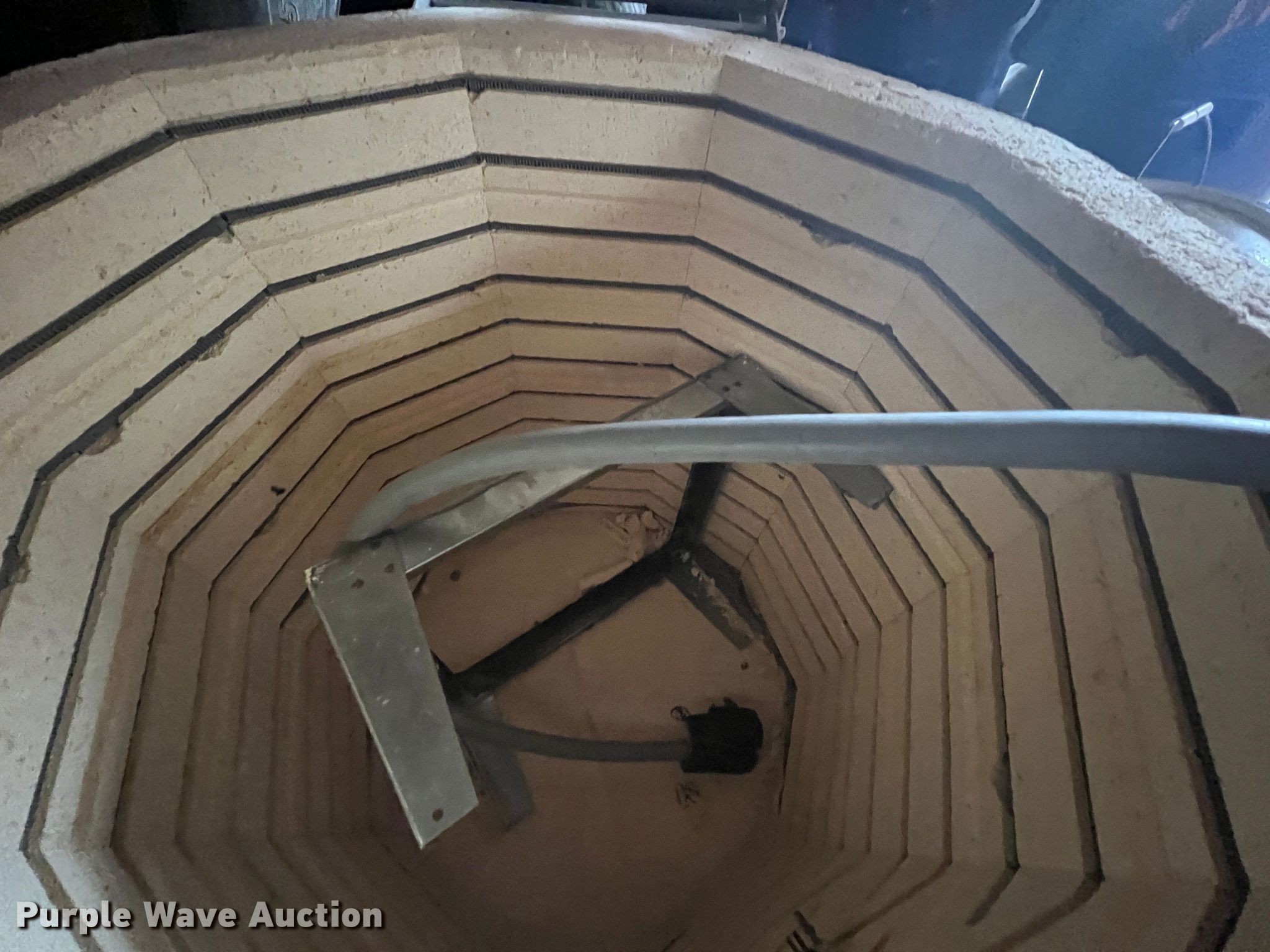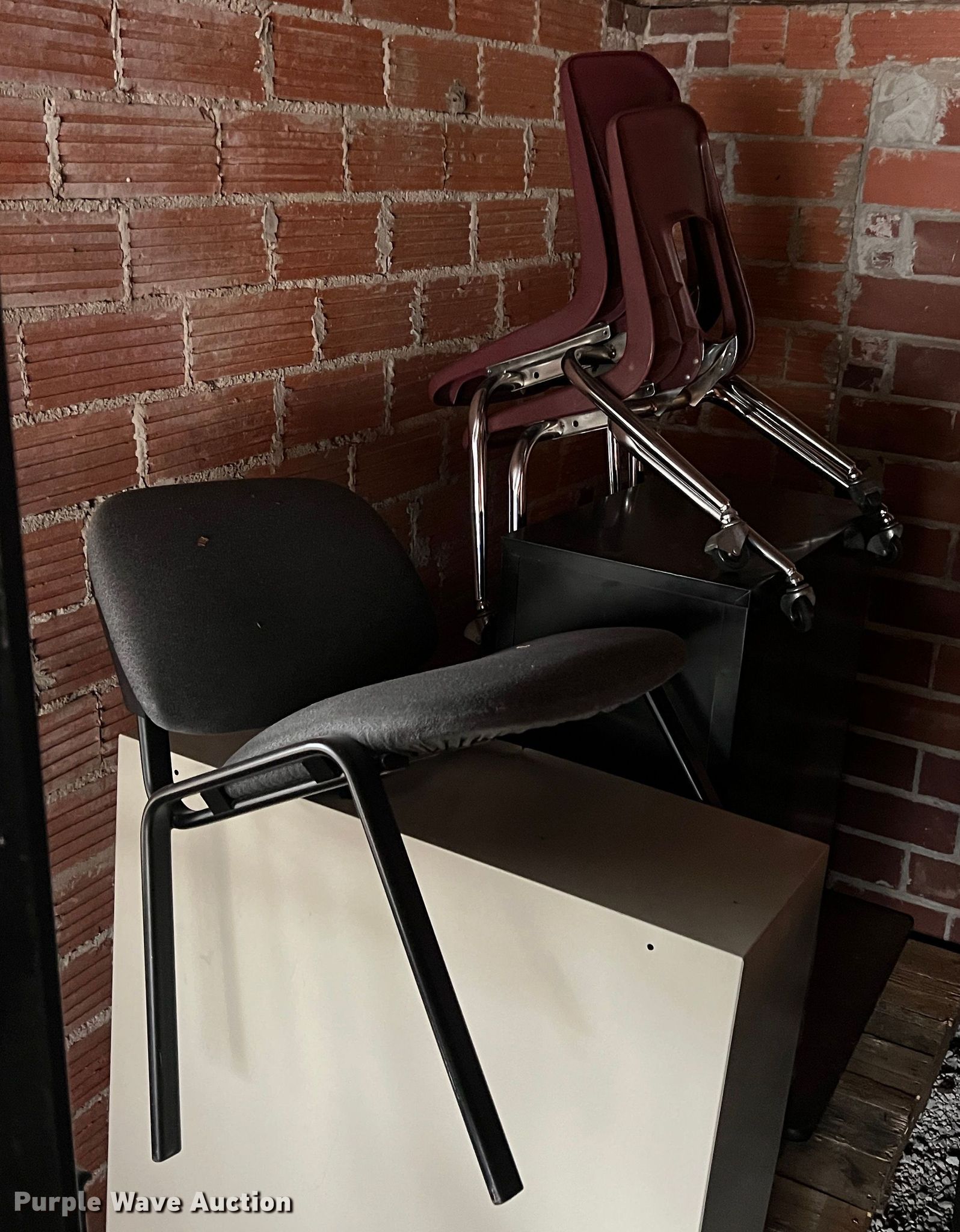 Purple Wave is selling a used Office Supplies and Equip. in Kansas. This item is a Office supplies and equipment with the following: (19) chairs, (10) tables, (5) filing cabinets, (2) desks, Skutt LT-3K electric kiln, Single phase, Cracked brick, Unknown operating condition