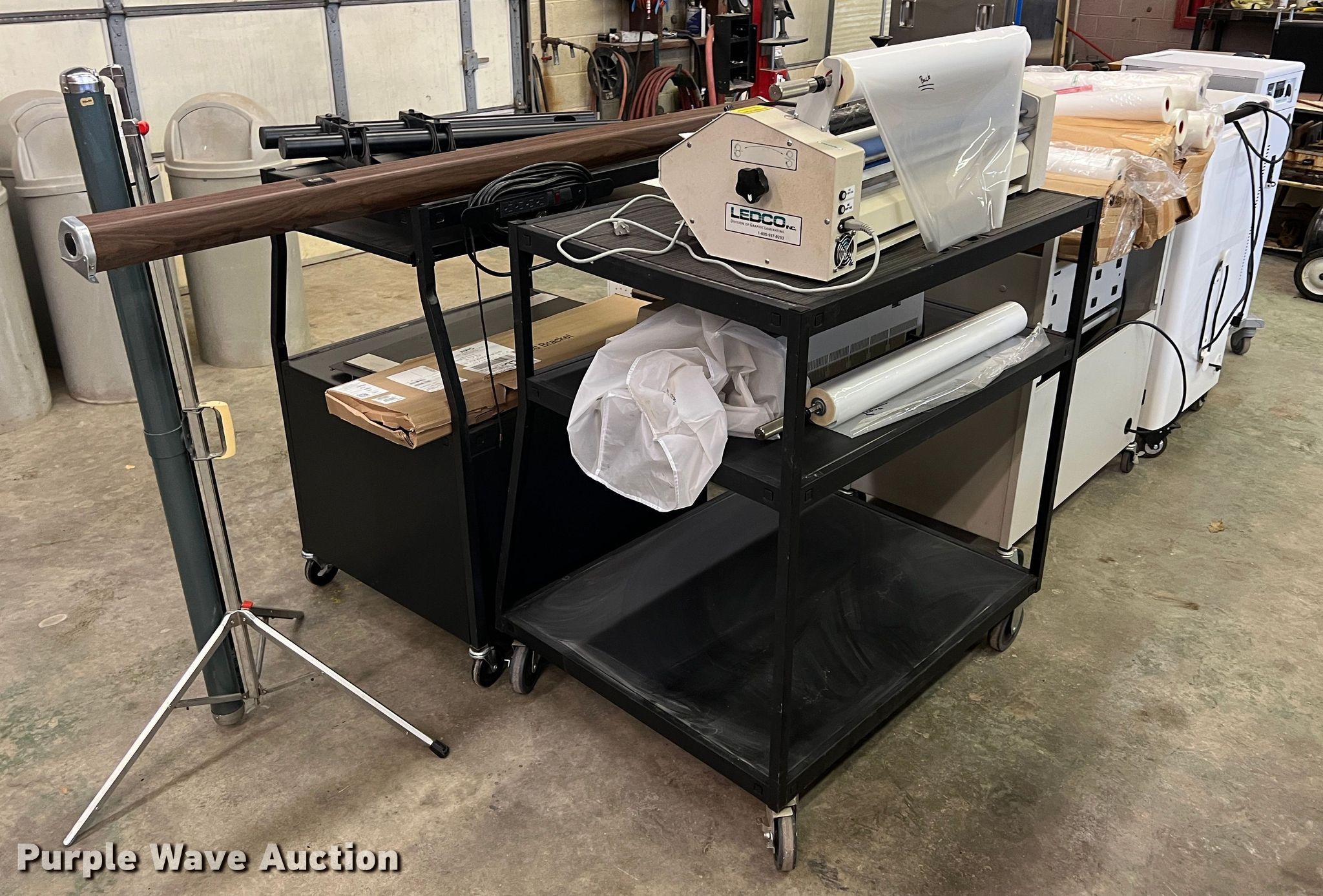 Purple Wave is selling a used Office Supplies and Equip. in Kansas. This item is a Office supplies and equipment with the following: (4) laptop charging carts, (2) laminating machines, (2) television carts, (2) projector screens, Typewriter