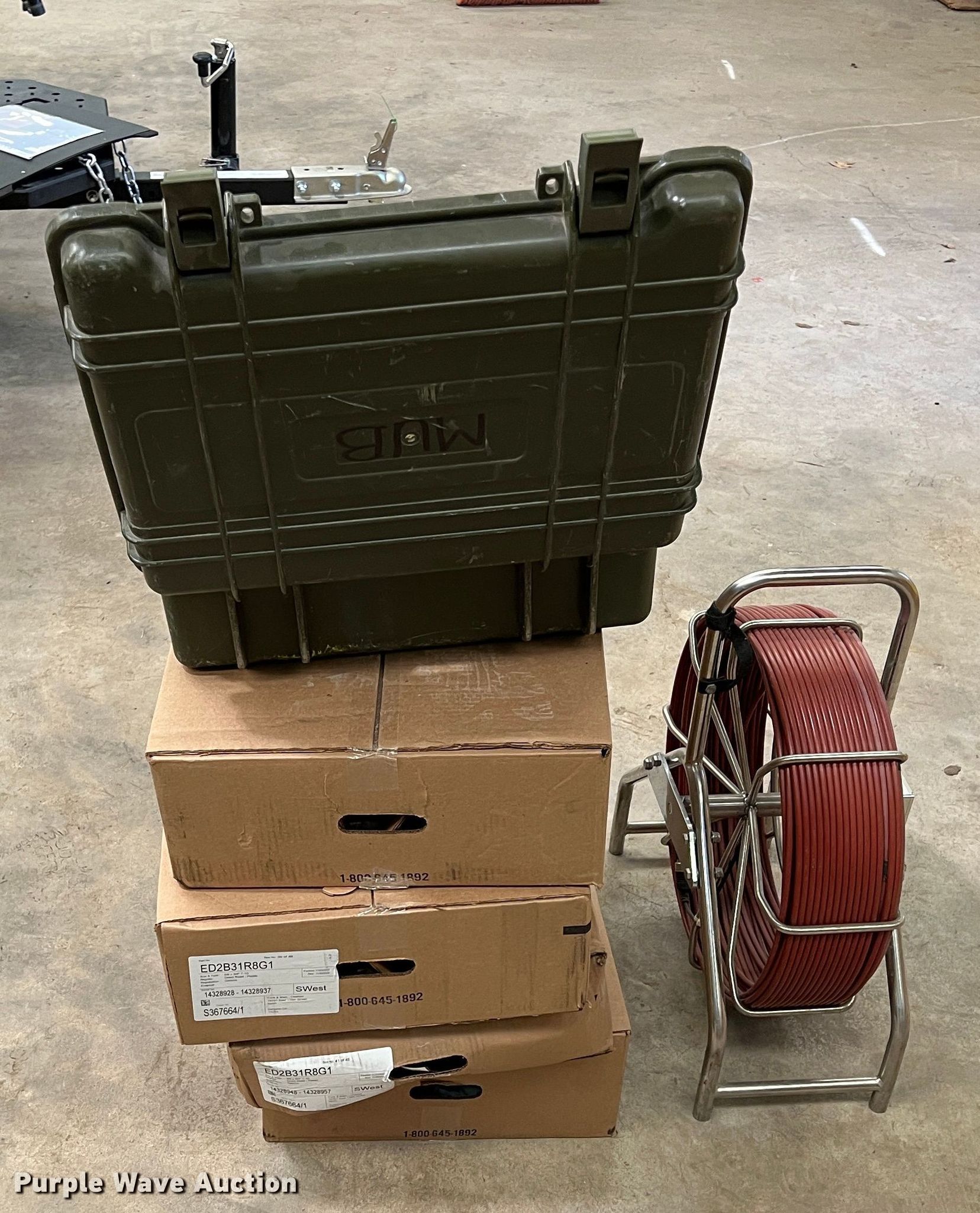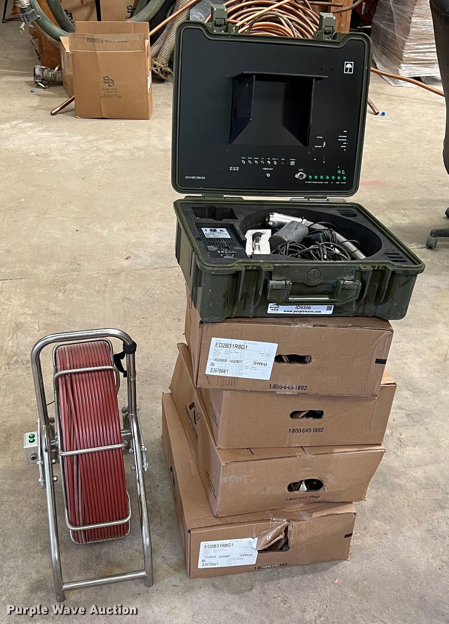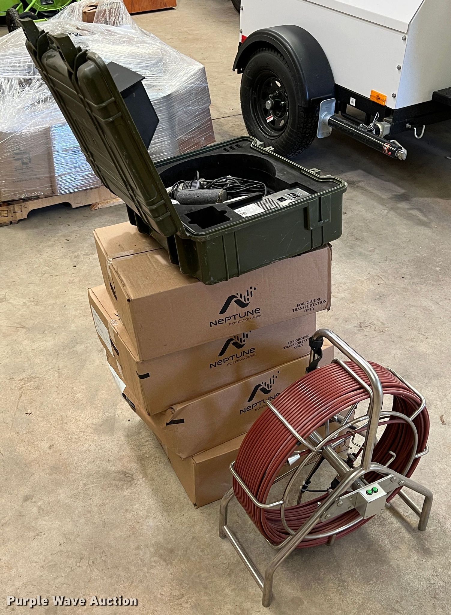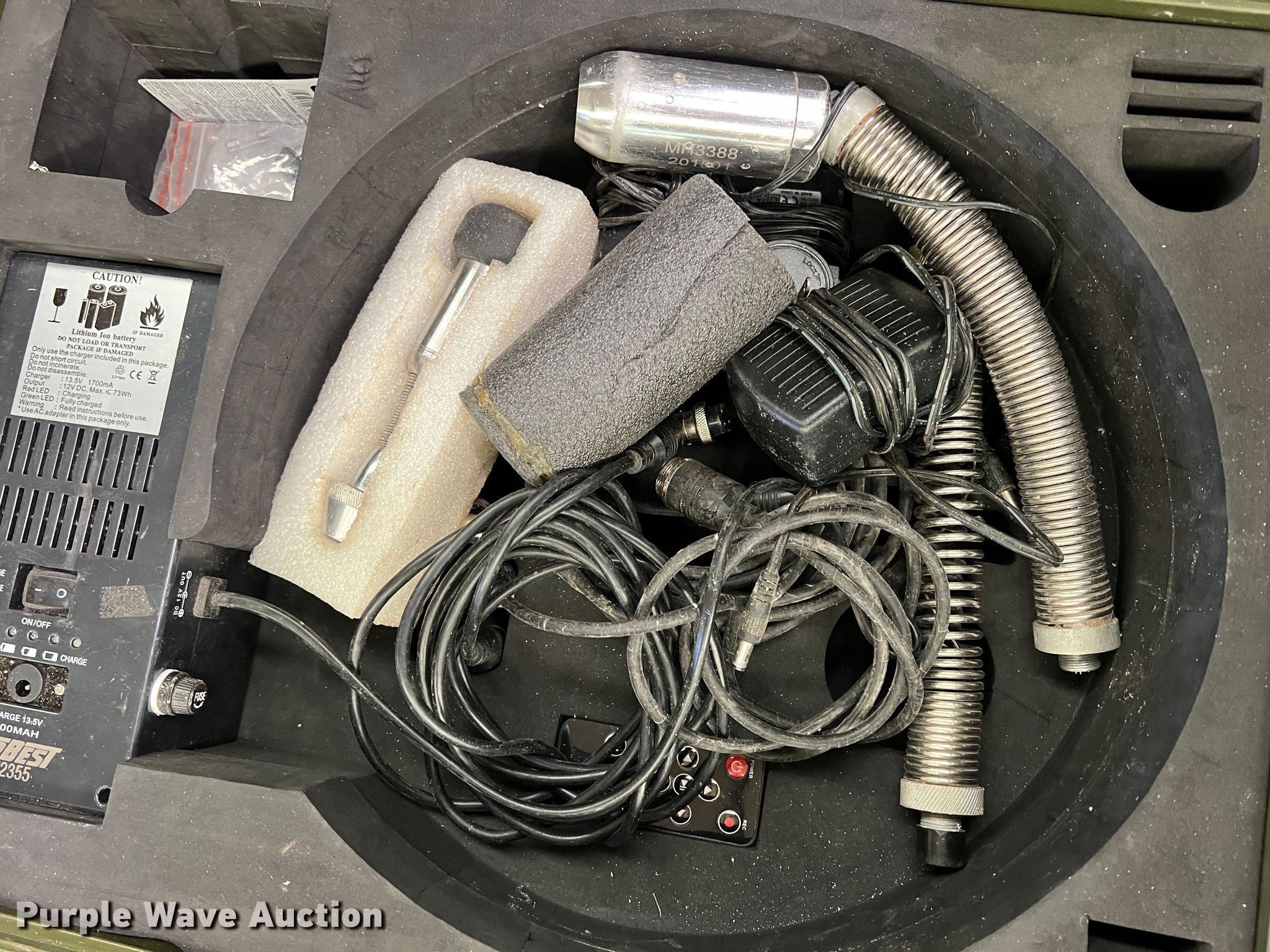 Purple Wave is selling a used Tools in Oklahoma. This item is a Forbest sewer camera with the following: 13.5V charge, 6,600 mAh, Sewer rodder reel with camera head, Spring connectors, Case with display screen