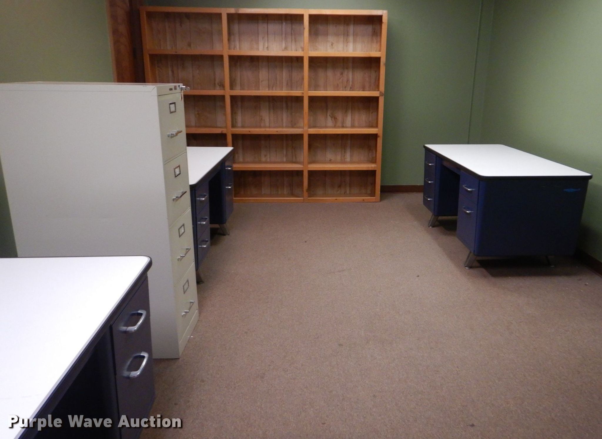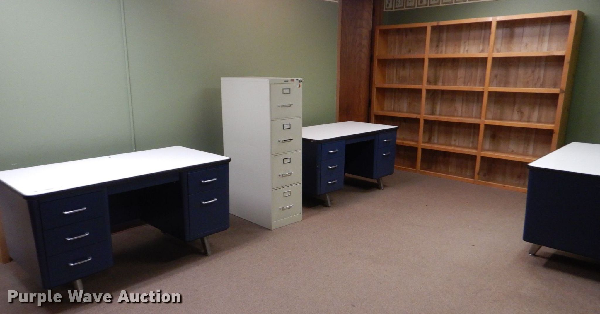 Purple Wave is selling a used Furniture in Oklahoma. This item is a Furniture with the following: (3) metal desks, File cabinet, Bookshelf