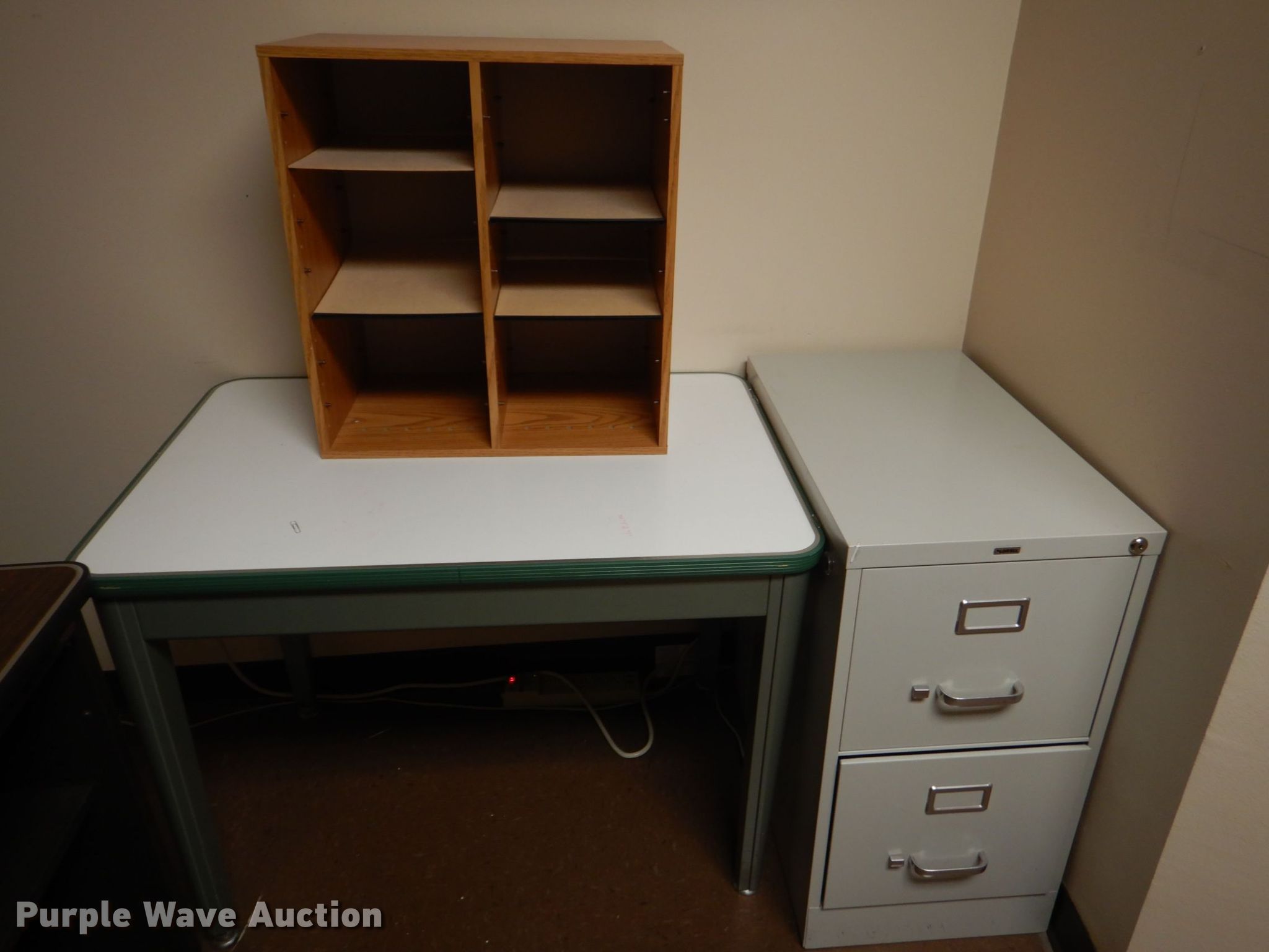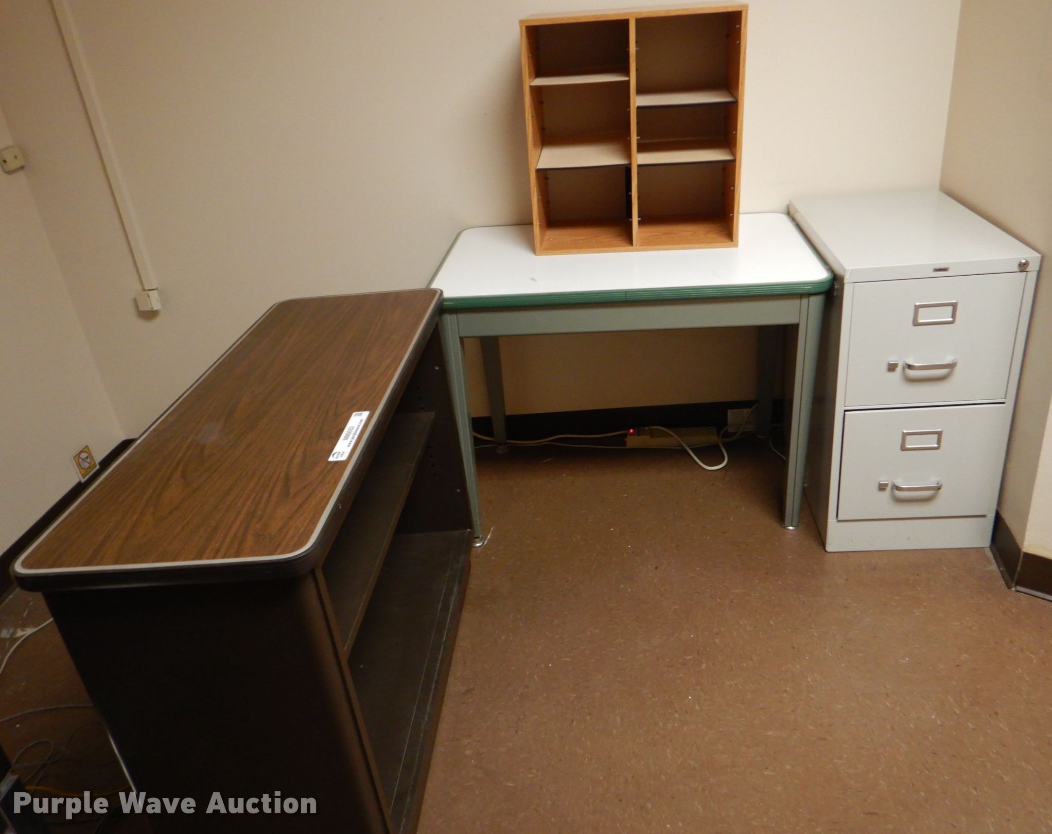 Purple Wave is selling a used Furniture in Oklahoma. This item is a Furniture with the following: Table, File cabinet, (2) shelves