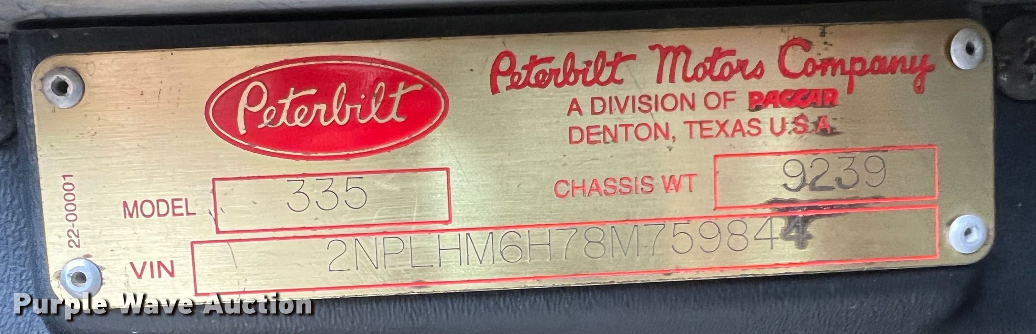 2008 Peterbilt 335 rollback truck. Miles: 318,156 on odometer, Hours: 14,467 on meter, VIN: 2NPLHM6H78M759844. Engine Paccar PX-6, Serial: 46782167, Displacement: 6.7L, Cylinders: 6, Fuel type: Diesel, HP: 300. Transmission Automatic. Chassis Axles: Single, Suspension: Air, Brakes: Hydraulic, PTO, GVWR: 26,000 lbs. Interior AC, Heat, Heated mirrors, Cruise control. Features Rollback bed CTEMI 20-2SA, Serial: 7090199, 22' 4" L x 96" W, Ram: Double, Winch. Tires Size: 245/70R19.5. Missouri title. Title distribution may be delayed up to 14 days from verification of funds. 5172 County Road 456. Tebbetts, MO 65080