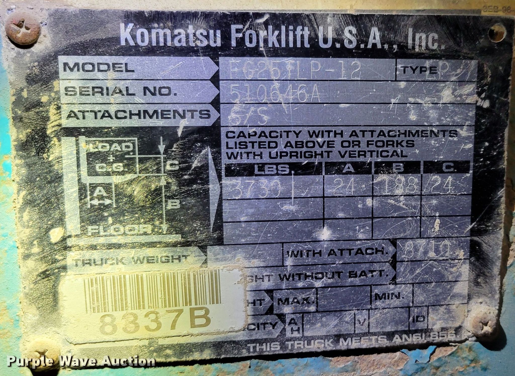 Purple Wave is selling a used Warehouse Forklift in Missouri. This item is a Komatsu FG25TLP-12 forklift with the following: Hours: 4,224 on meter, Serial: 510646A