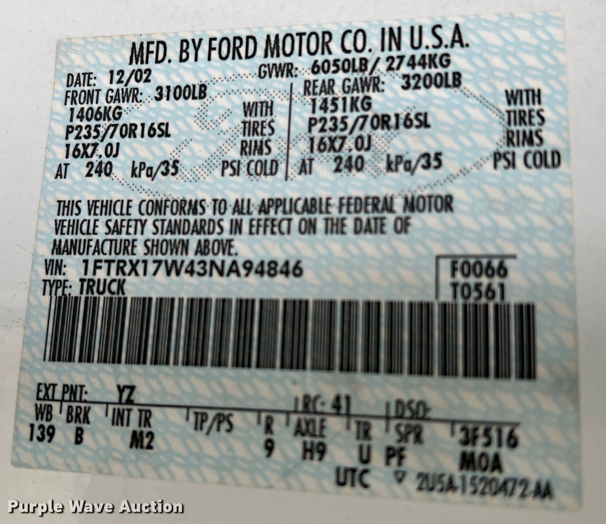 Purple Wave is selling a used 1/2 Ton Pickup or Van in Texas. This item is a 2003 Ford F150 SuperCab pickup truck with the following: Miles: 258,076 on odometer, VIN: 1FTRX17W43NA94846