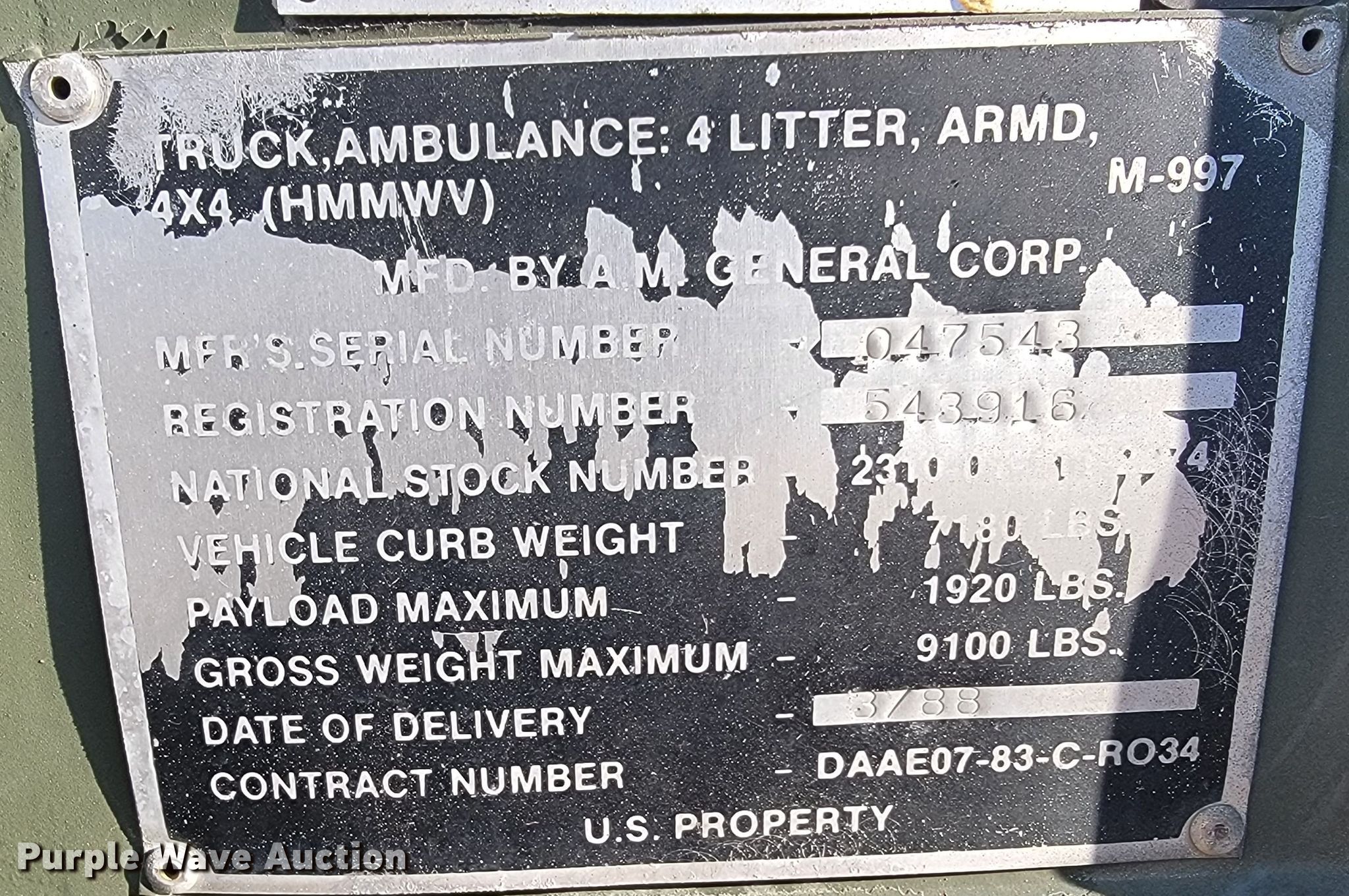 1988 Am General Humvee. Miles: 12,635 on odometer, VIN: 047543. Engine Displacement: 6.2L, Cylinders: 8, Fuel type: Diesel. Transmission Automatic, Four wheel drive. Interior AC, Heat. Features Ambulance body 9' L x 7' W. Tires Size: 37x12.50R16.5. Notes Windshield chipped or cracked, Non-operational AC. International bidders restricted from bidding. Oklahoma classic title. Title distribution may be delayed up to 14 days from verification of funds. Sundance Equipment & Truck Sales. Tulsa, OK 74114