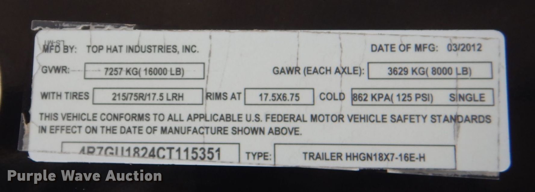 Purple Wave is selling a used Equip. Trailer in Arkansas. This item is a 2012 Top Hat HHGN18X7-16E-H equipment trailer with the following: VIN: 4R7GU1824CT115351, Unit #: 181