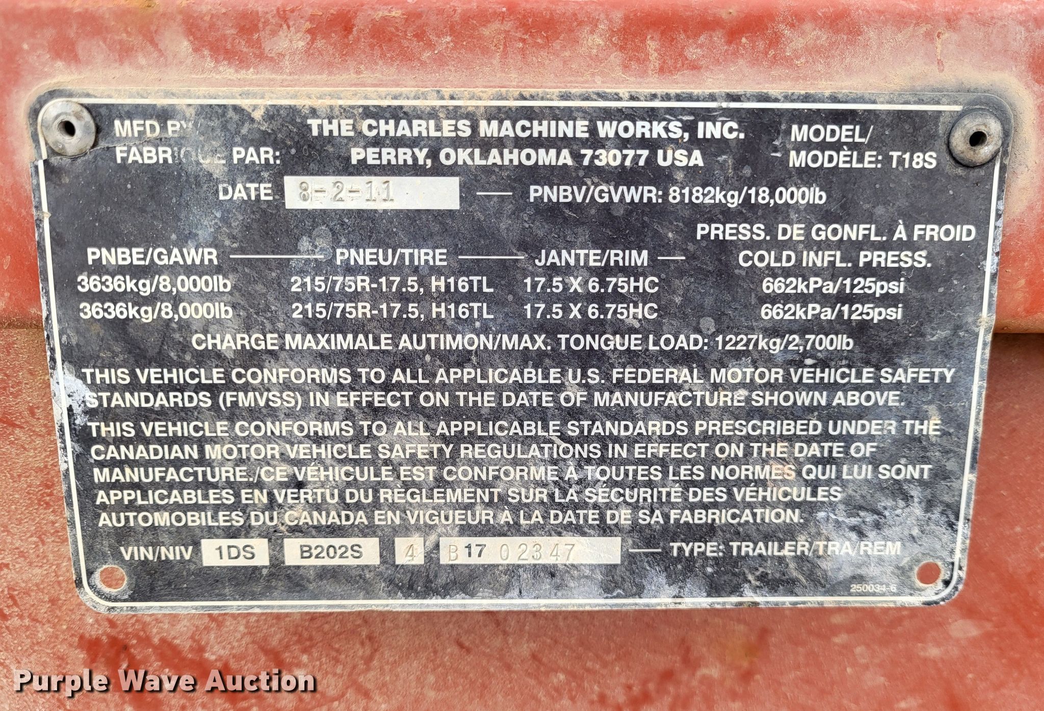 2011 Ditch Witch FX30 vacuum excavator. Hours: 1,428 on meter, VIN: 1DSB202S4B1702347, Serial: CMWFX30XHB0001306, Unit #: T448. Engine Kubota D1105, Cylinders: 3, Fuel type: Diesel. Features Spoils tank Capacity: 800 gallons, Water tank Capacity: 200 gallons, Water pump, Vacuum pump Inlet valve size: 4", Outlet valve size: 6", Suction hose Diameter: 3". Trailer 2011 T18S, 21' L x 101" W, Suspension: Spring, Brakes: Electric, Axles: Tandem, Tire size: 215/75R17.5, GVWR: 18,000 lbs. Notes Pintle hitch. Transfer of ownership documentation will be a bill of sale. 225 North Interstate Drive. Sikeston, MO 63801