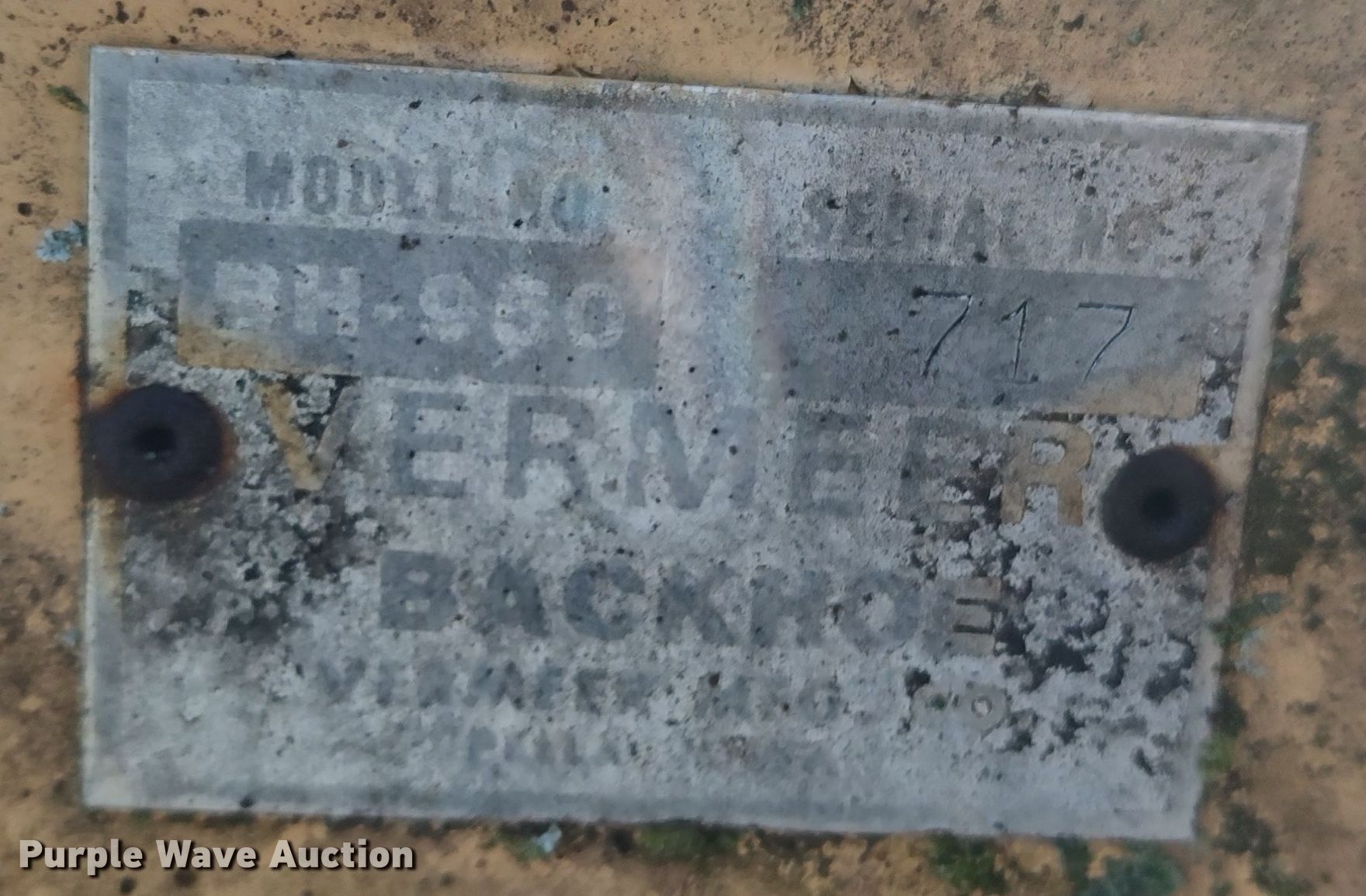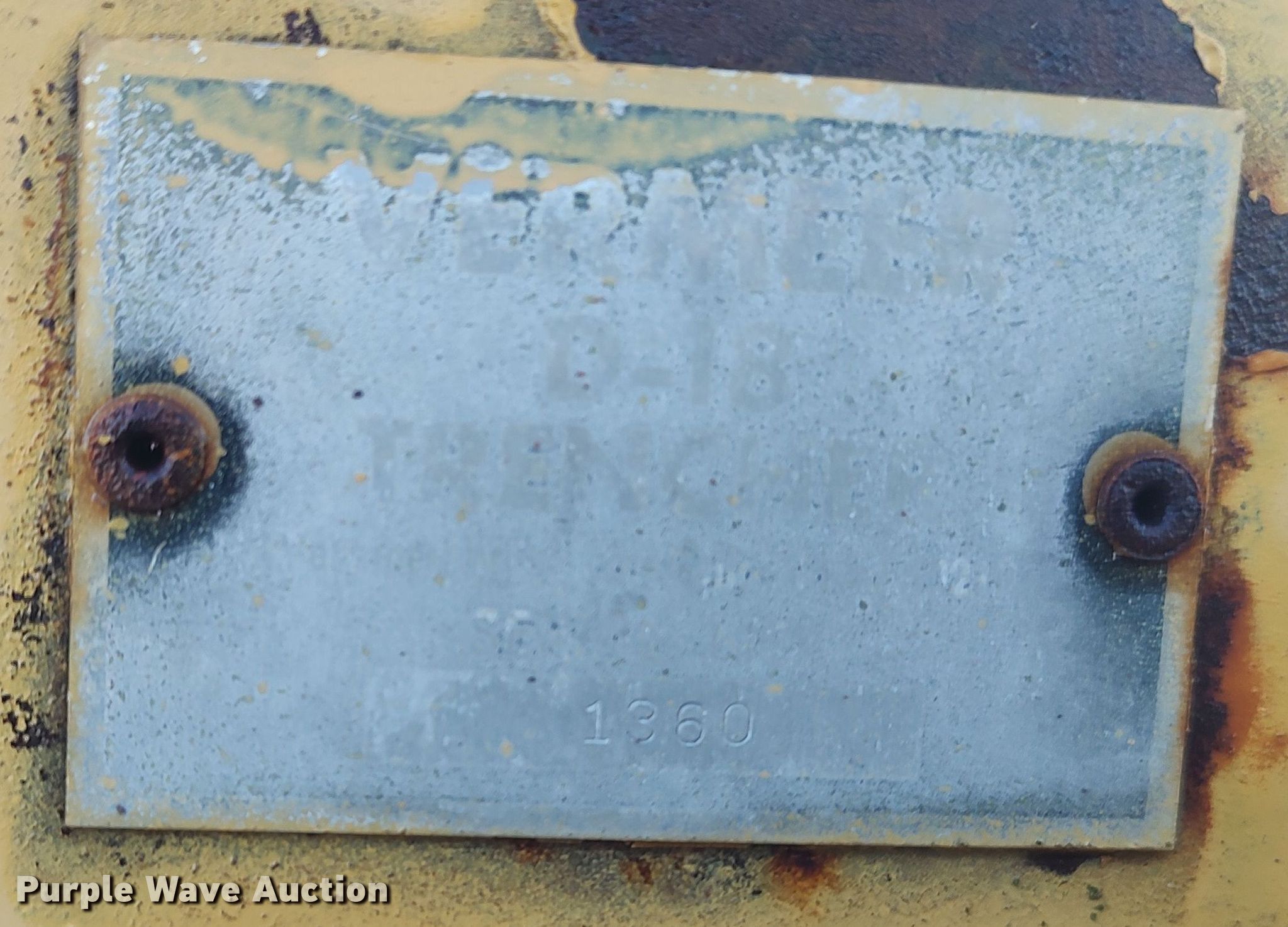 1983 Vermeer M-475 trencher. Serial: 1360. Engine Deutz F4L912, Serial: 6141079, Cylinders: 4, Fuel type: Diesel. Transmission Manual, 4F - 1R. Operators station Canopy. Features Trencher Model: D18, Serial: 1360, Estimated dig depth: 72", Cutting width: 6", Teeth: Dirt, Crumber, Backhoe Model: BH960, Serial: 717, Backfill blade Width: 78", Backhoe Model: BH960, Serial: 717, Backfill blade Width: 96".. Tires Size: 31x15.50-15. Notes Possible cylinder head gasket issue, Possible fuel pump issue, Engine turns over but will not start, Unknown operating condition. 17100 S Air Depot Blvd. Norman, OK 73026