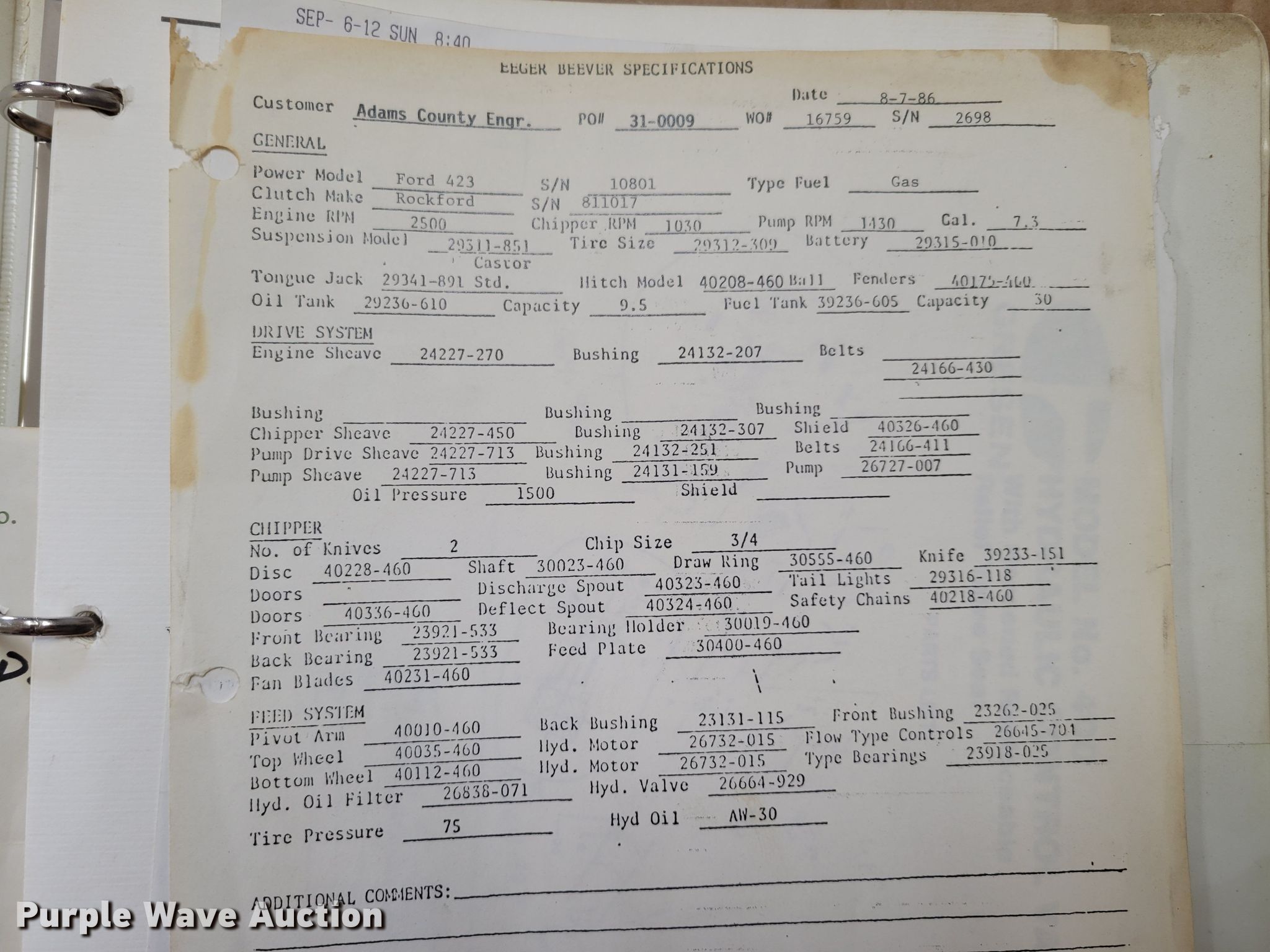 Morbark Industries Inc Eeger Beever wood chipper. Hours: 2,667 on meter. Engine Cylinders: 4, Fuel type: Gas. Features Throat opening: 16" x 12". Trailer 13' L x 74" W, Ball hitch size: 2", Suspension: Spring, Brakes: Electric, Axles: Single, Tire size: 8.00-16.5. Transfer of ownership documentation will be a bill of sale which will be assigned and distributed by the seller. Adams County Secondary Roads. 2004 200th Street. Corning, IA 50841