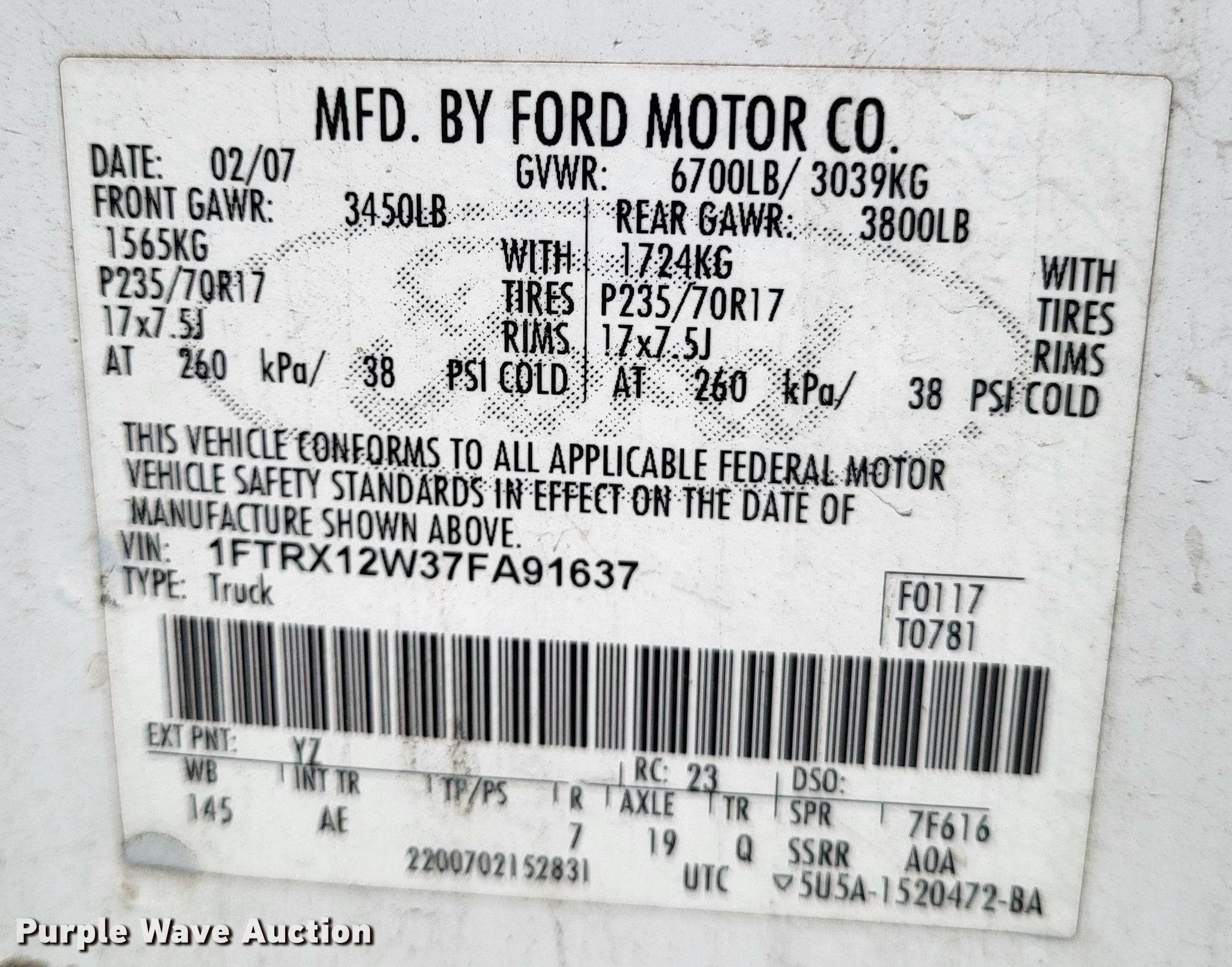 - VIN: 1FTRX12W37FA91637