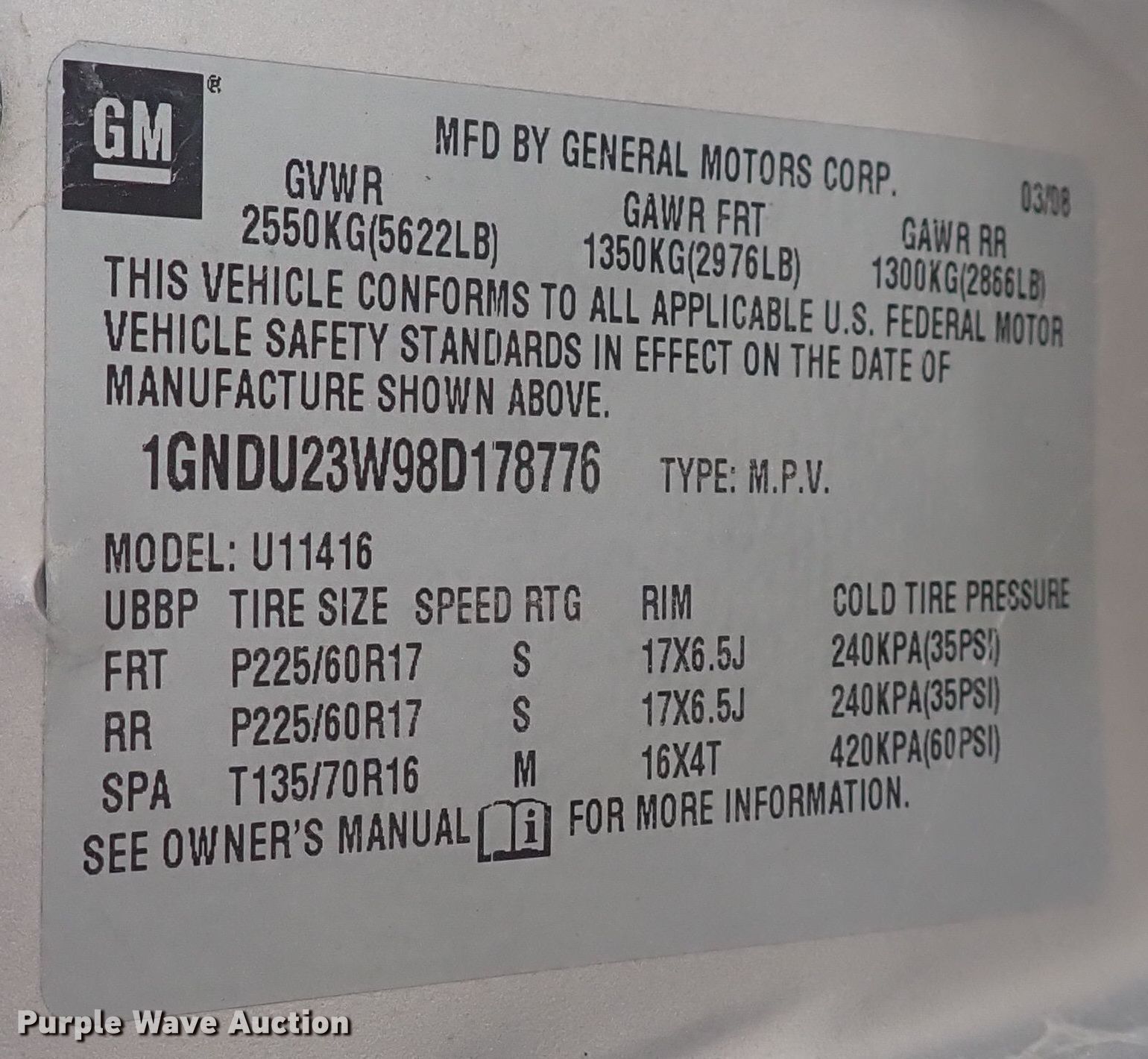 Purple Wave is selling a used Passenger Vehicle in Kansas. This item is a 2008 Chevrolet Uplander van with the following: Miles: 85,457 on odometer, VIN: 1GNDU23W98D178776