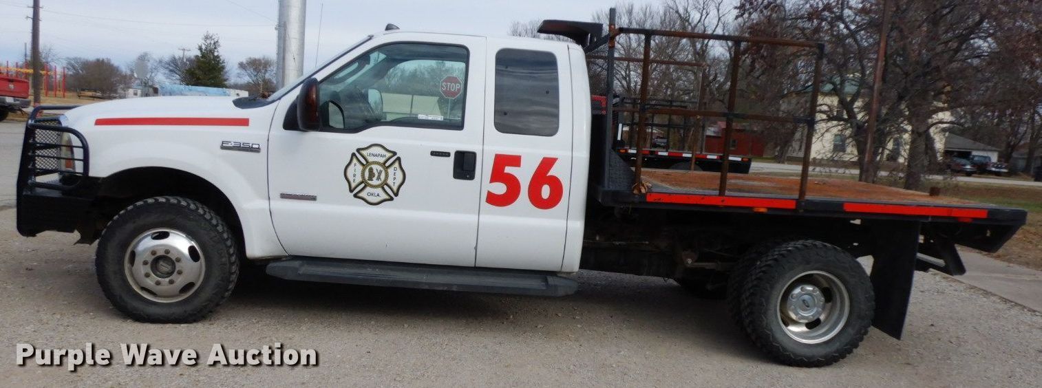2006 Ford F350 Super Duty Lariat SuperCab flatbed pickup truck. Miles: 242,082 on odometer, VIN: 1FTWX33P56EA91715. Engine Displacement: 6.0L V8 OHV, Cylinders: 8, Fuel type: Diesel. Transmission Automatic, Four wheel drive. Interior AC, Heat, Power windows, Power locks, Cruise control. Features Flatbed 9' L x 8' W, Hitch: Gooseneck. Tires Size: 255/75R17. Notes Dash warning indicator: Check engine, Transmission issues, will not shift into overdrive. Oklahoma title. Title distribution may be delayed up to 14 days from verification of funds. Lenapah Fire Department. Lenapah, OK 74042