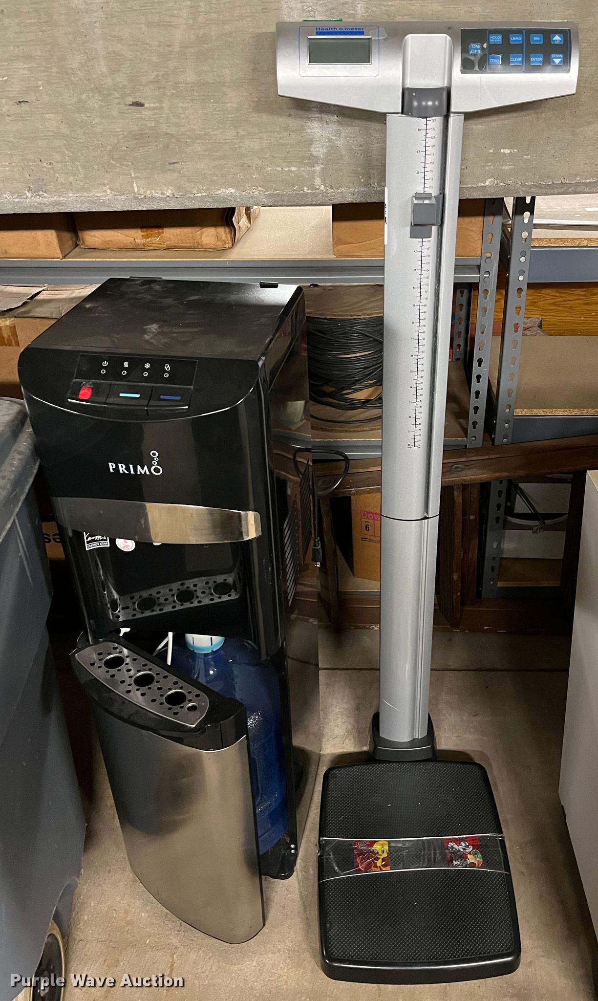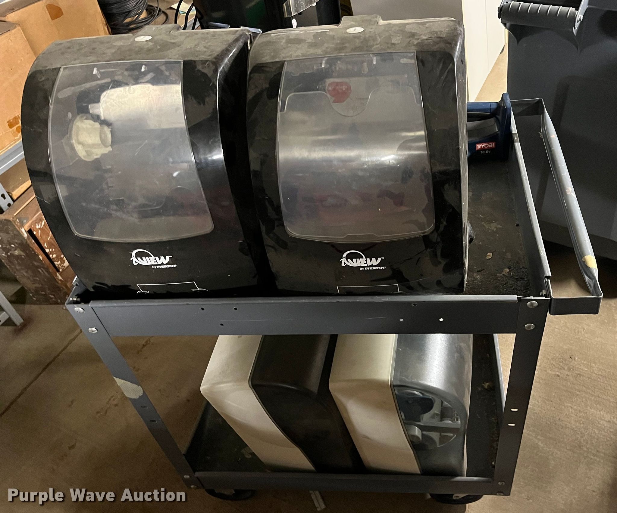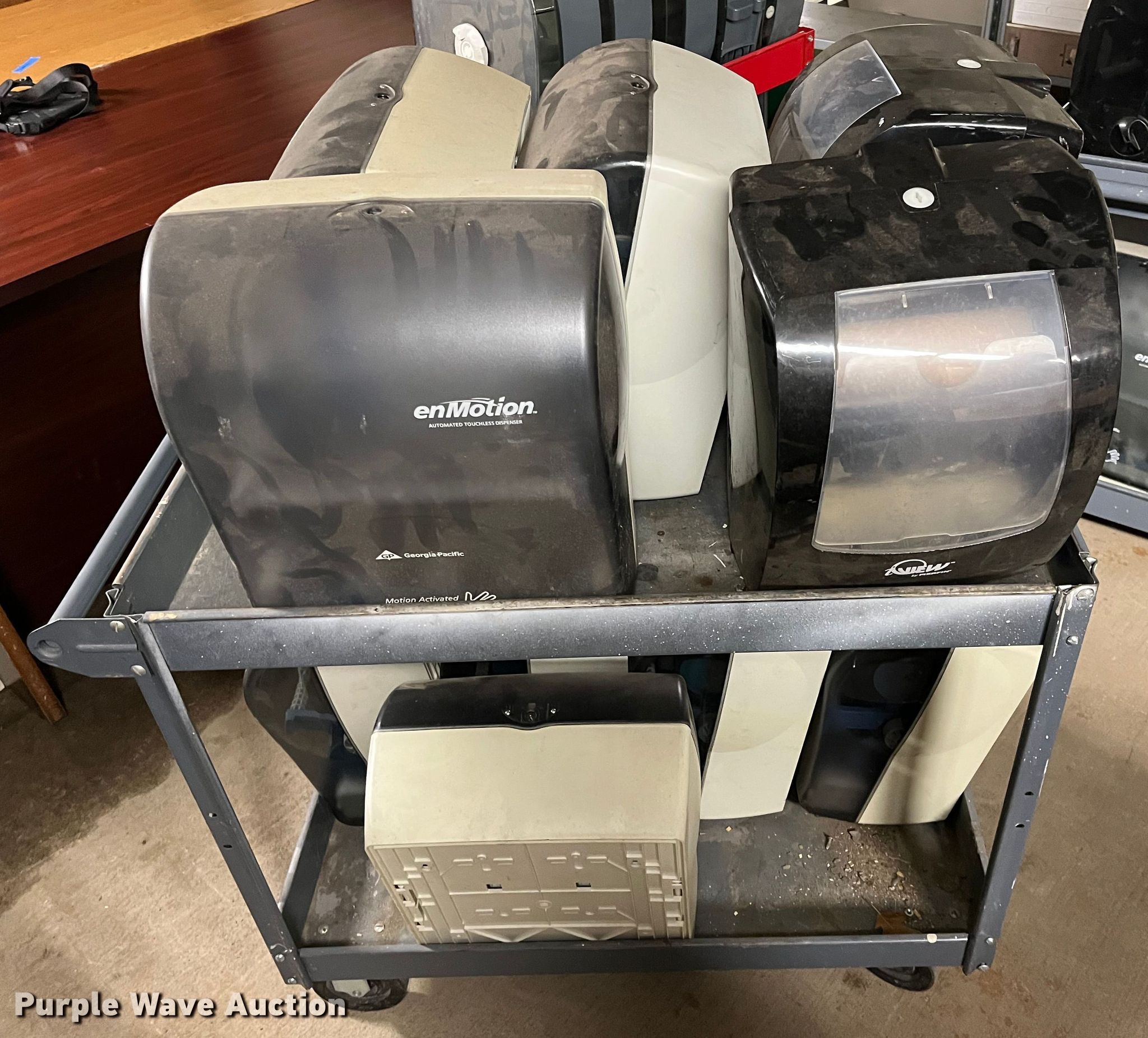 Office supplies and equipment. Paper good dispensers, (3) carts, Trash cart, Toner cartridges, Water dispenser, Scale, Time card printer, Pitney-Bowes paper folder Unknown operating condition, Cabinet. Sedgwick County. 525 N Main St. Wichita, KS 67203