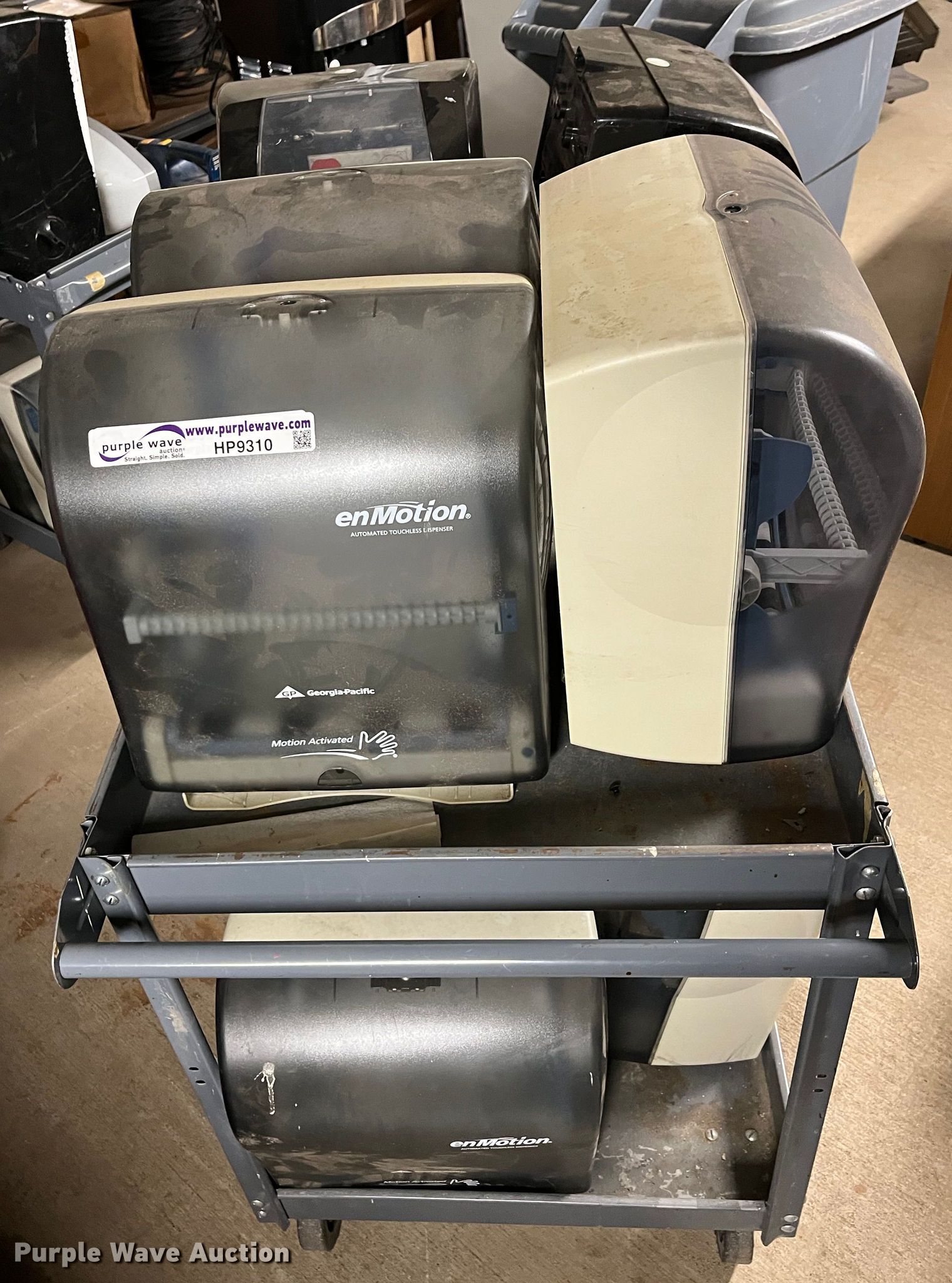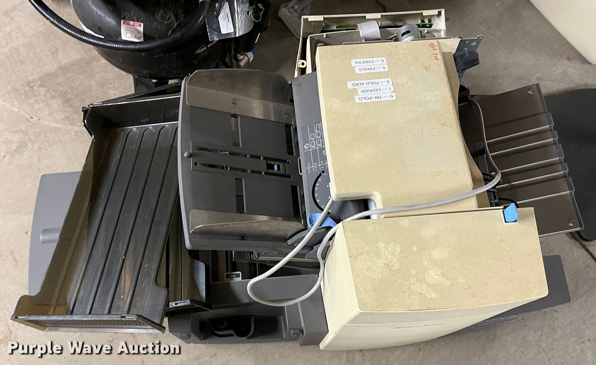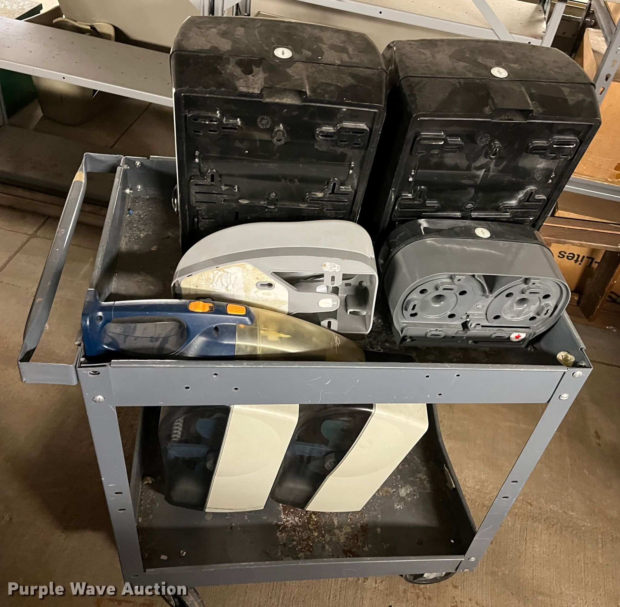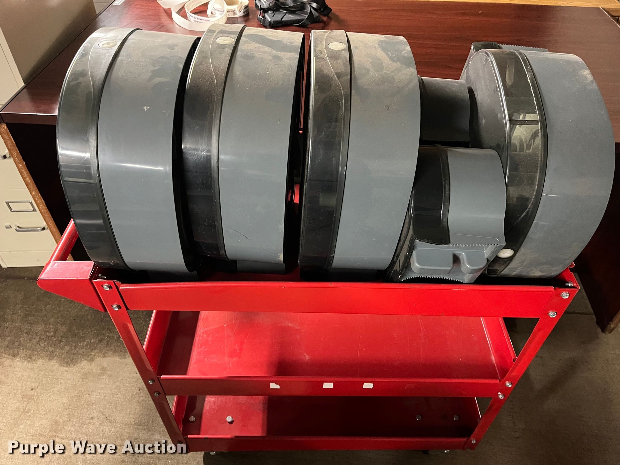 Purple Wave is selling a used Office Supplies and Equip. in Kansas. This item is a Office supplies and equipment with the following: Paper good dispensers, (3) carts, Trash cart, Toner cartridges, Water dispenser, Scale, Time card printer, Pitney-Bowes paper folder, Unknown operating condition, Cabinet