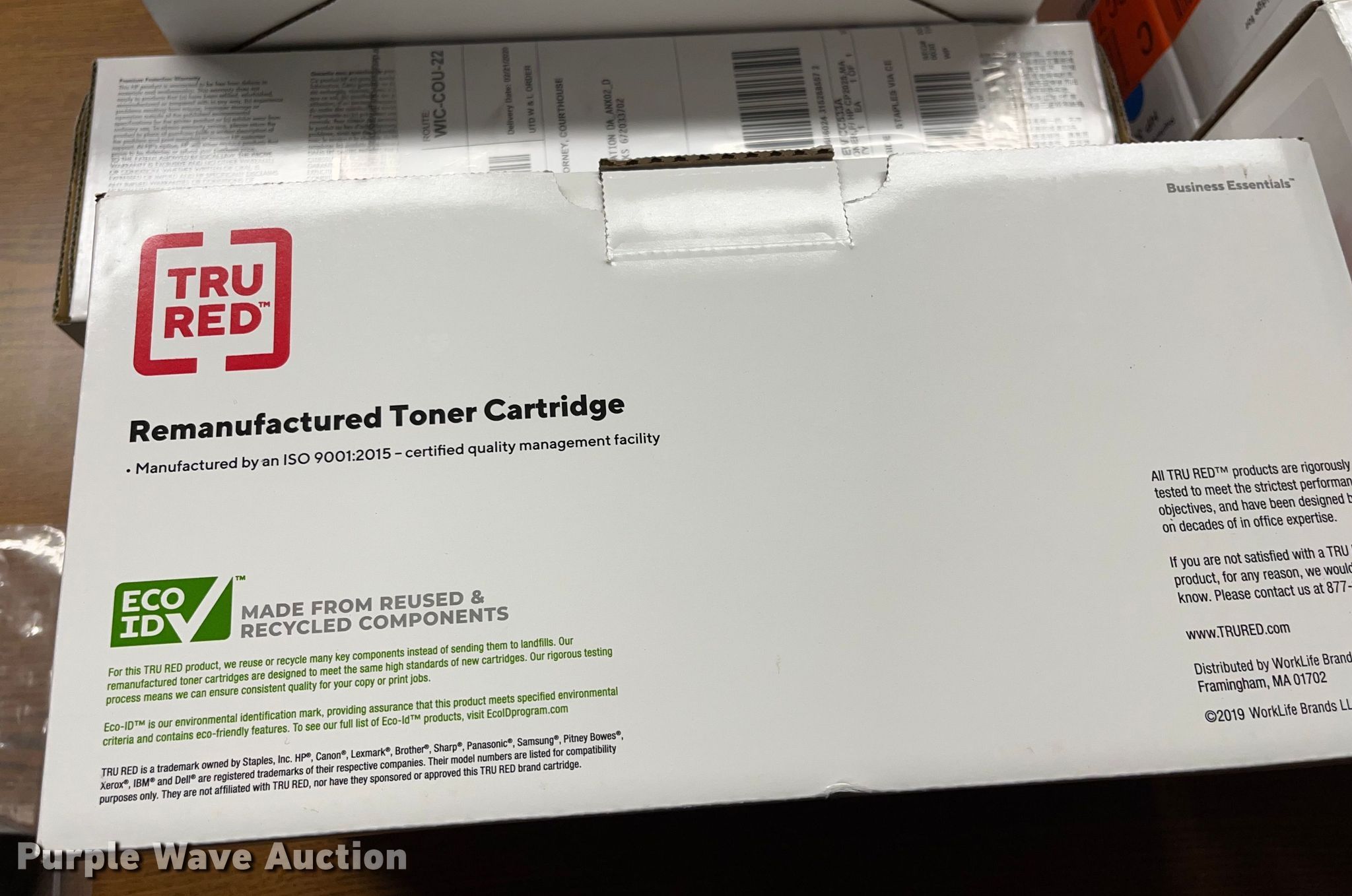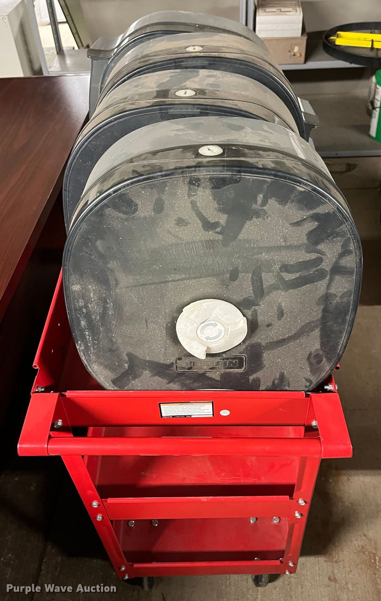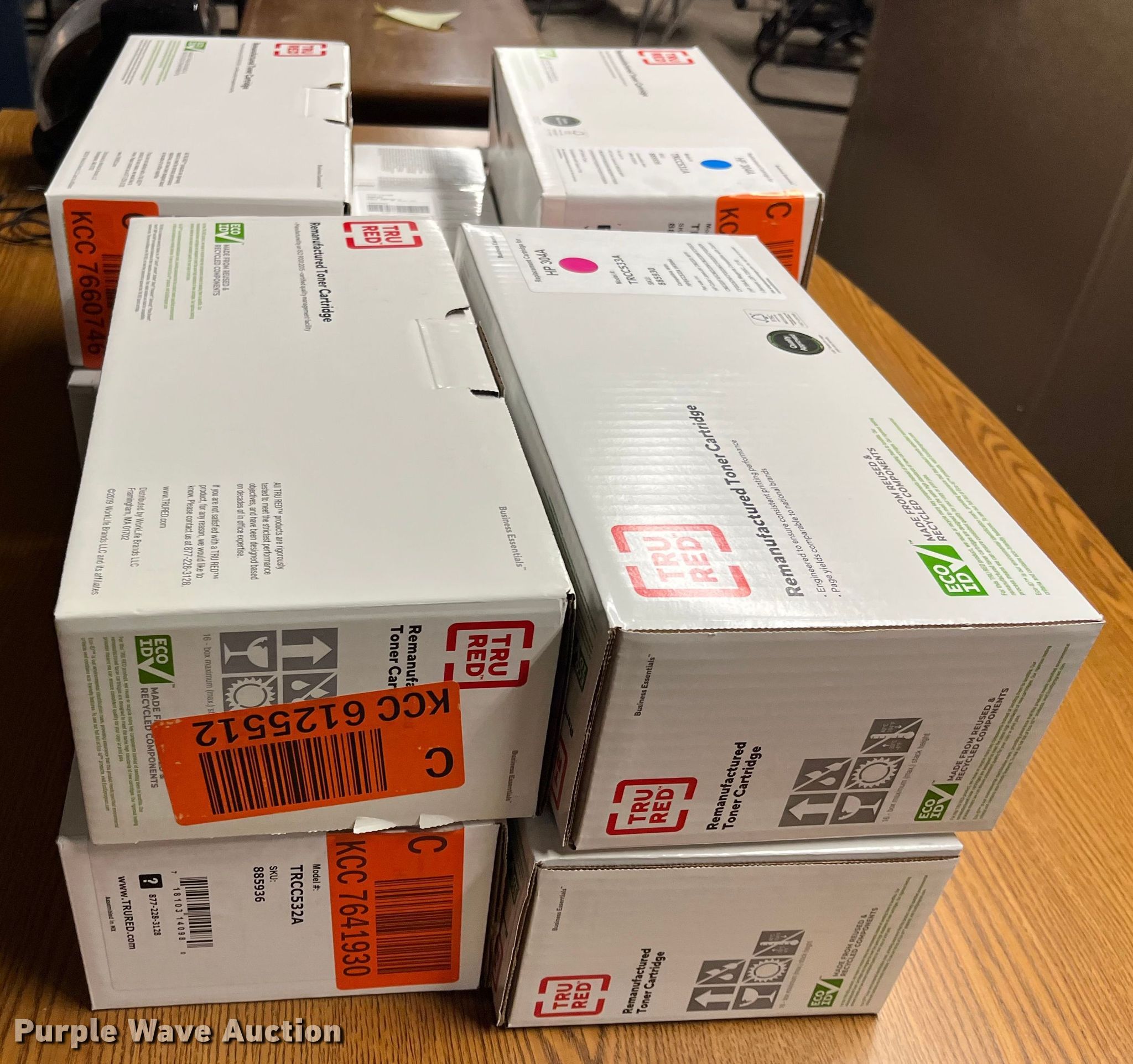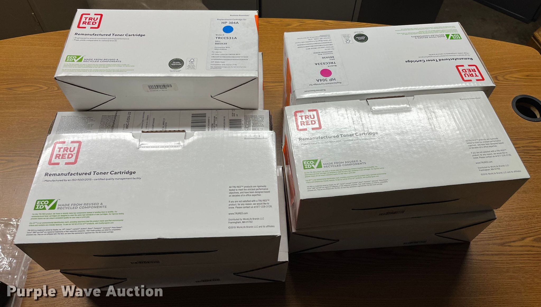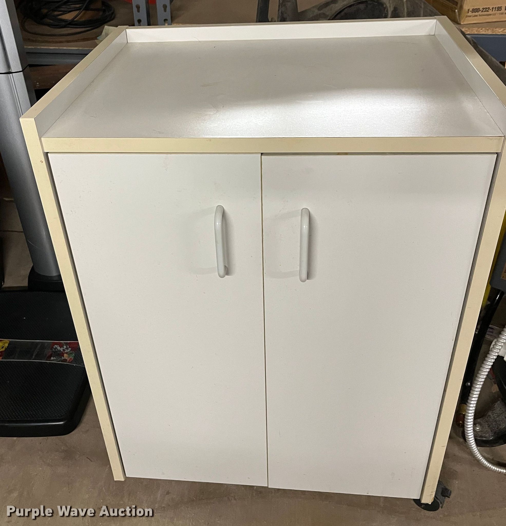 Purple Wave is selling a used Office Supplies and Equip. in Kansas. This item is a Office supplies and equipment with the following: Paper good dispensers, (3) carts, Trash cart, Toner cartridges, Water dispenser, Scale, Time card printer, Pitney-Bowes paper folder, Unknown operating condition, Cabinet