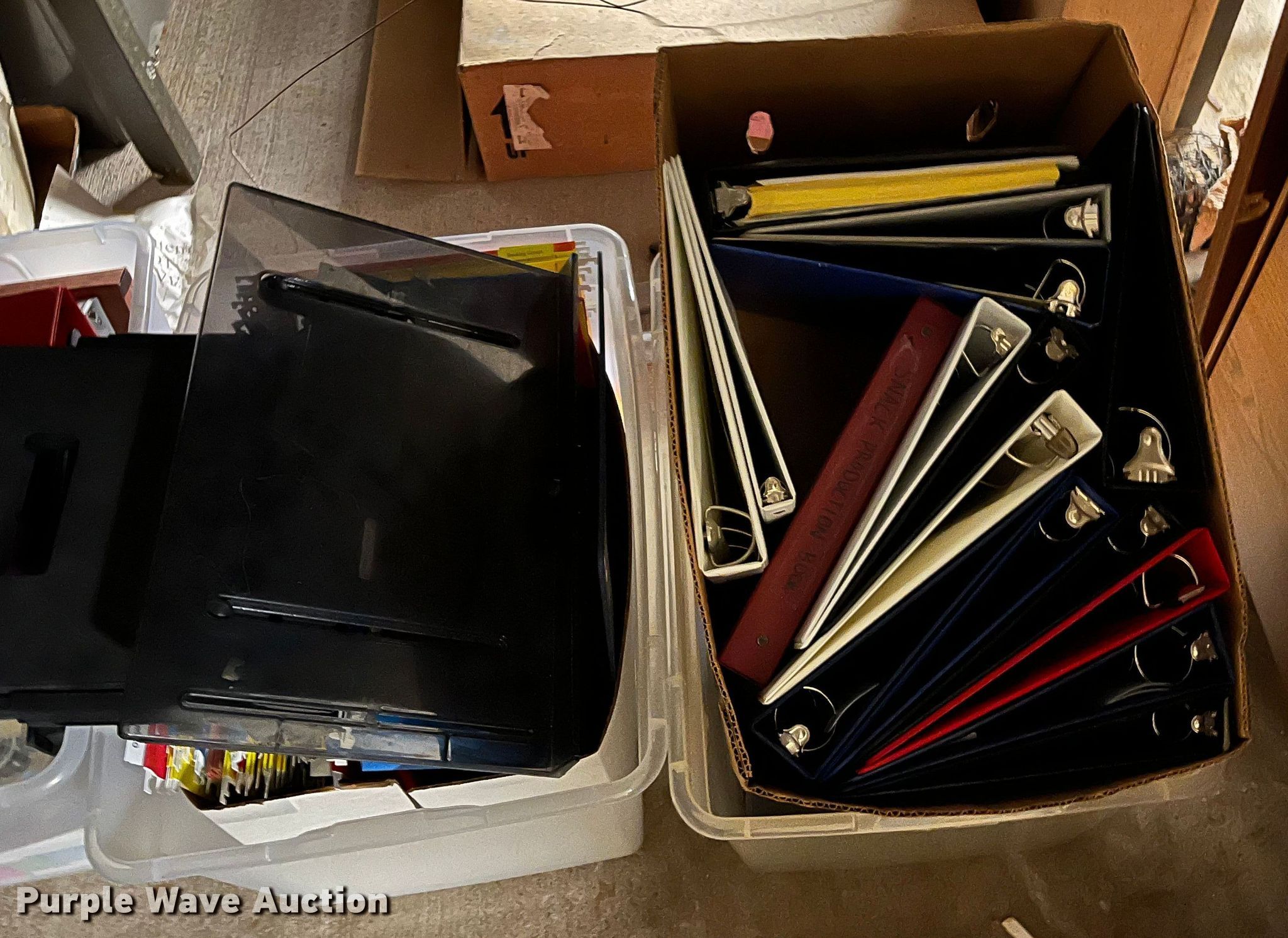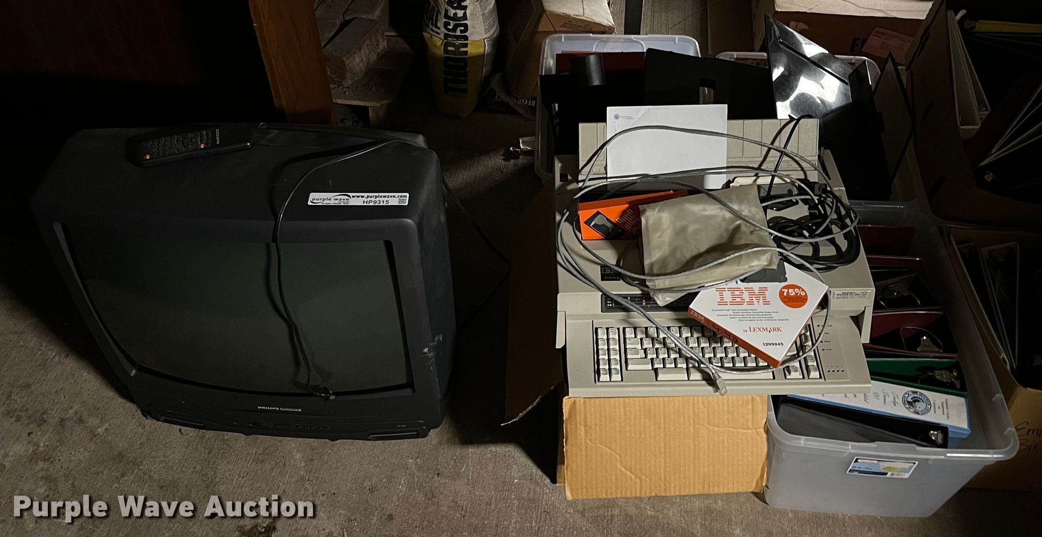 Purple Wave is selling a used Office Supplies and Equip. in Kansas. This item is a Office supplies and equipment with the following: Philips TV/VCR, Paper trays, Word processor, Three ring binders, Easel and more