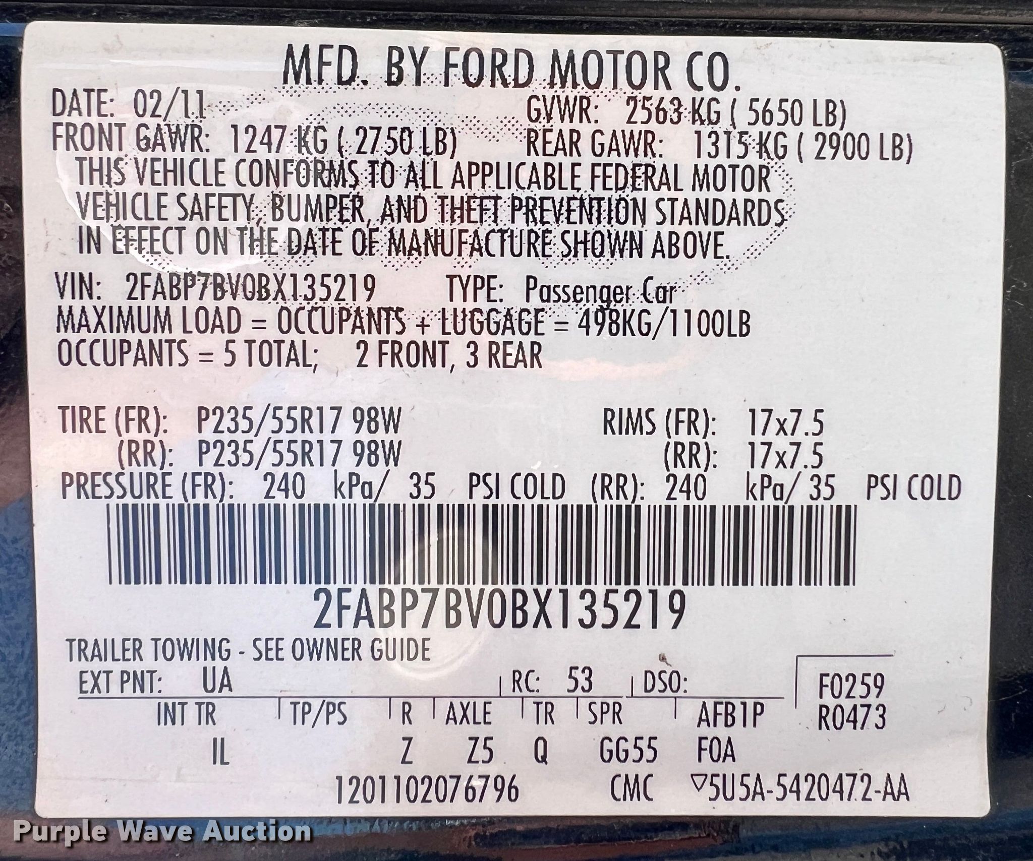 - VIN: 2FABP7BV0BX135219