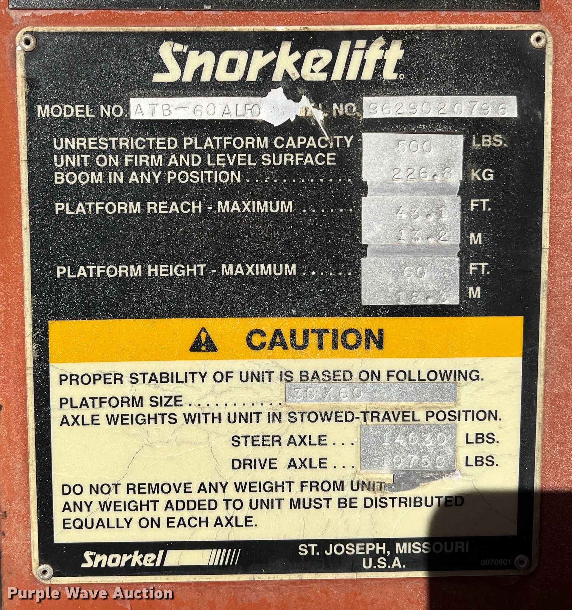 1996 Snorkelift ATB-60 boom lift. Hours: 3,599 on meter, Serial: 9629020796. Engine Cylinders: 4, Fuel type: Dual fuel. Features Rough terrain, Maximum lift capacity: 500 lbs, Maximum reach length: 43', Maximum lift height: 60', Hydraulic extendable jib, Hydraulic leveling, Platform: 30" L x 60" W, Controls: Platform, Ground, Platform rotation: Hydraulic. Tires Tire size: 15-19.5. Coffeyville Community College. Coffeyville, KS 67337