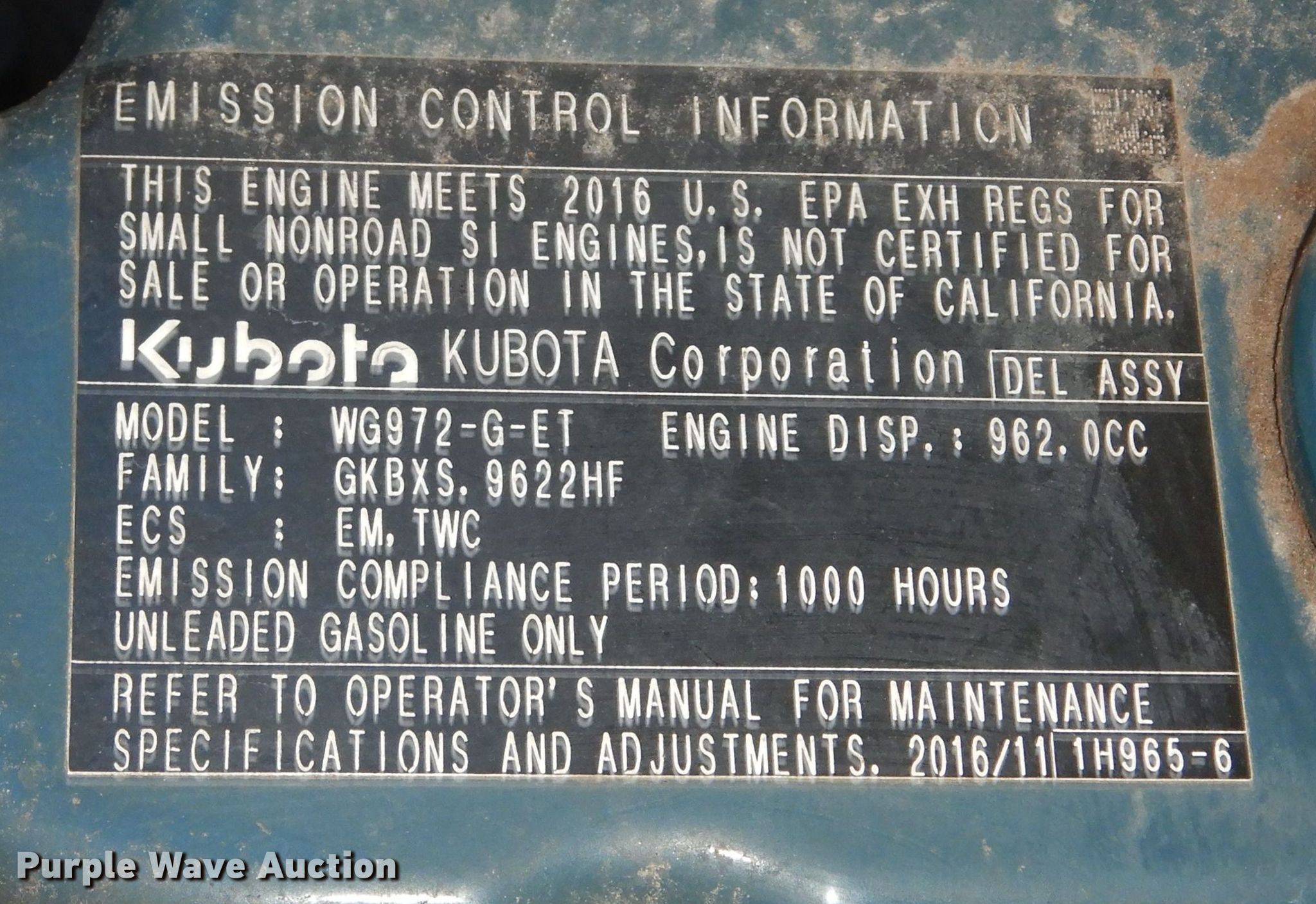Grasshopper 932 ZTR lawn mower. Hours: 1,579 on meter, Cutting width: 72", Serial: 6715099, Unit #: 4033. Engine Kubota WG972-G-ET, Serial: 4GW4450, Displacement: 962 cc, Cylinders: 3, Fuel type: Gas. Features Hydraulic front deck lift. Tires Front: 22x11.00-10, Rear: 13x6.50-6/4.59. Olathe, KS 66061