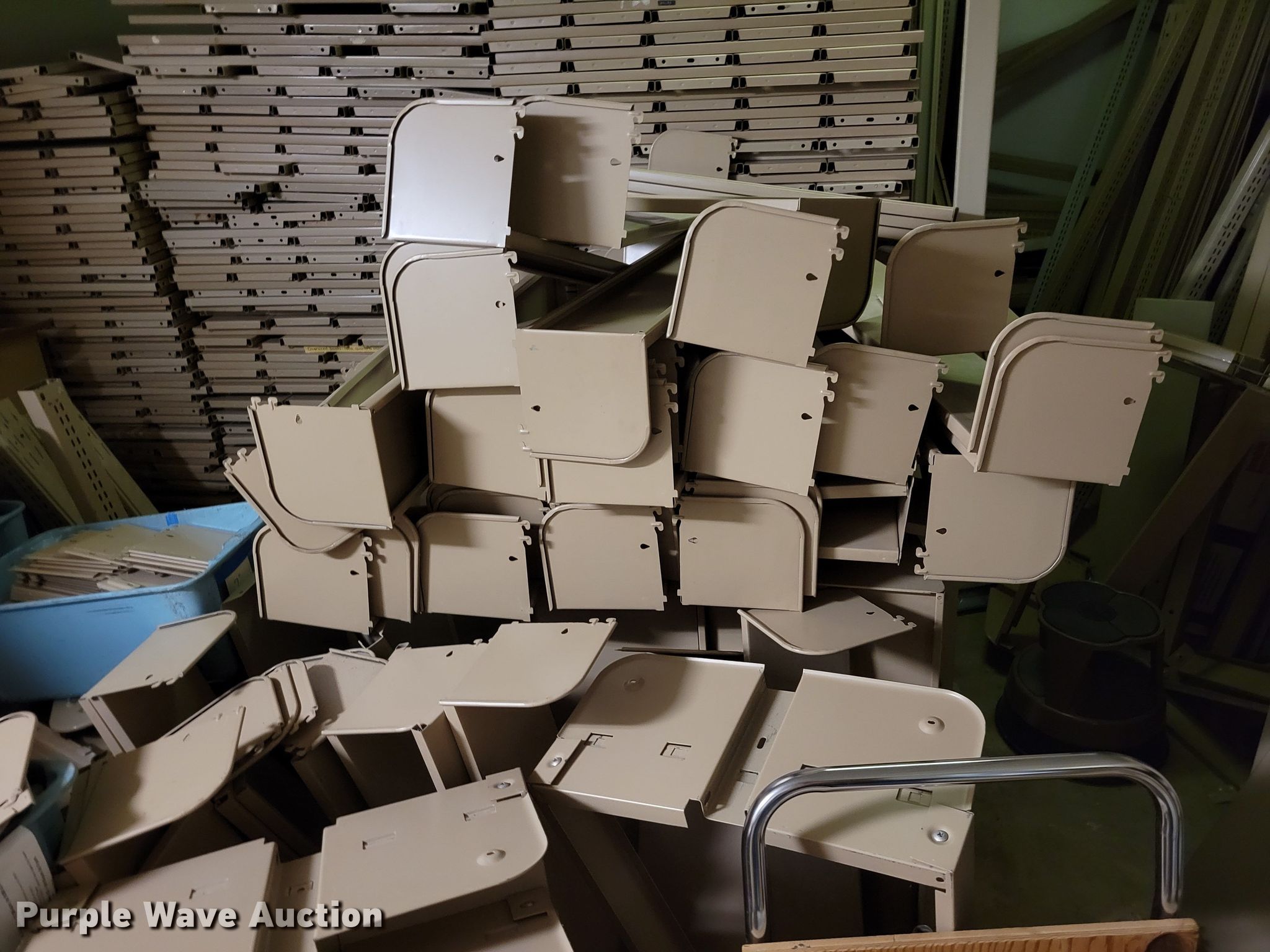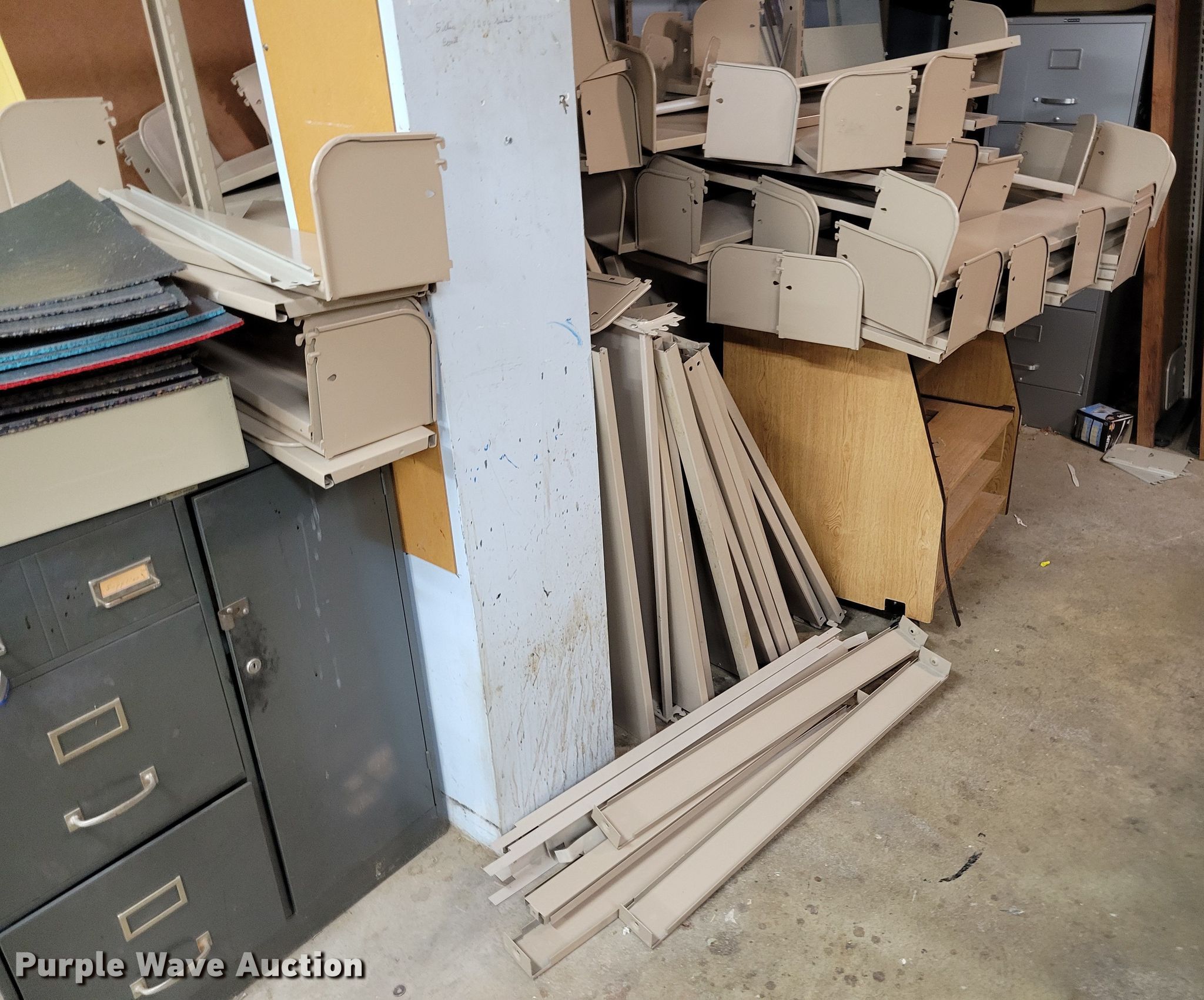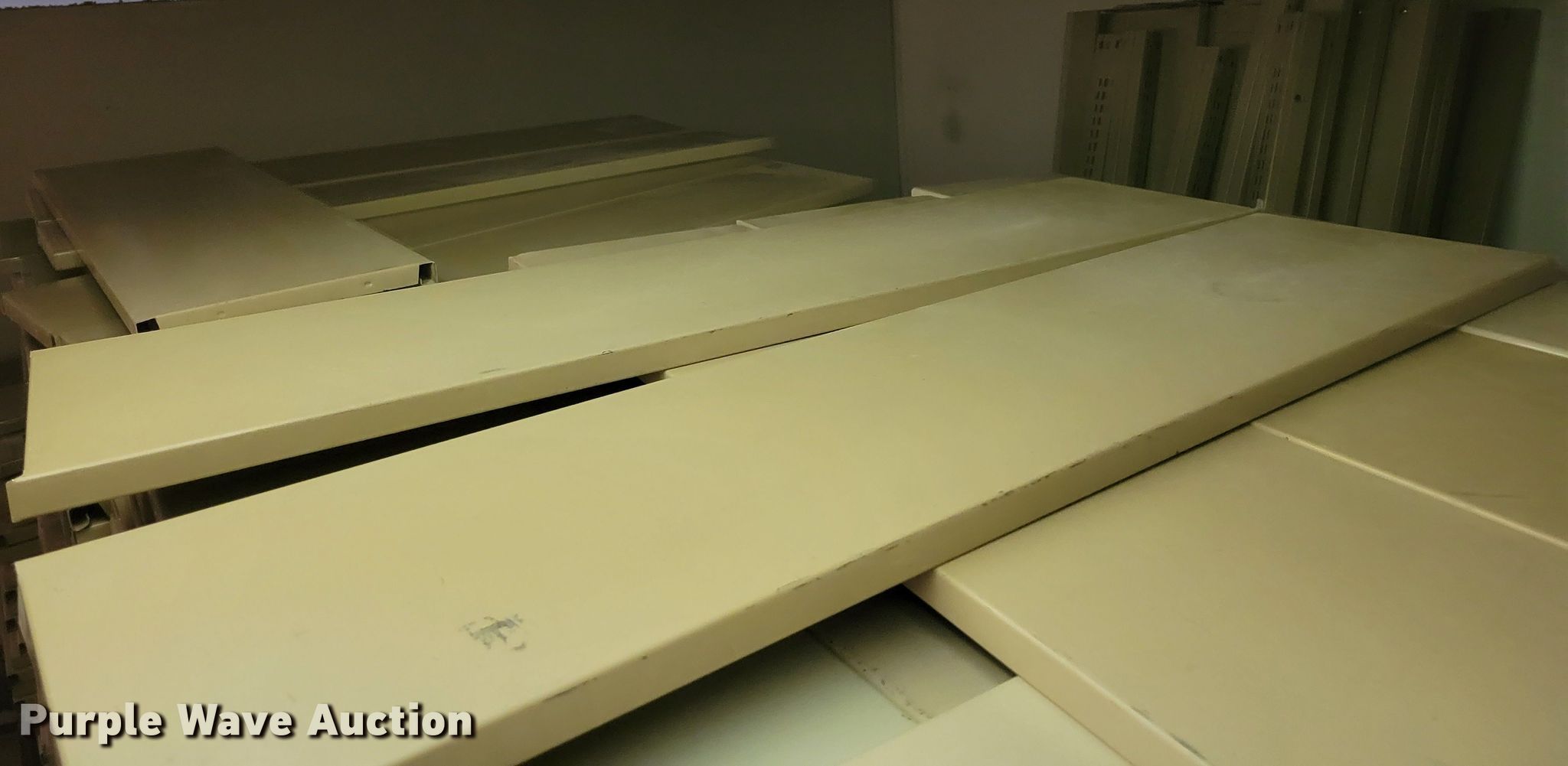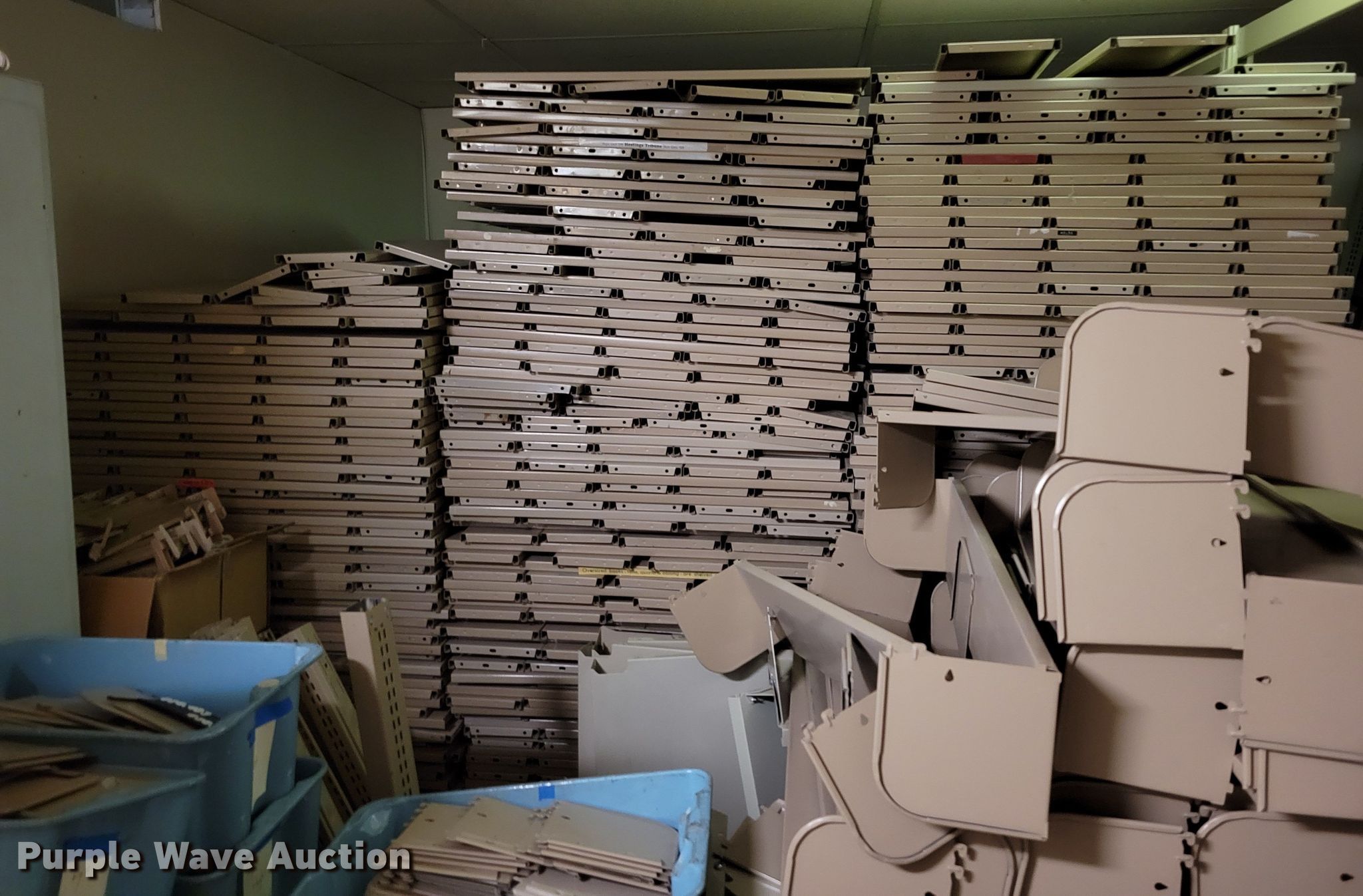 Purple Wave is selling a used Shelving and Storage in Nebraska. This item is a Shelving with the following: Metal shelving, 9' x 6' x 82", Approx. 35 totes dividers, Uprights, Length: Approx. 90",, (12) metal countertops, 90" L x 20" W, (6) chipboard countertops, 59" to 114" L x 29" W, Four drawer filing cabinet, 18" x 28" x 52"