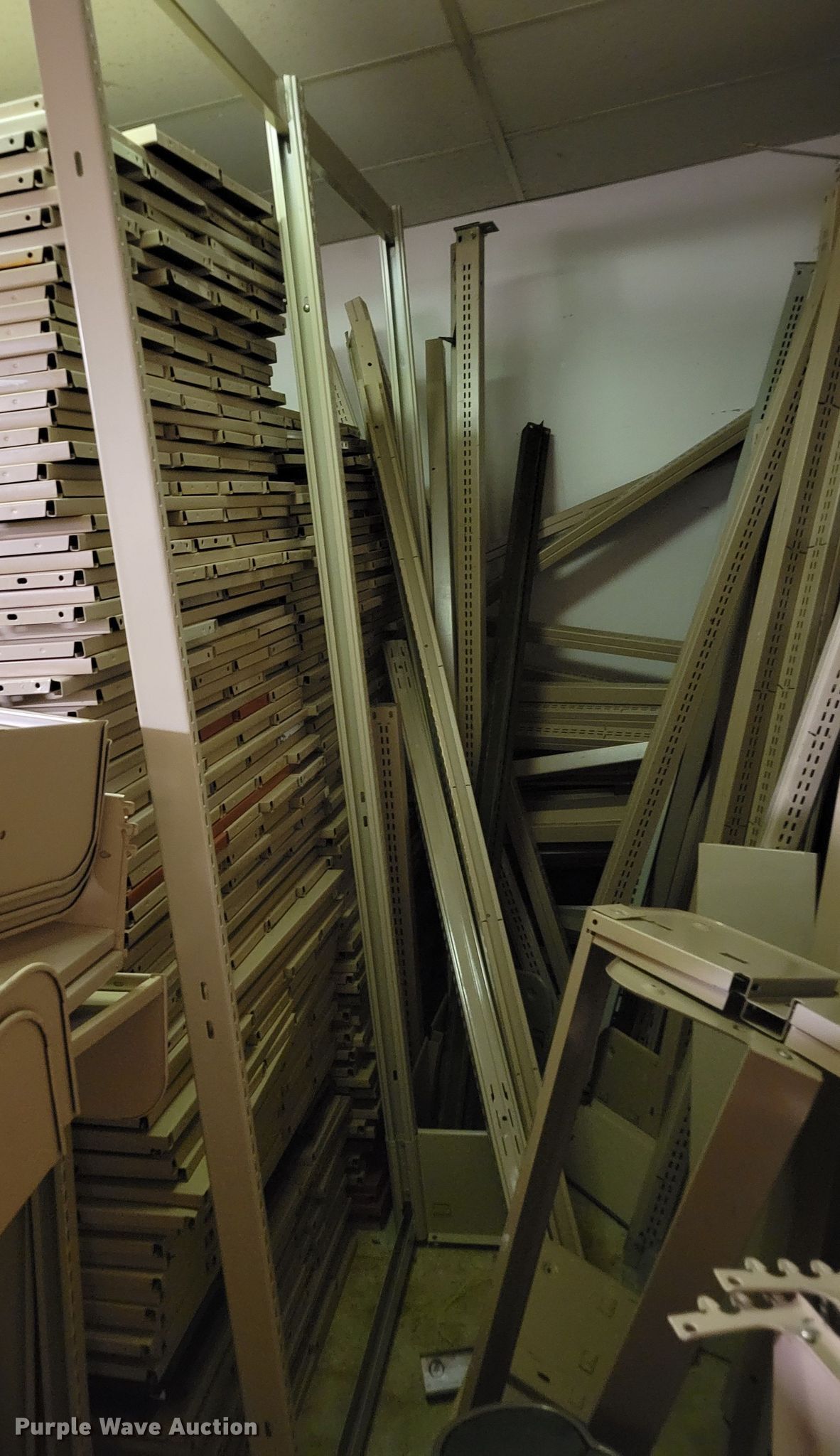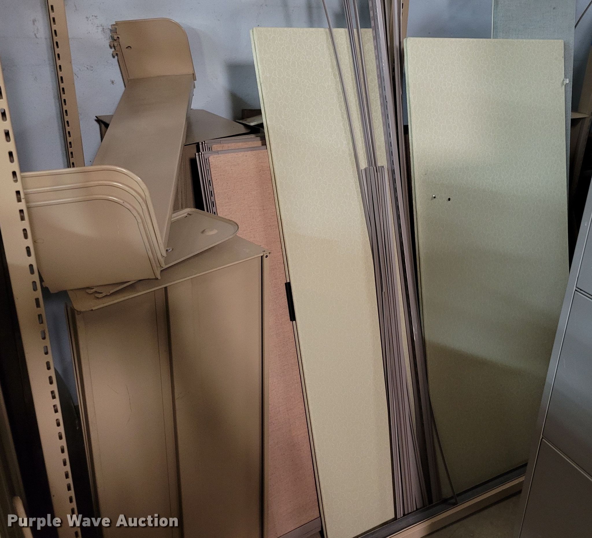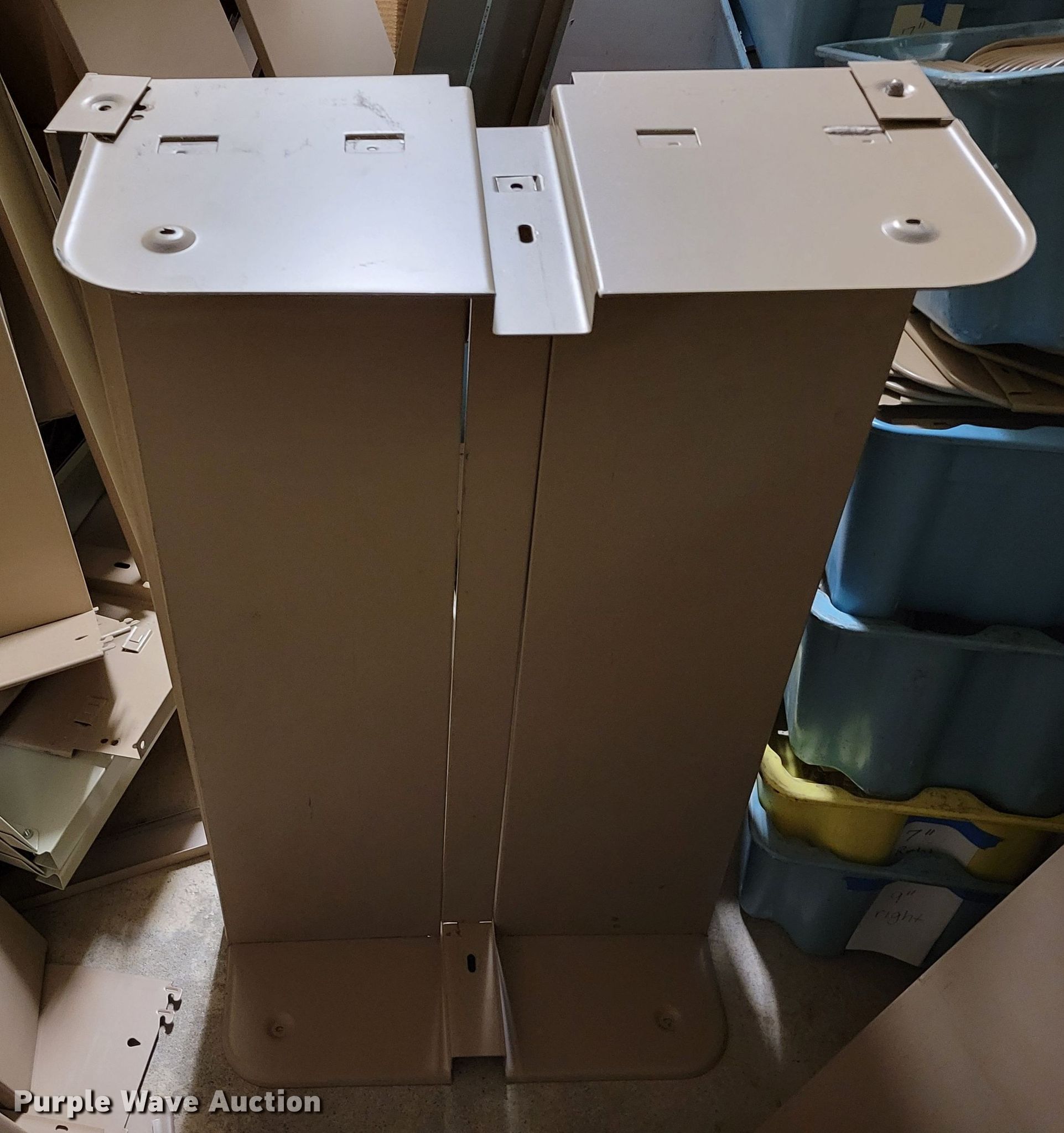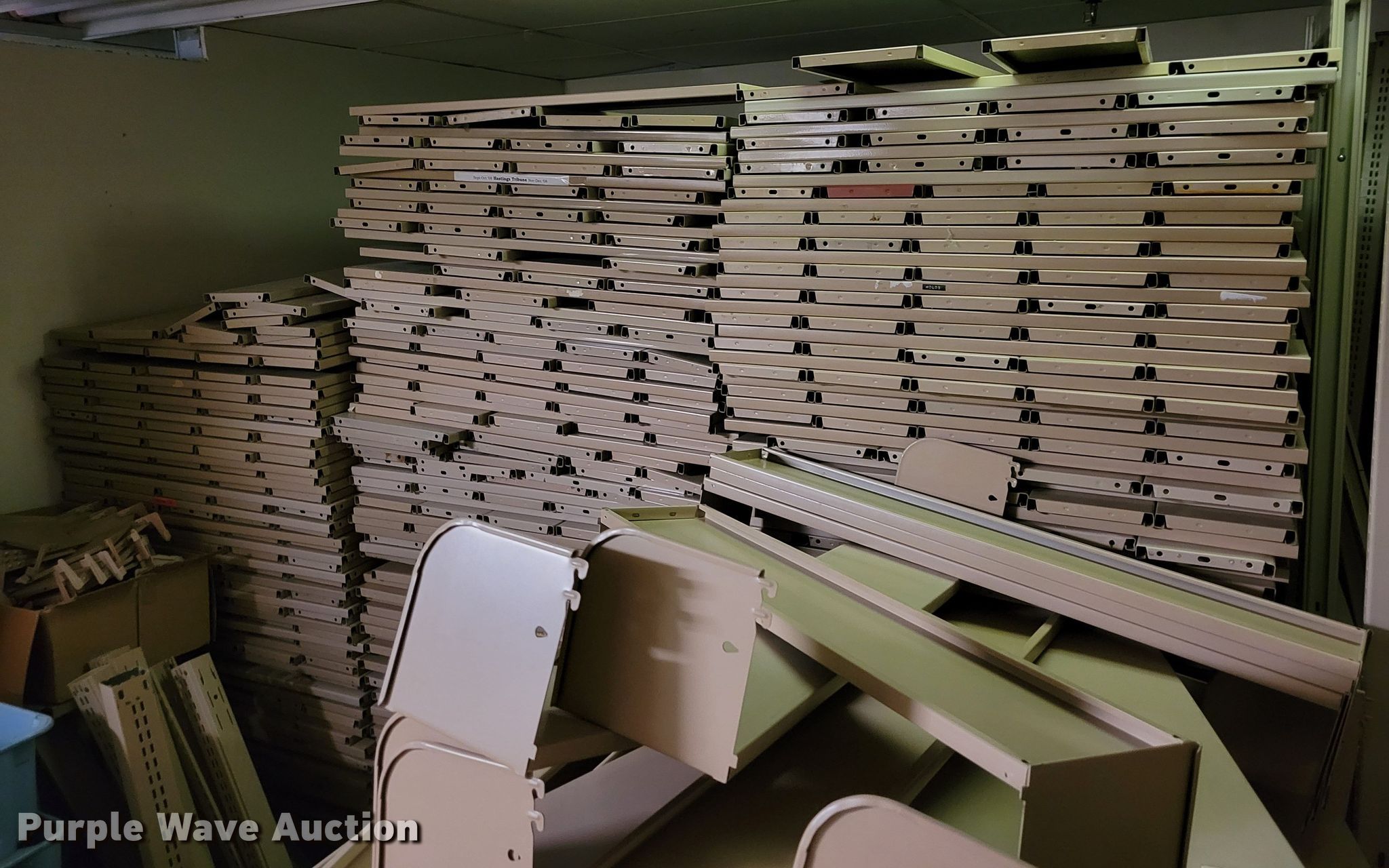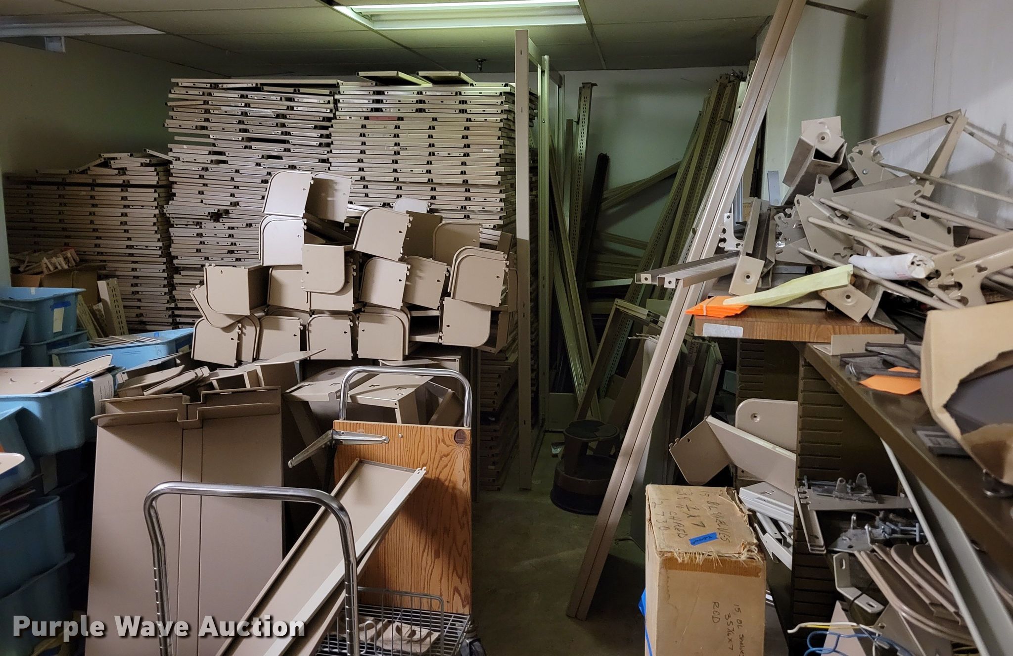 Purple Wave is selling a used Shelving and Storage in Nebraska. This item is a Shelving with the following: Metal shelving, 9' x 6' x 82", Approx. 35 totes dividers, Uprights, Length: Approx. 90",, (12) metal countertops, 90" L x 20" W, (6) chipboard countertops, 59" to 114" L x 29" W, Four drawer filing cabinet, 18" x 28" x 52"