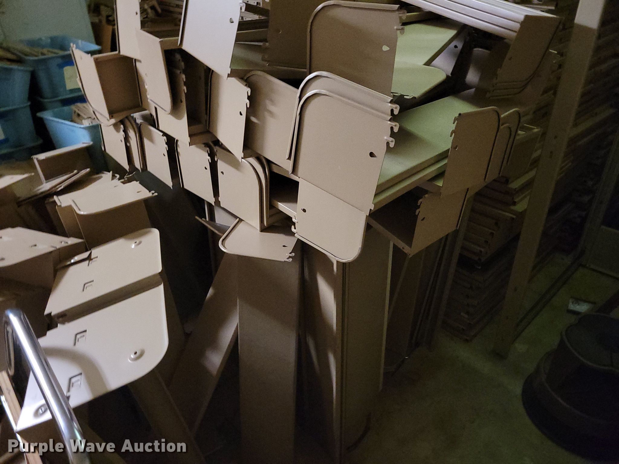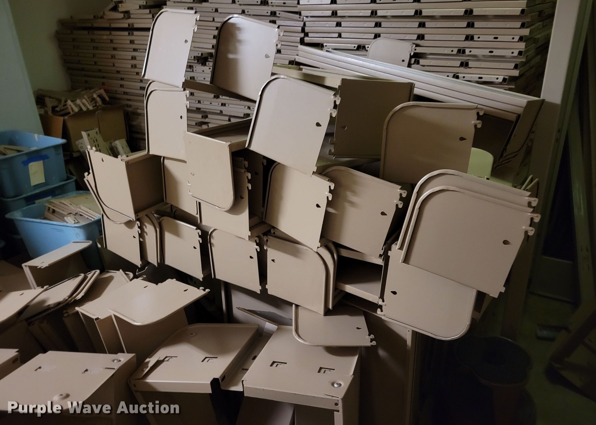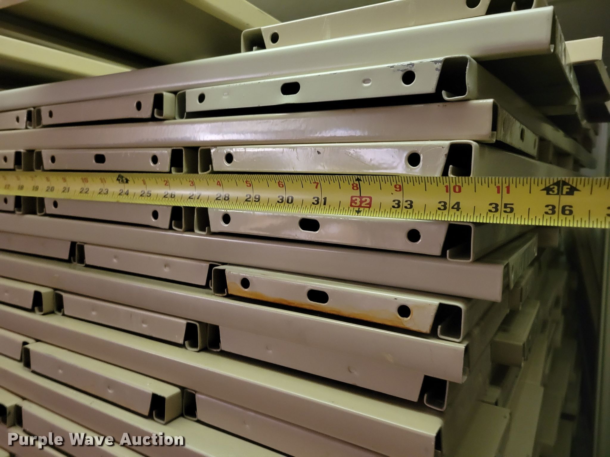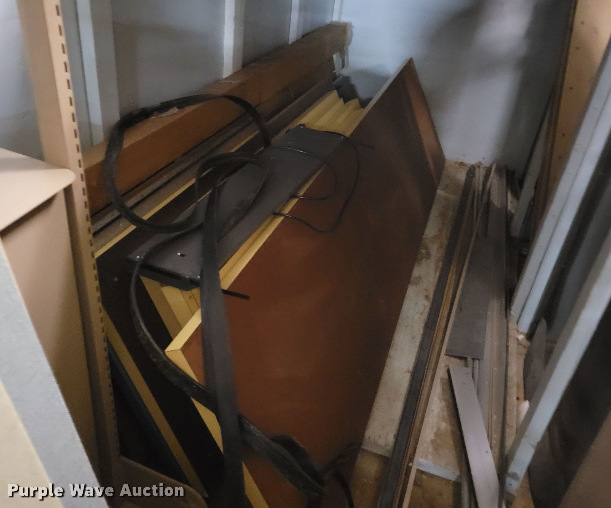 Purple Wave is selling a used Shelving and Storage in Nebraska. This item is a Shelving with the following: Metal shelving, 9' x 6' x 82", Approx. 35 totes dividers, Uprights, Length: Approx. 90",, (12) metal countertops, 90" L x 20" W, (6) chipboard countertops, 59" to 114" L x 29" W, Four drawer filing cabinet, 18" x 28" x 52"