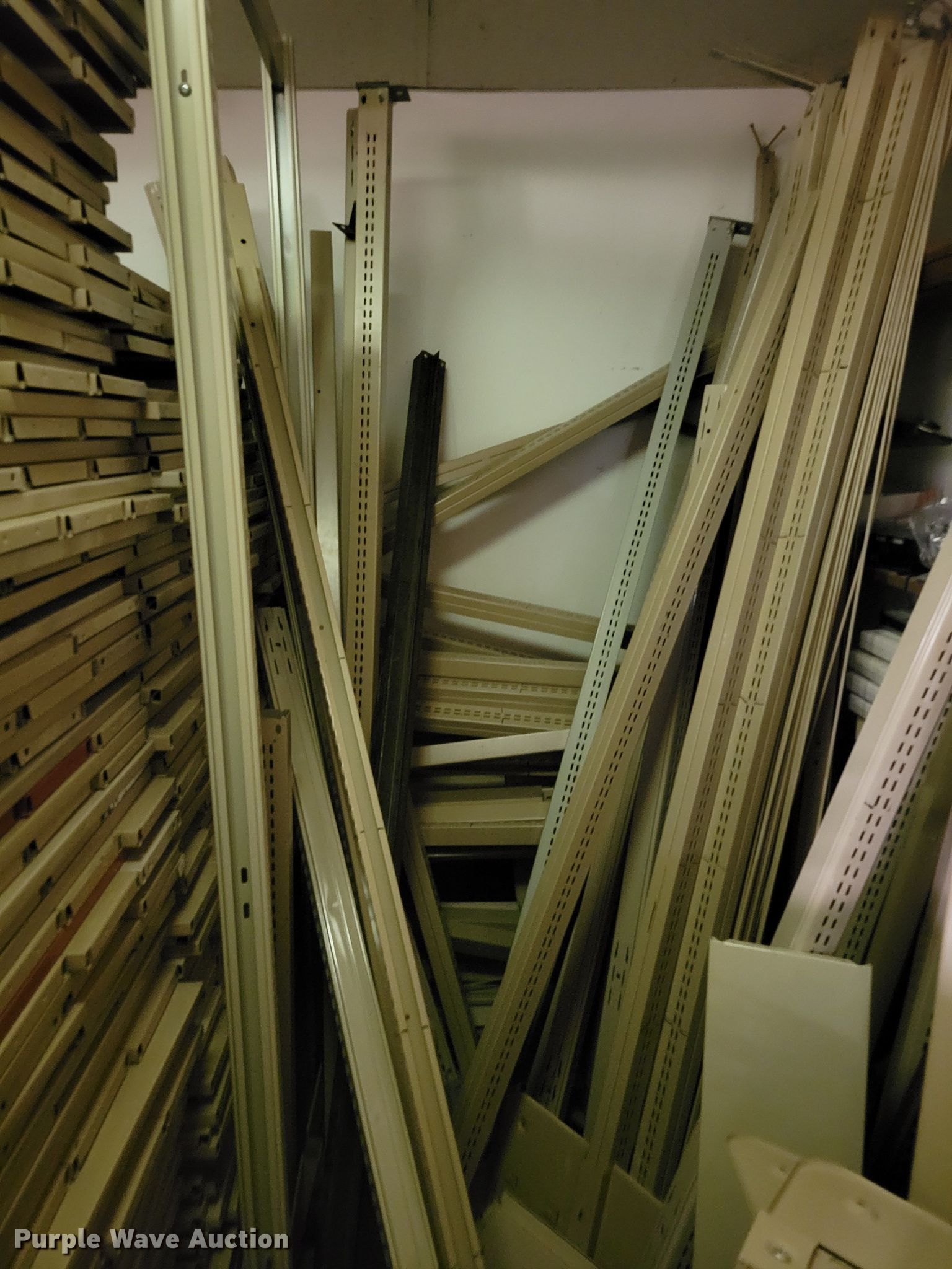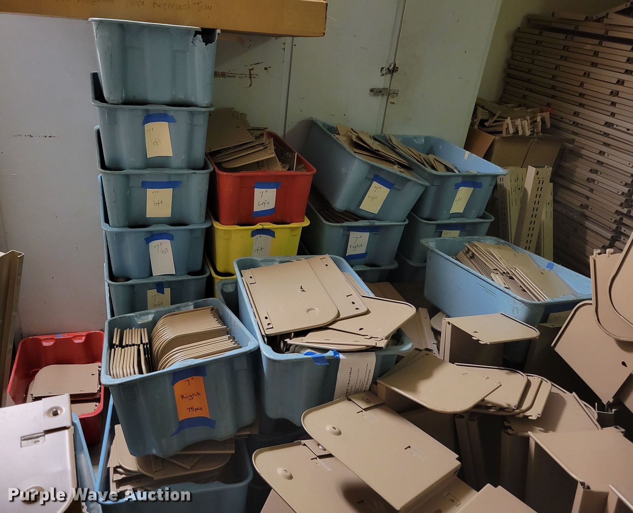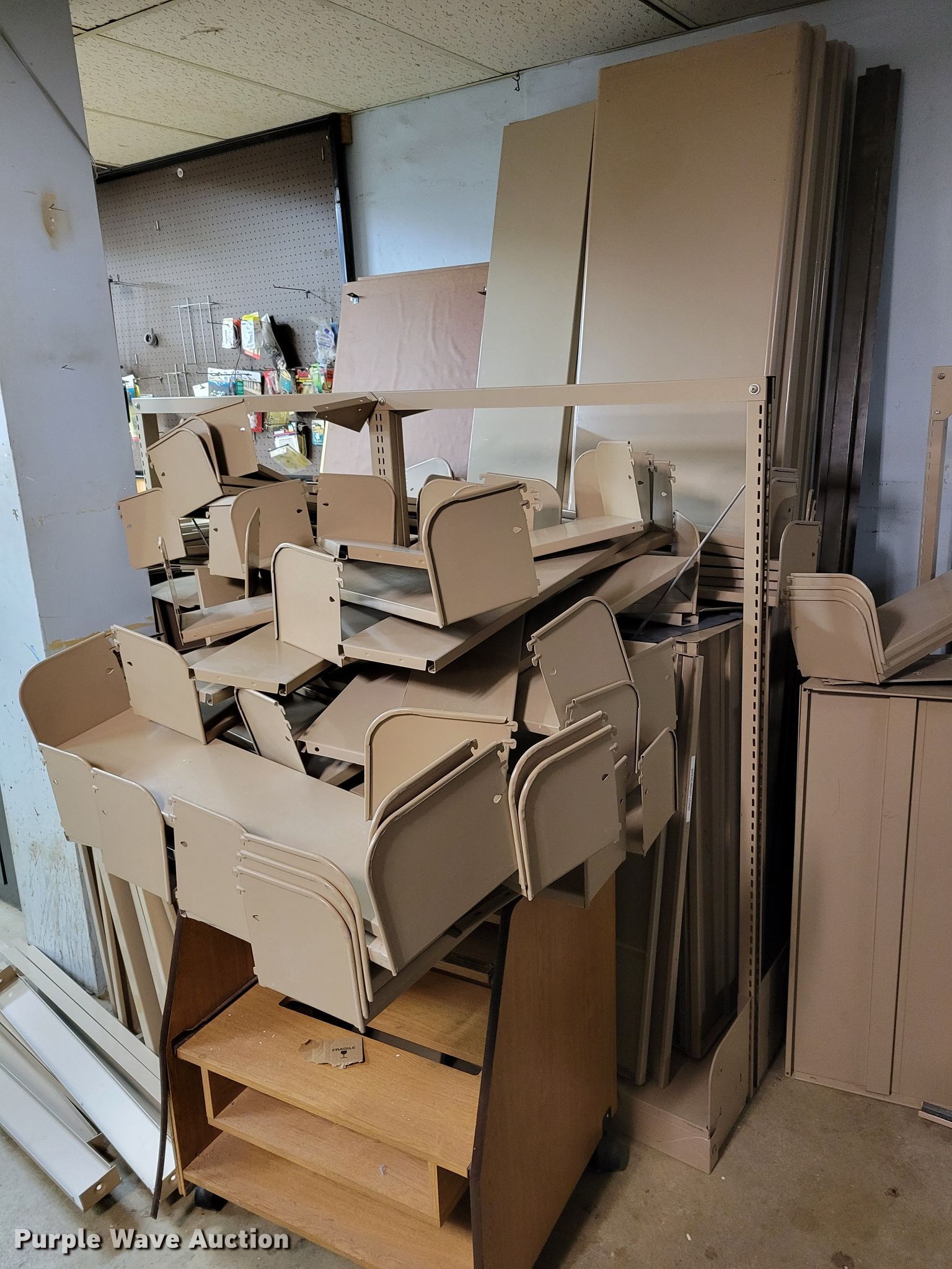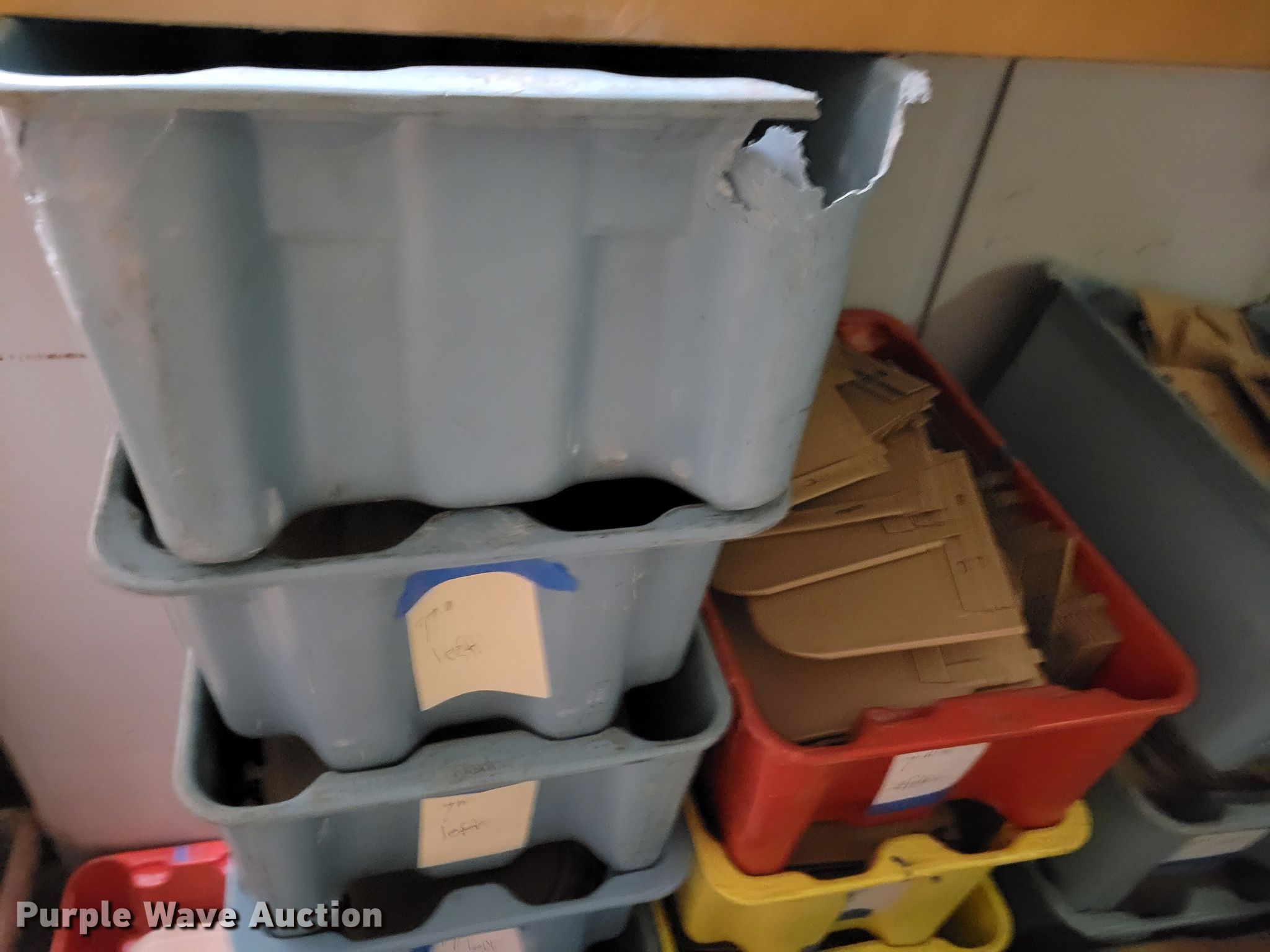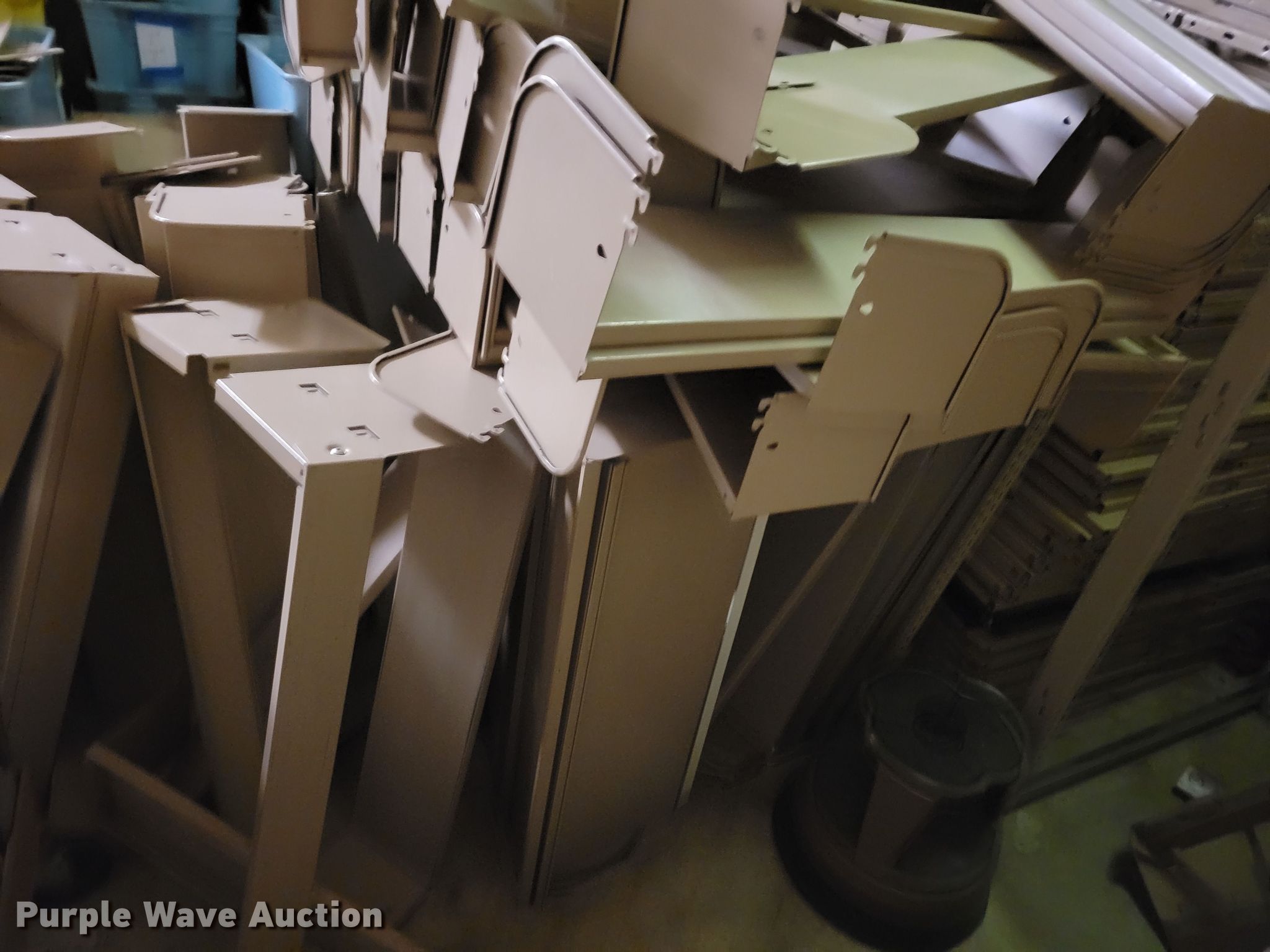 Purple Wave is selling a used Shelving and Storage in Nebraska. This item is a Shelving with the following: Metal shelving, 9' x 6' x 82", Approx. 35 totes dividers, Uprights, Length: Approx. 90",, (12) metal countertops, 90" L x 20" W, (6) chipboard countertops, 59" to 114" L x 29" W, Four drawer filing cabinet, 18" x 28" x 52"