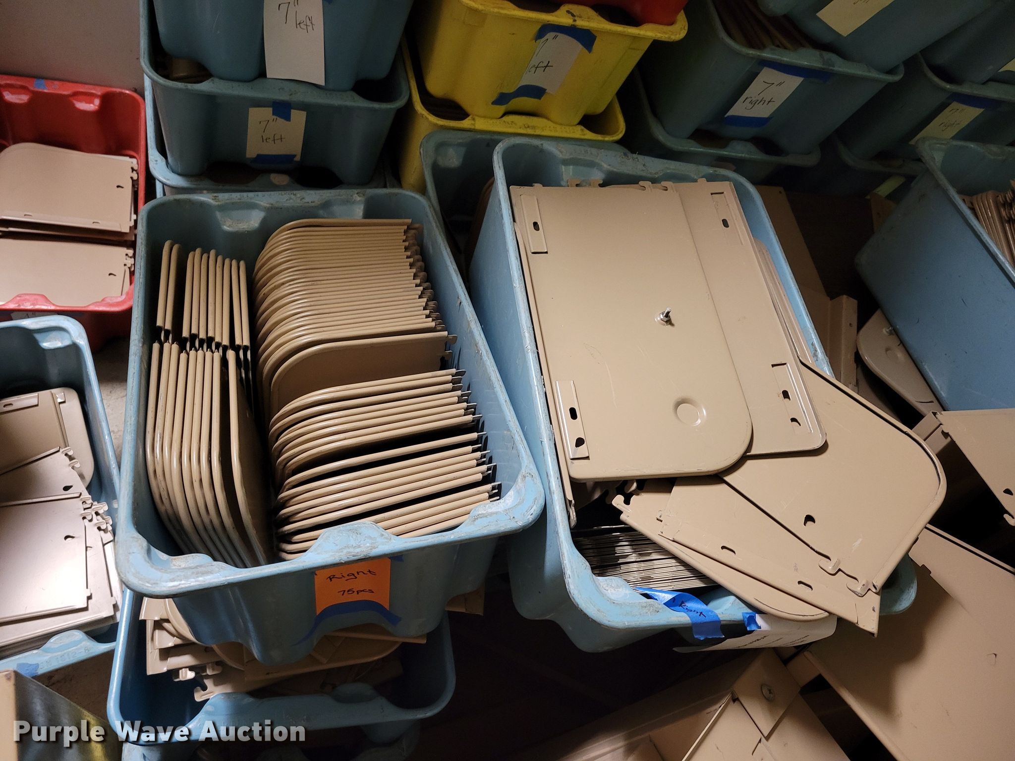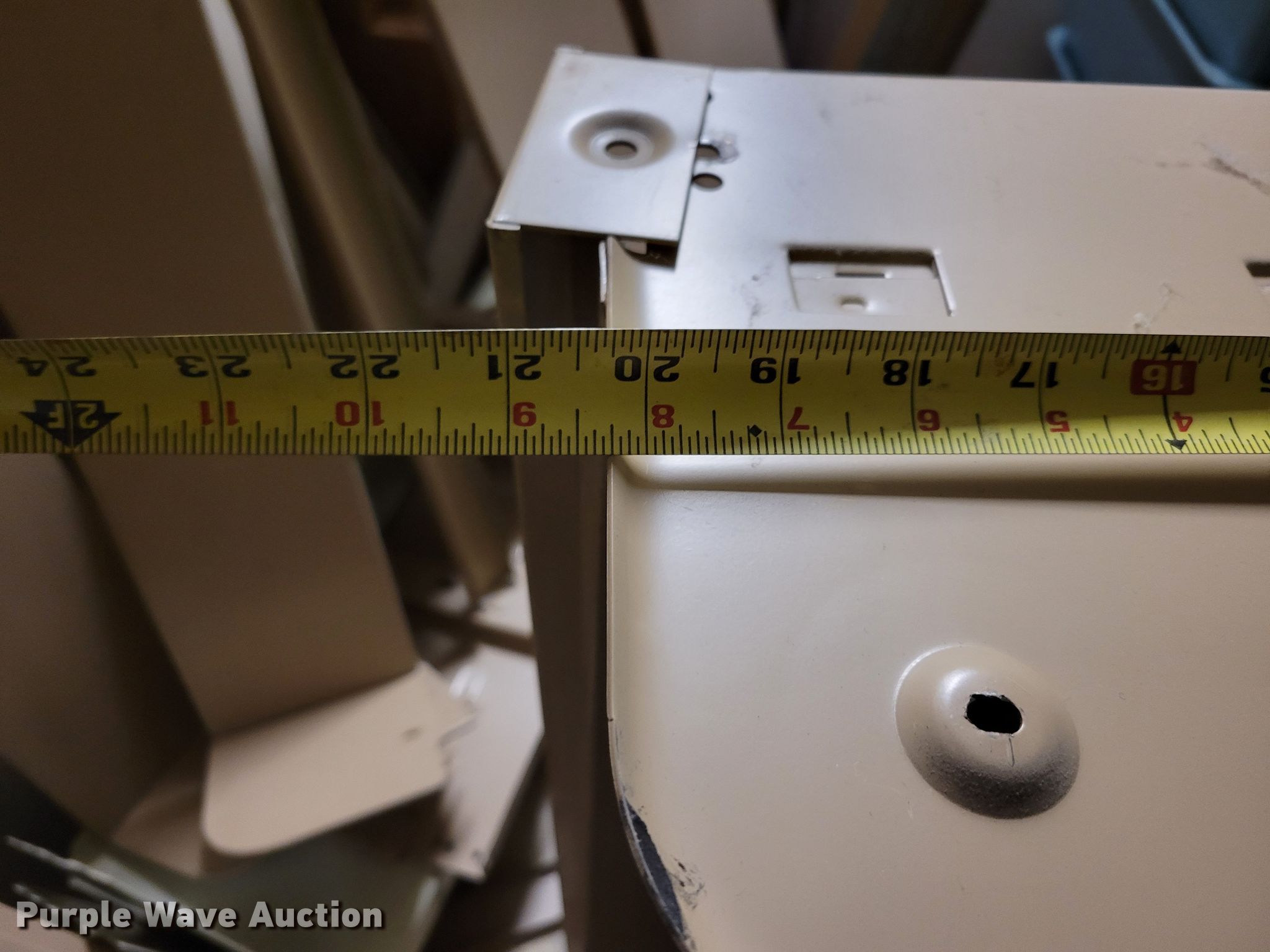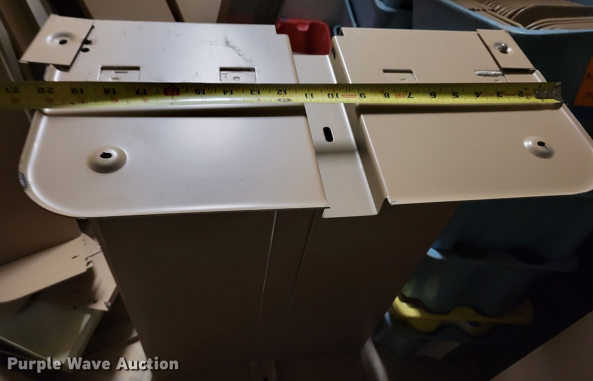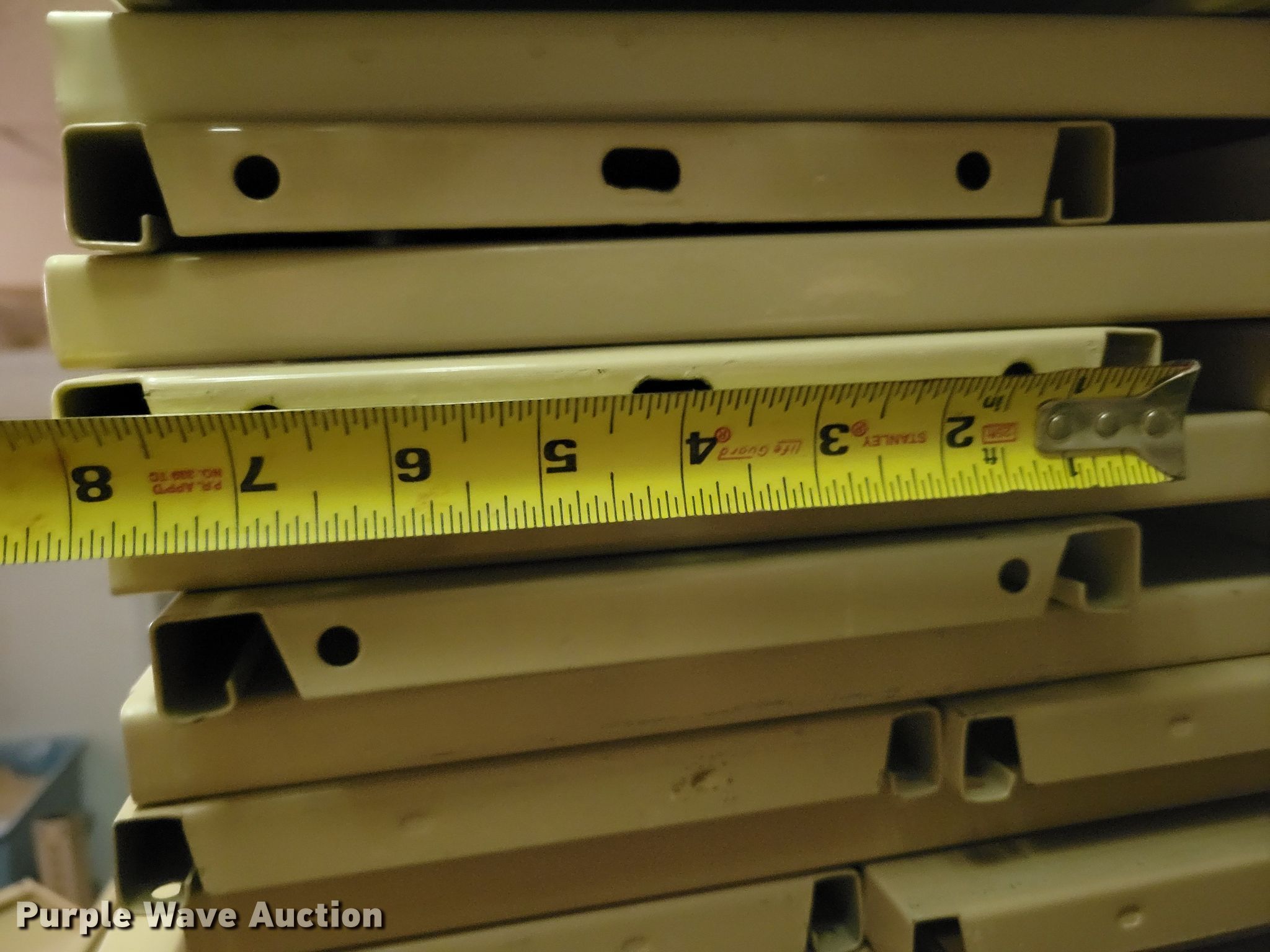 Purple Wave is selling a used Shelving and Storage in Nebraska. This item is a Shelving with the following: Metal shelving, 9' x 6' x 82", Approx. 35 totes dividers, Uprights, Length: Approx. 90",, (12) metal countertops, 90" L x 20" W, (6) chipboard countertops, 59" to 114" L x 29" W, Four drawer filing cabinet, 18" x 28" x 52"