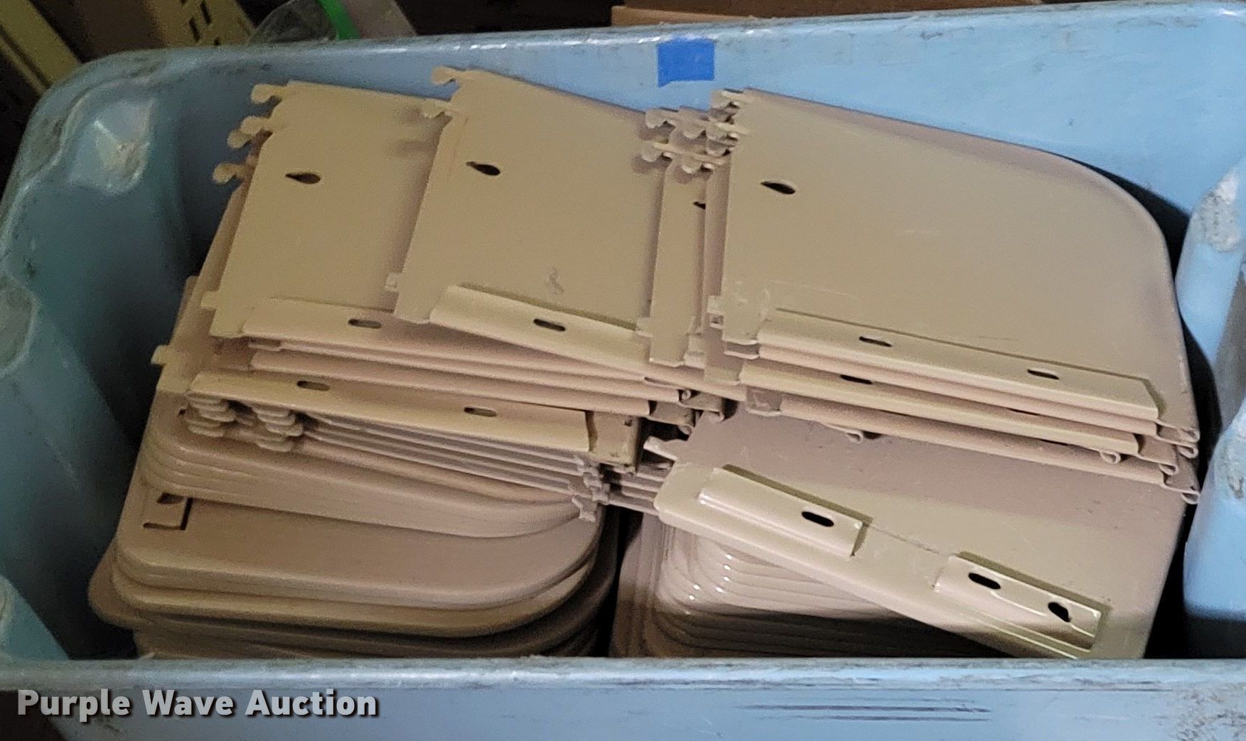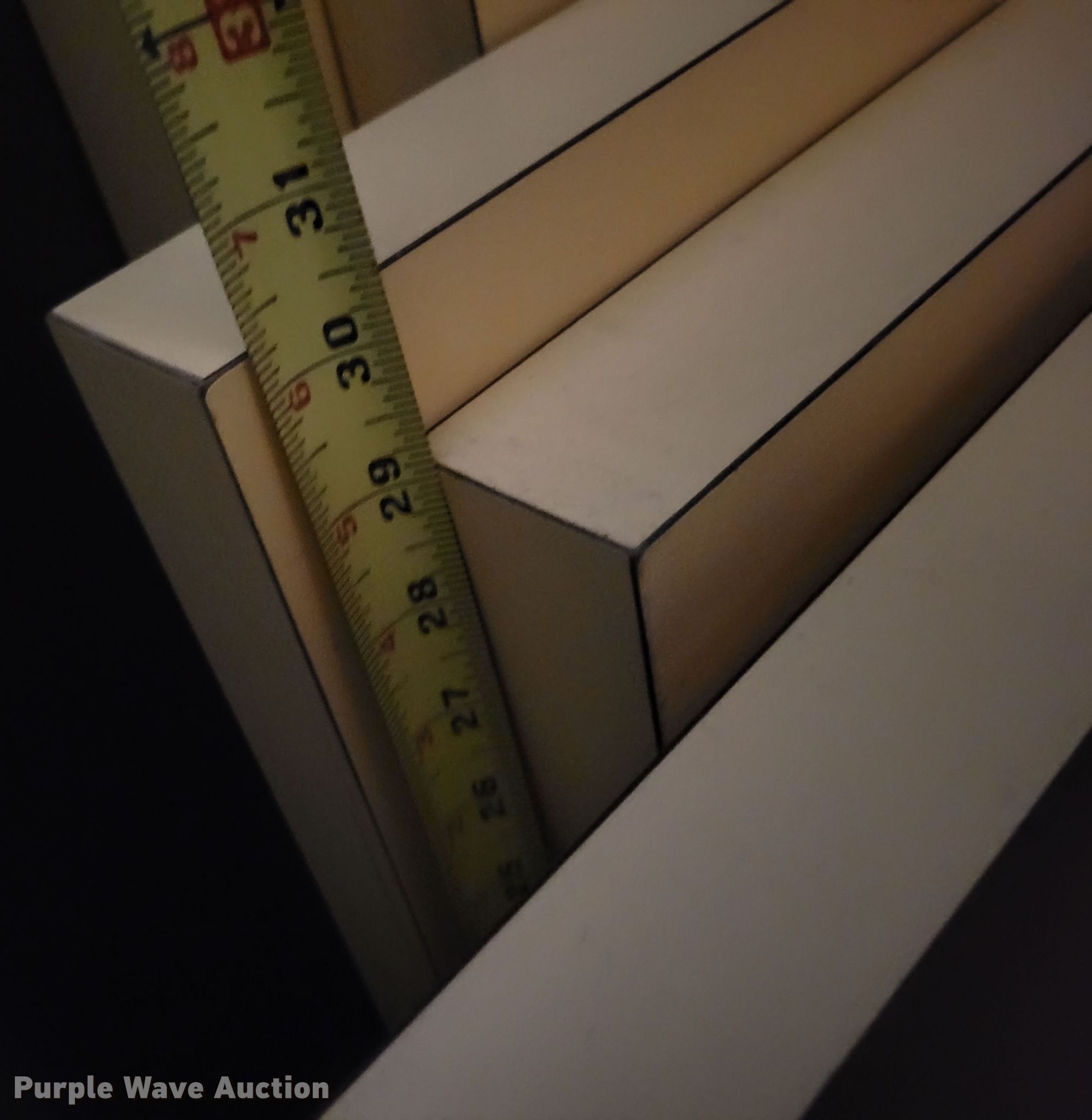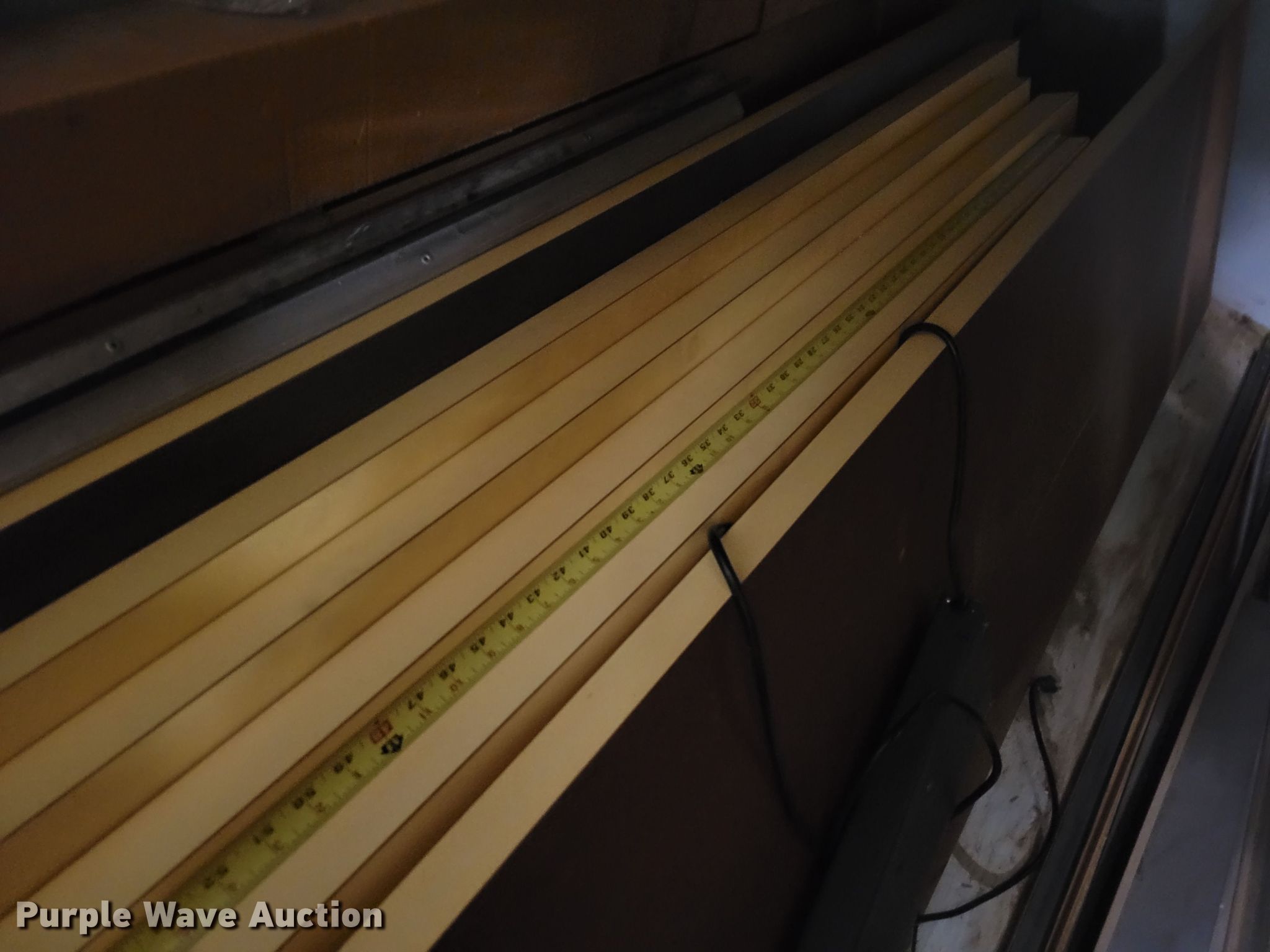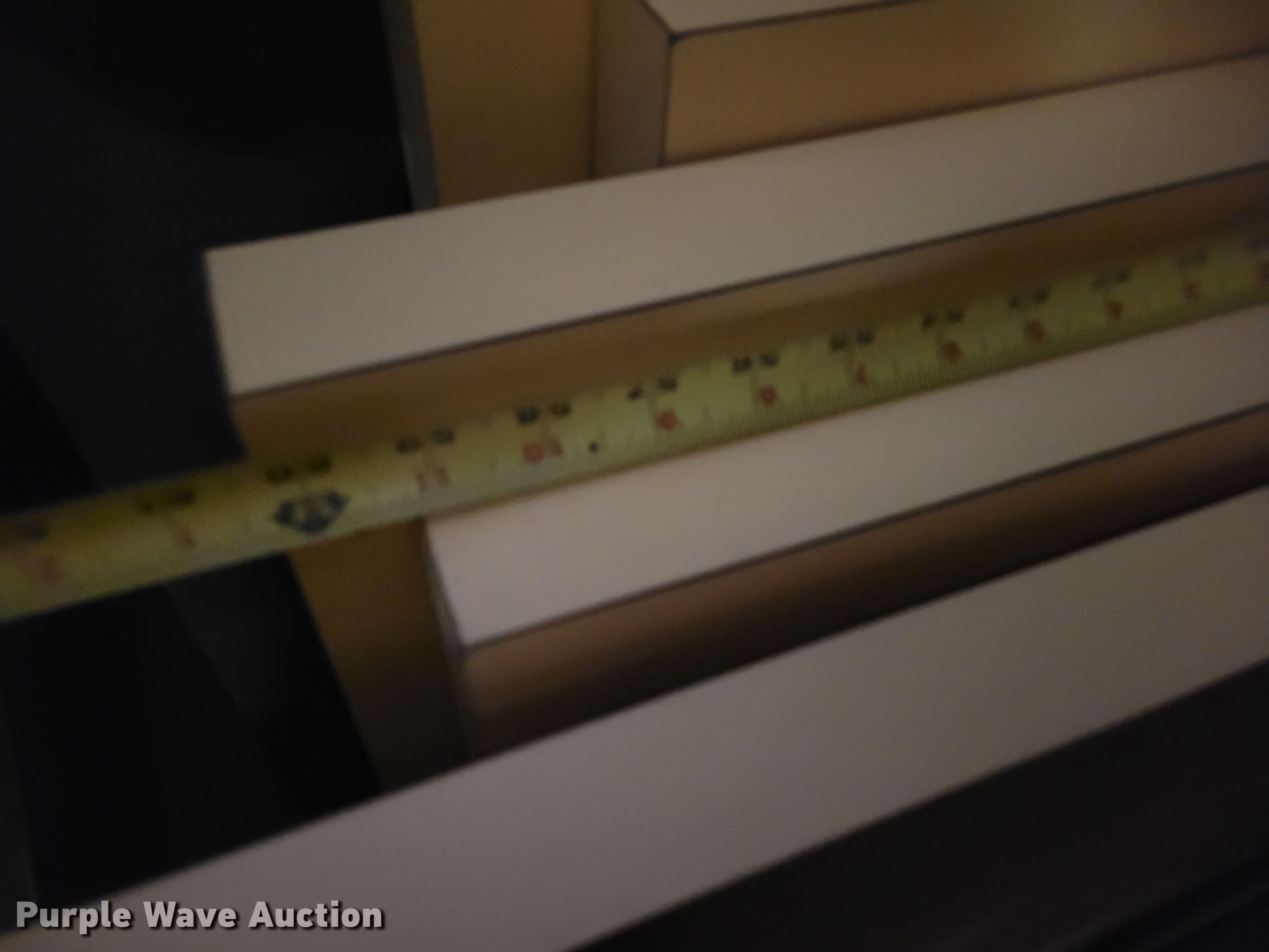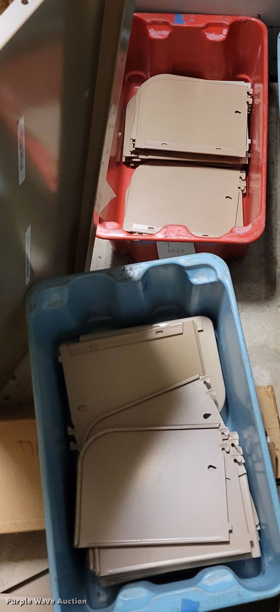 Purple Wave is selling a used Shelving and Storage in Nebraska. This item is a Shelving with the following: Metal shelving, 9' x 6' x 82", Approx. 35 totes dividers, Uprights, Length: Approx. 90",, (12) metal countertops, 90" L x 20" W, (6) chipboard countertops, 59" to 114" L x 29" W, Four drawer filing cabinet, 18" x 28" x 52"