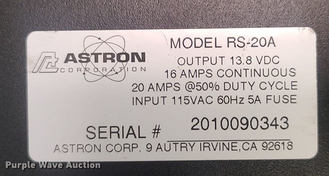 Purple Wave is selling a used Electronics in Kansas. This item is a Astron RS-20A power supply with the following: 60 Hz, 500 watts, Serial: 2010090343