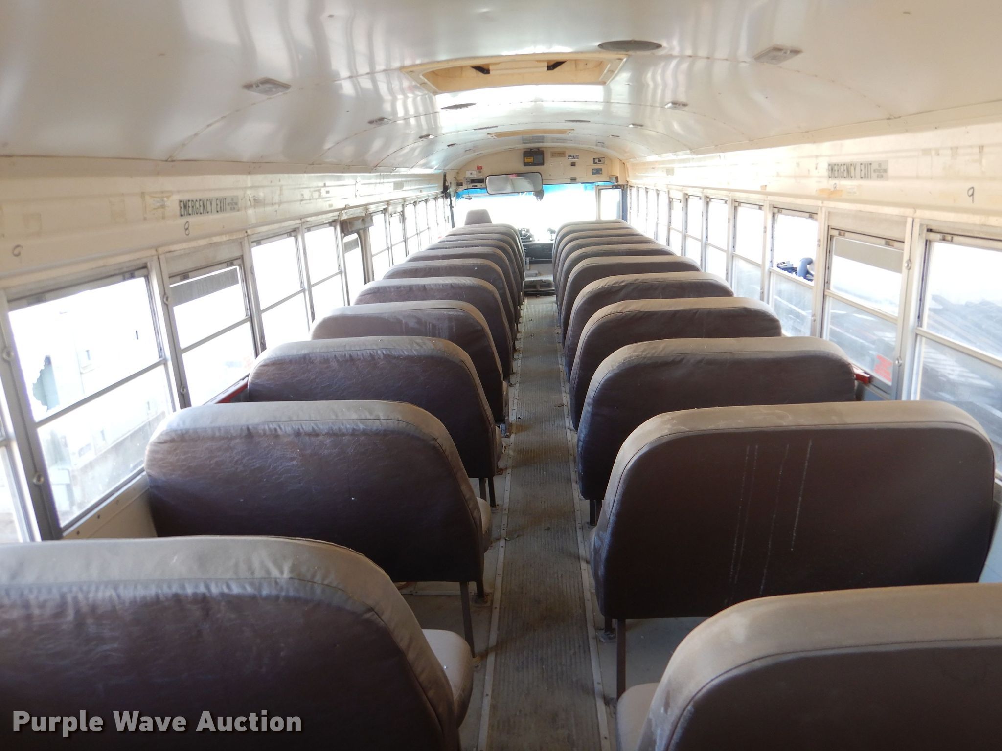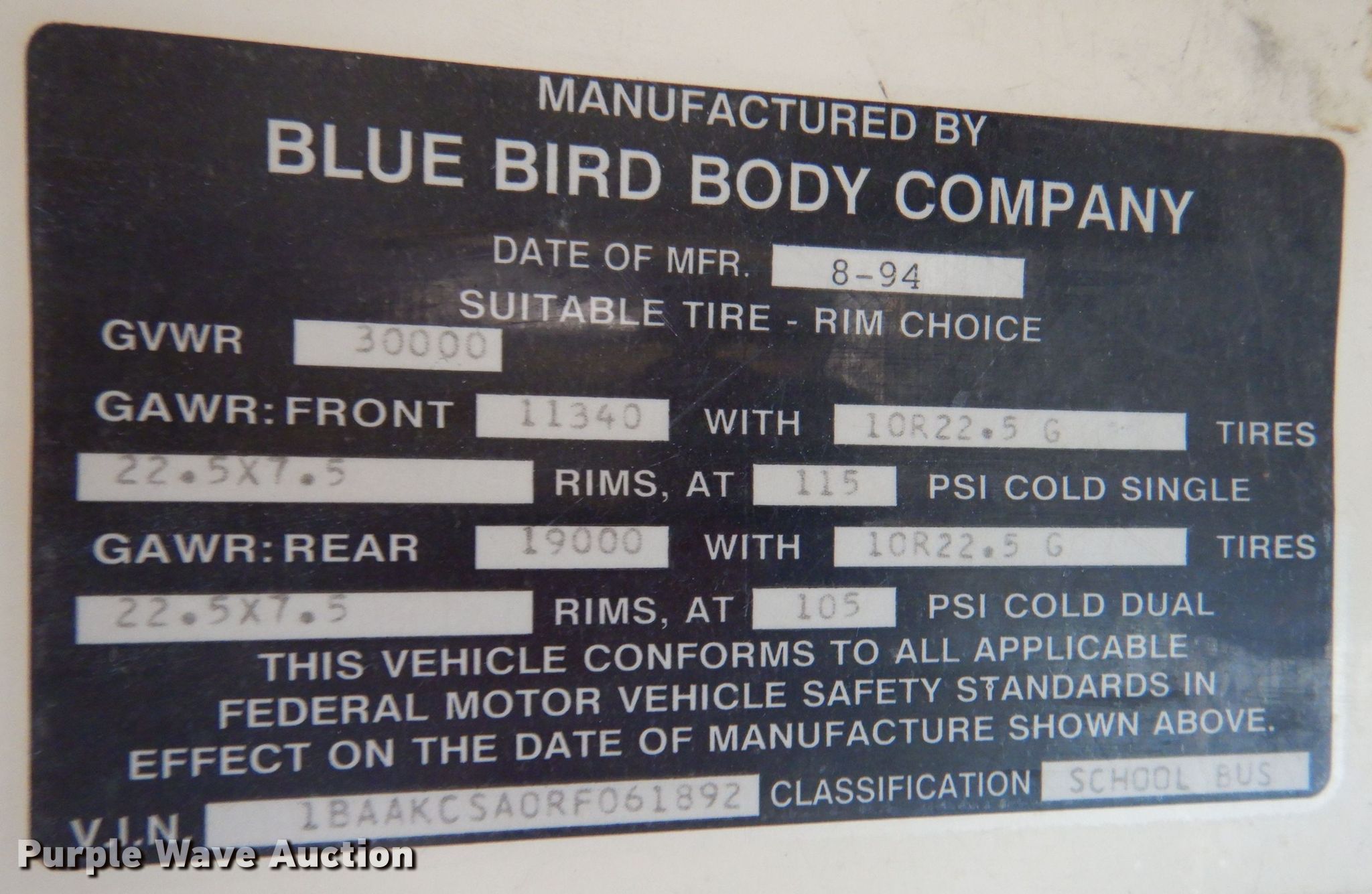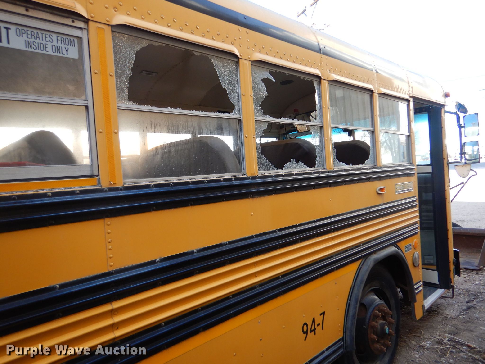 1994 Blue Bird TC2000 school bus. Miles: 233,205 on odometer, VIN: 1BAAKCSA0RF061892. Engine Displacement: 5.9L L6, Cylinders: 6, Fuel type: Diesel. Transmission Automatic. Chassis Axles: Single, Suspension: Spring, Brakes: Air, GVWR: 30,000 lbs. Interior Heat, Passengers: 69. Tires Size: 10R22.5. Notes Broken windows, Non-operational exterior storage doors, Unknown operating condition. Kansas title. Title distribution may be delayed up to 14 days from verification of funds. USD 347. 309 S. Colony. Kinsley, KS 67547