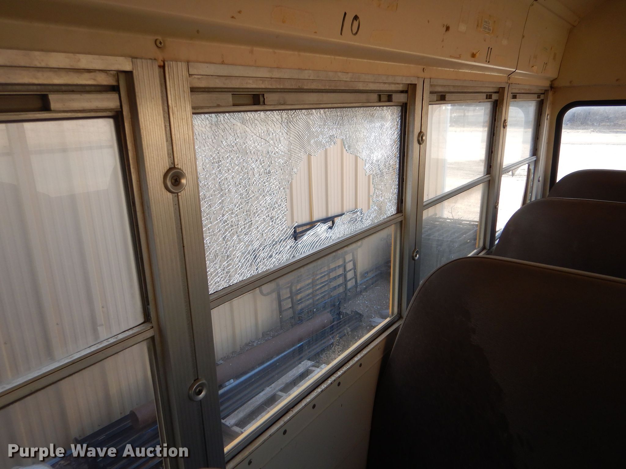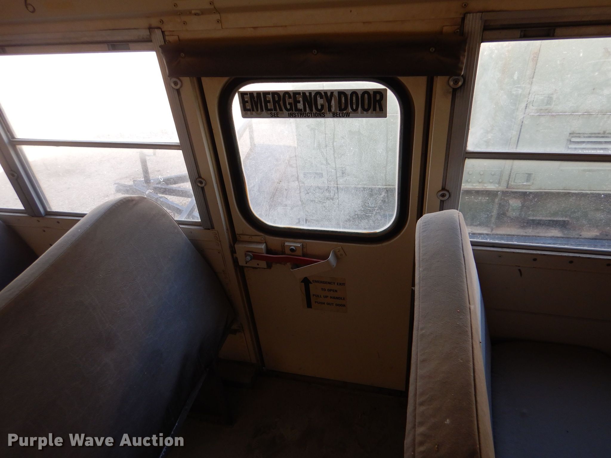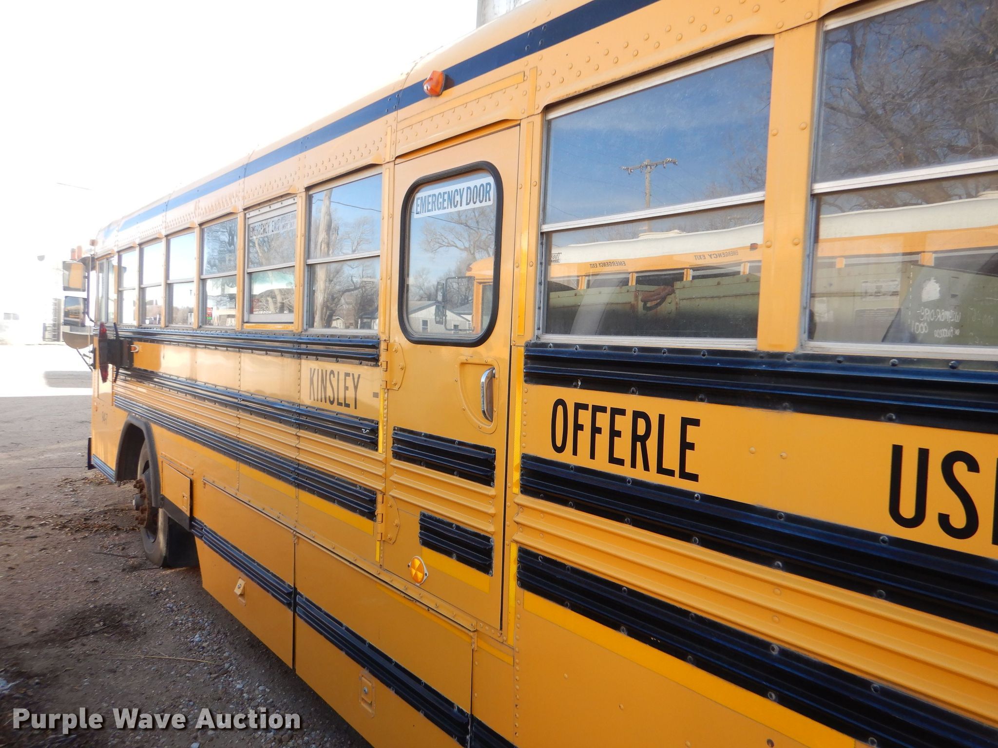 1994 Blue Bird TC2000 school bus. Miles: 233,205 on odometer, VIN: 1BAAKCSA0RF061892. Engine Displacement: 5.9L L6, Cylinders: 6, Fuel type: Diesel. Transmission Automatic. Chassis Axles: Single, Suspension: Spring, Brakes: Air, GVWR: 30,000 lbs. Interior Heat, Passengers: 69. Tires Size: 10R22.5. Notes Broken windows, Non-operational exterior storage doors, Unknown operating condition. Kansas title. Title distribution may be delayed up to 14 days from verification of funds. USD 347. 309 S. Colony. Kinsley, KS 67547