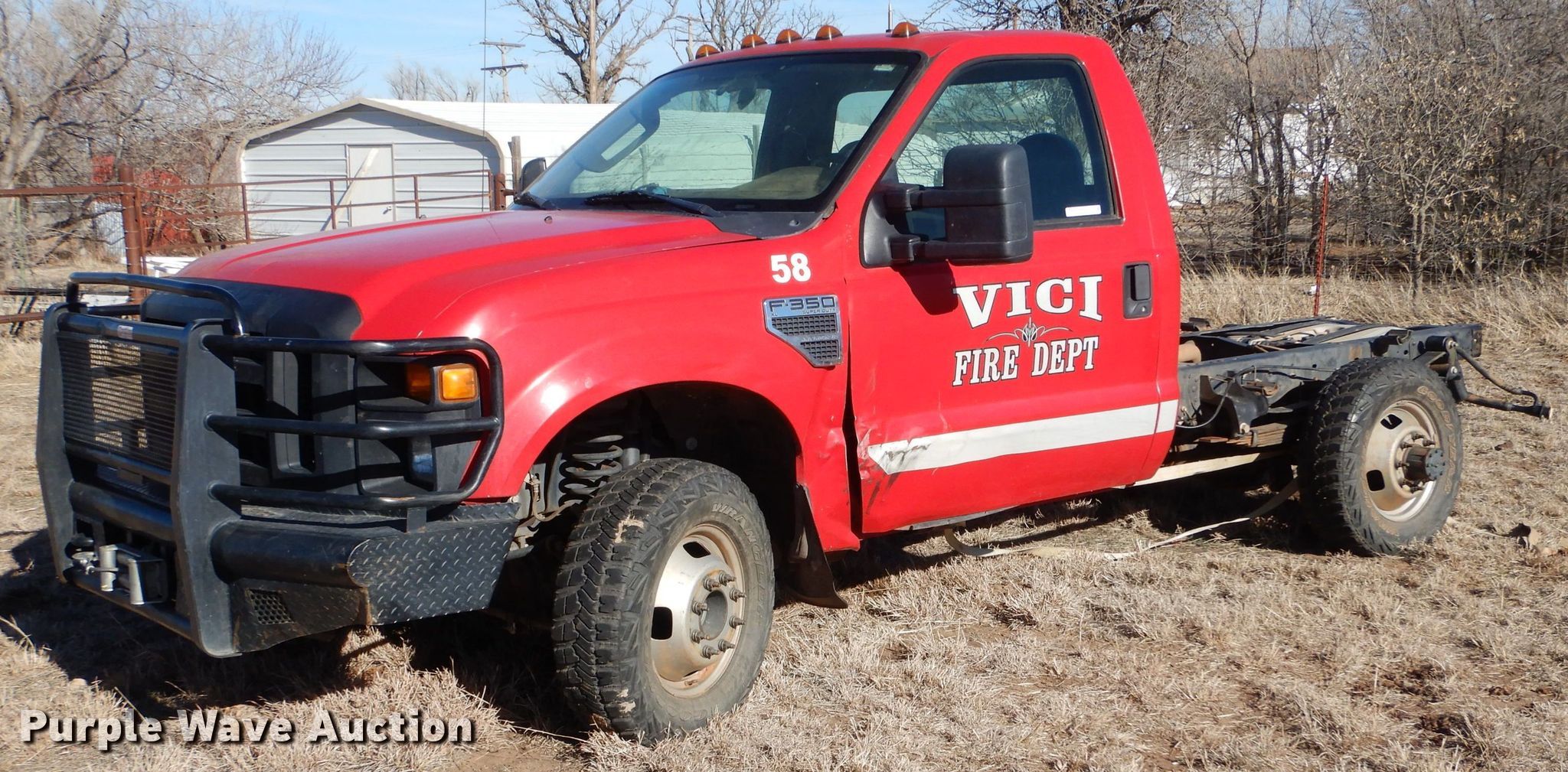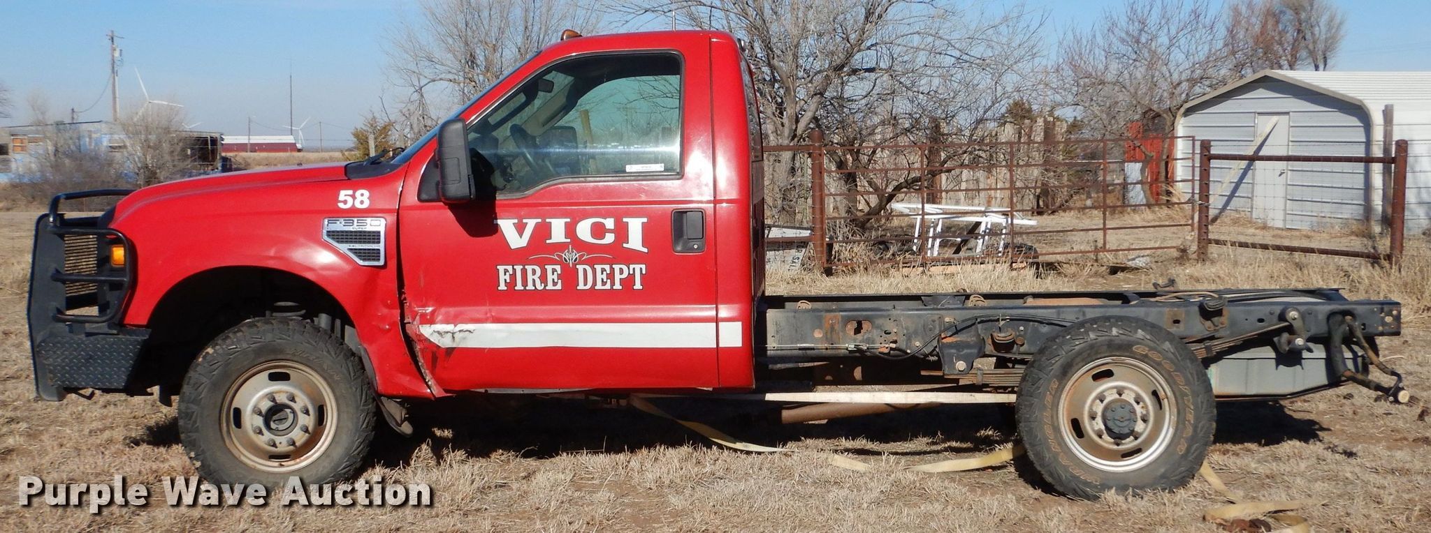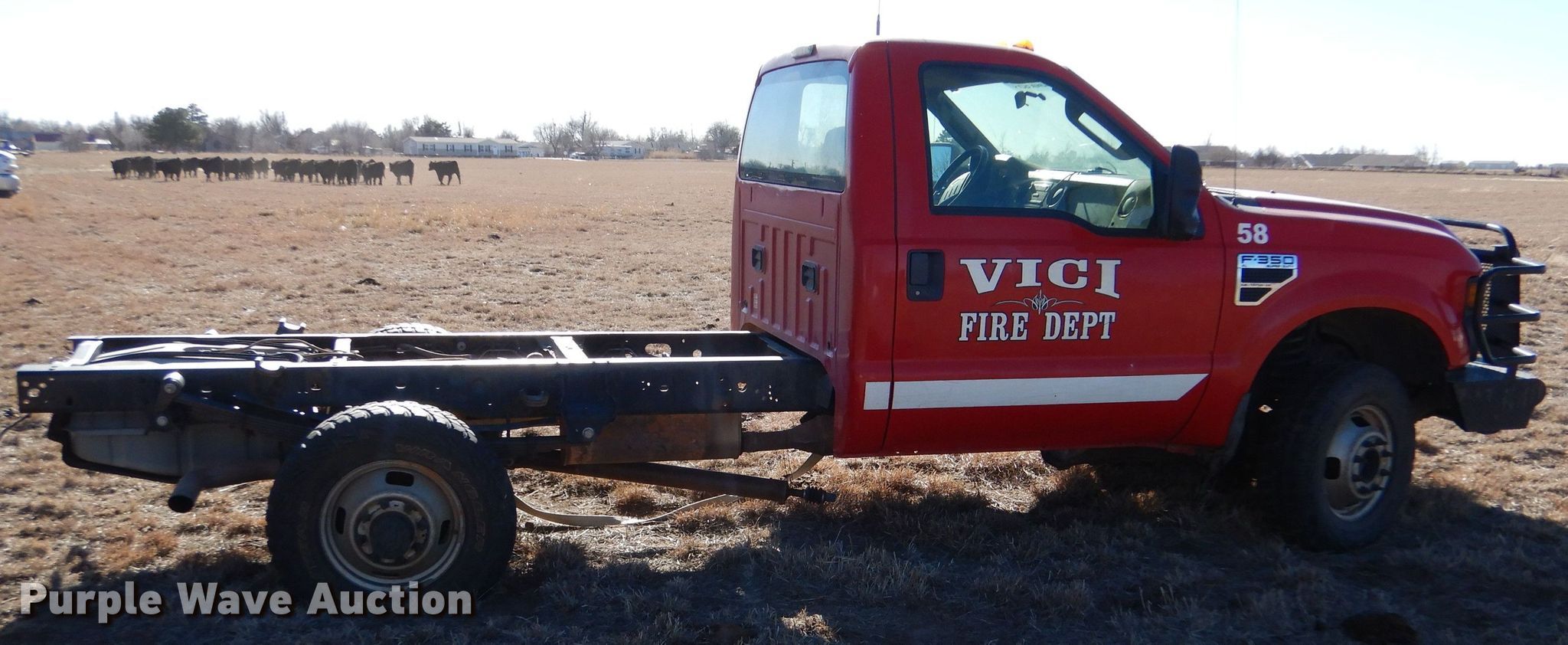 2008 Ford F350 Super Duty XL pickup truck cab and chassis. Miles: 18,435 on odometer, VIN: 1FDWF37Y38EE54467. Engine Displacement: 6.8L V10 SOHC, Cylinders: 10, Fuel type: Gas. Transmission Automatic, Four wheel drive. Interior AC, Heat, Cruise control. Features Chassis: 9'. Tires Size: 245/75R17. Notes Windshield chipped or cracked, Dead battery, Transfer case cracked , Engine block cracked, Non-operational unit. Oklahoma title. Title distribution may be delayed up to 14 days from verification of funds. Vici Fire Department. Vici, OK 73859