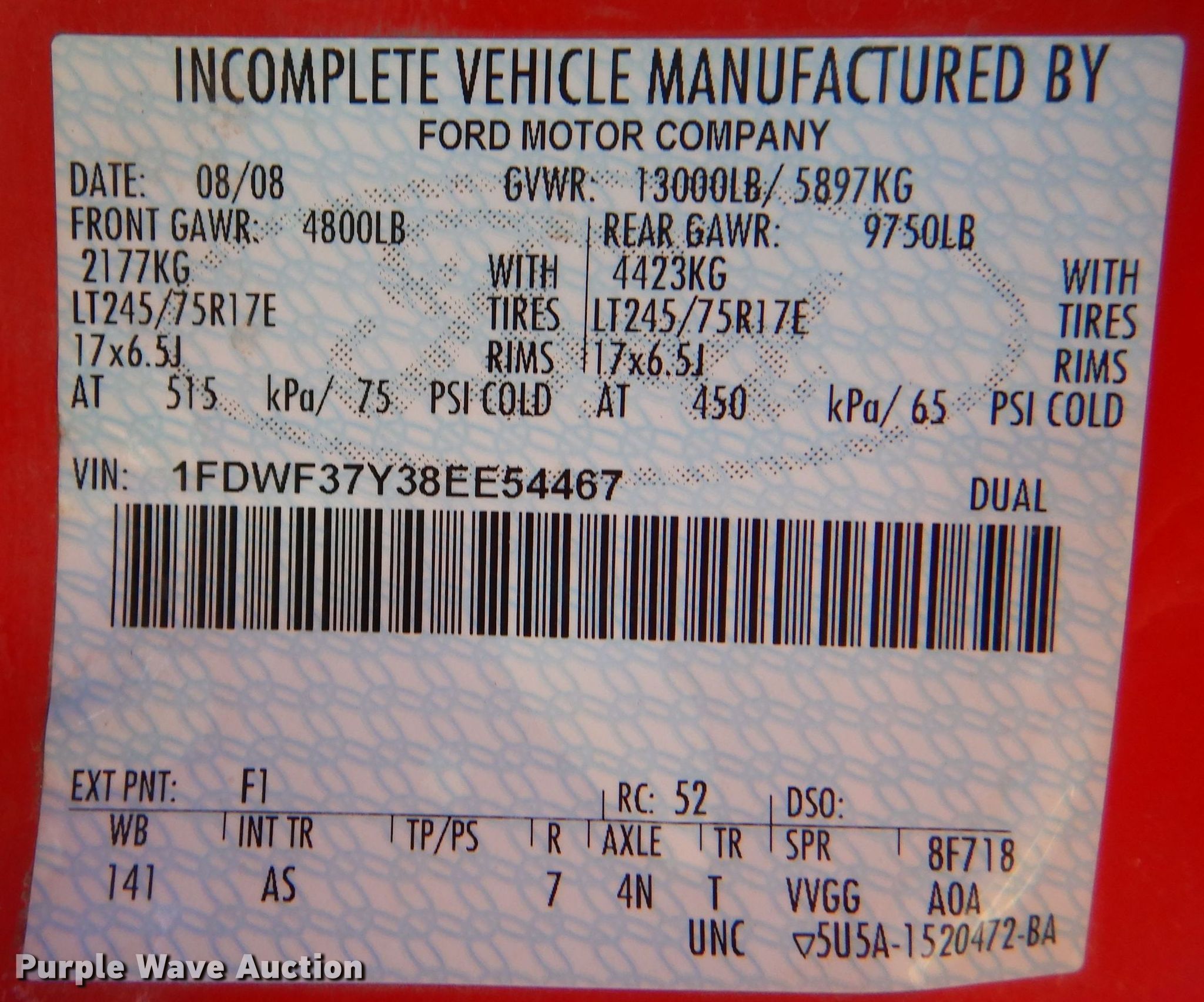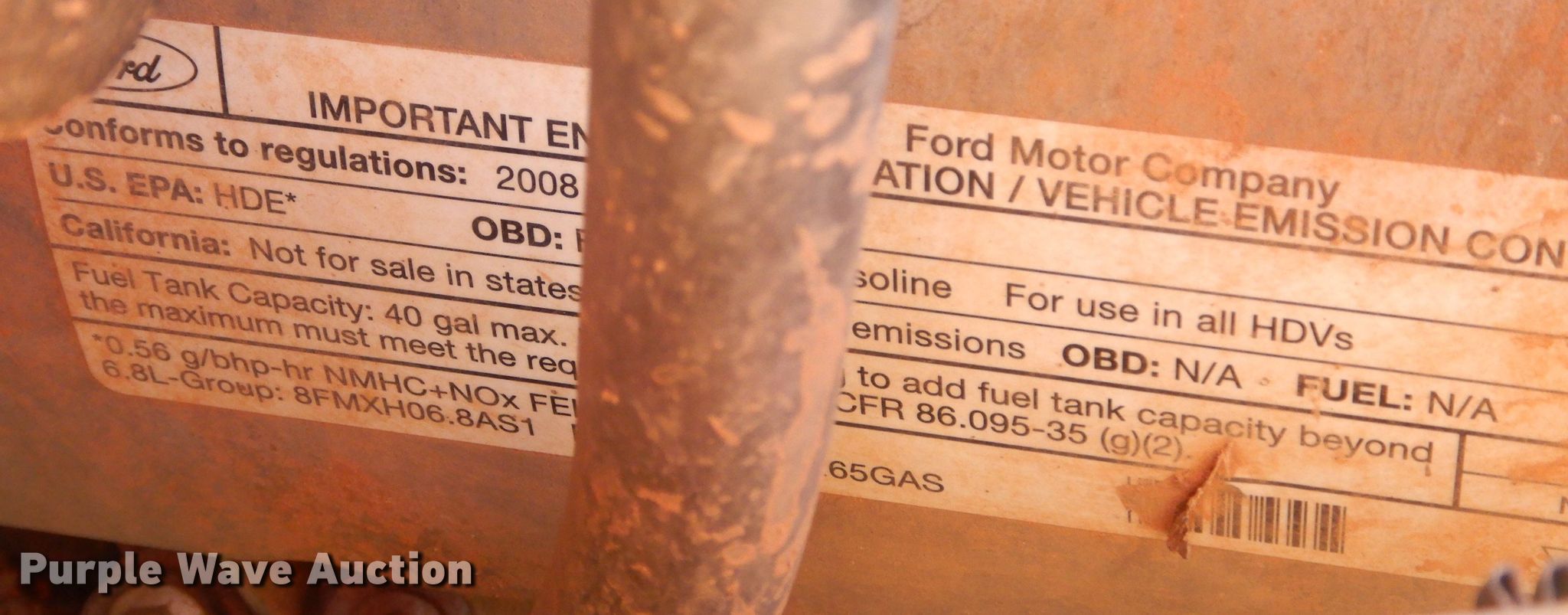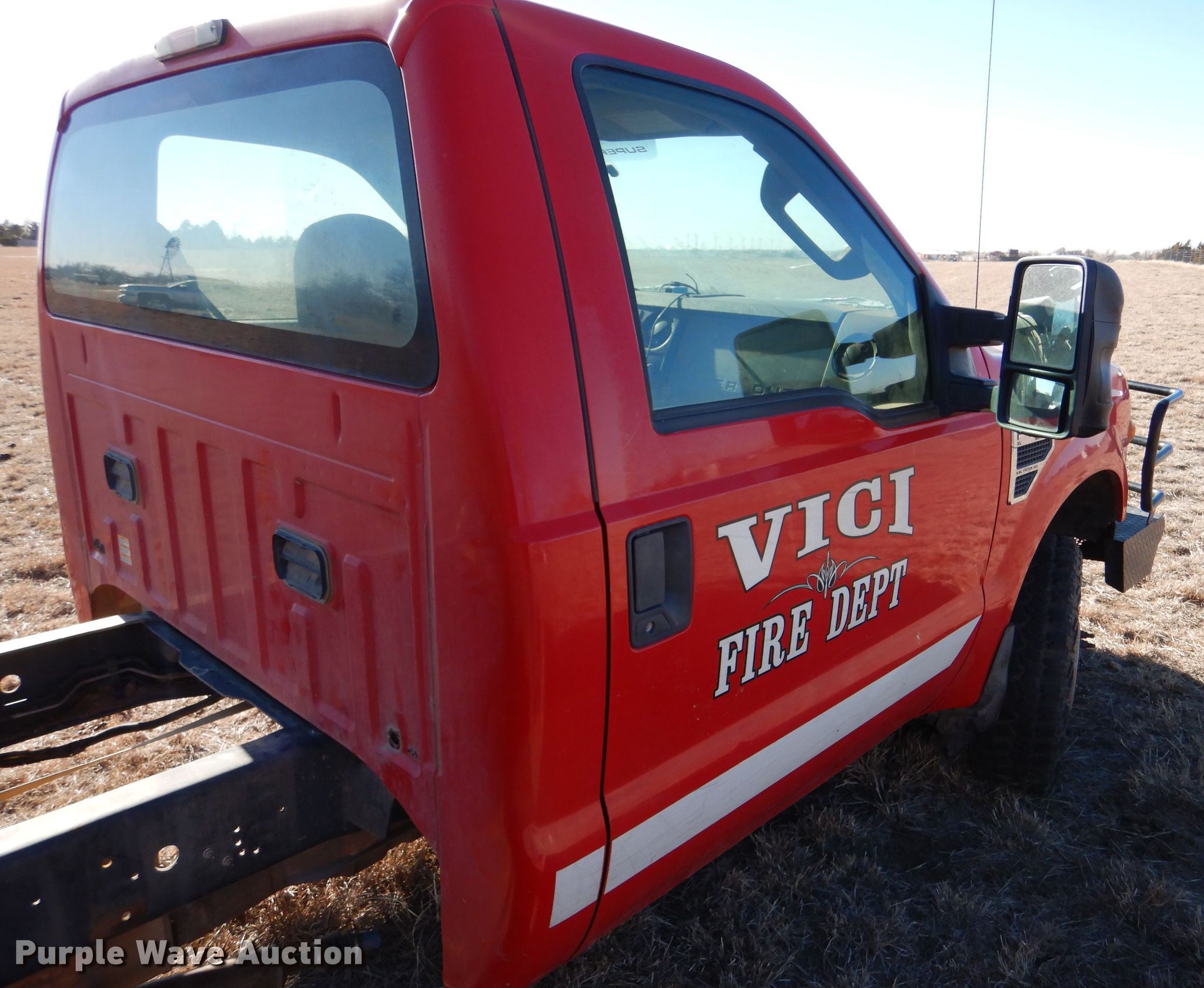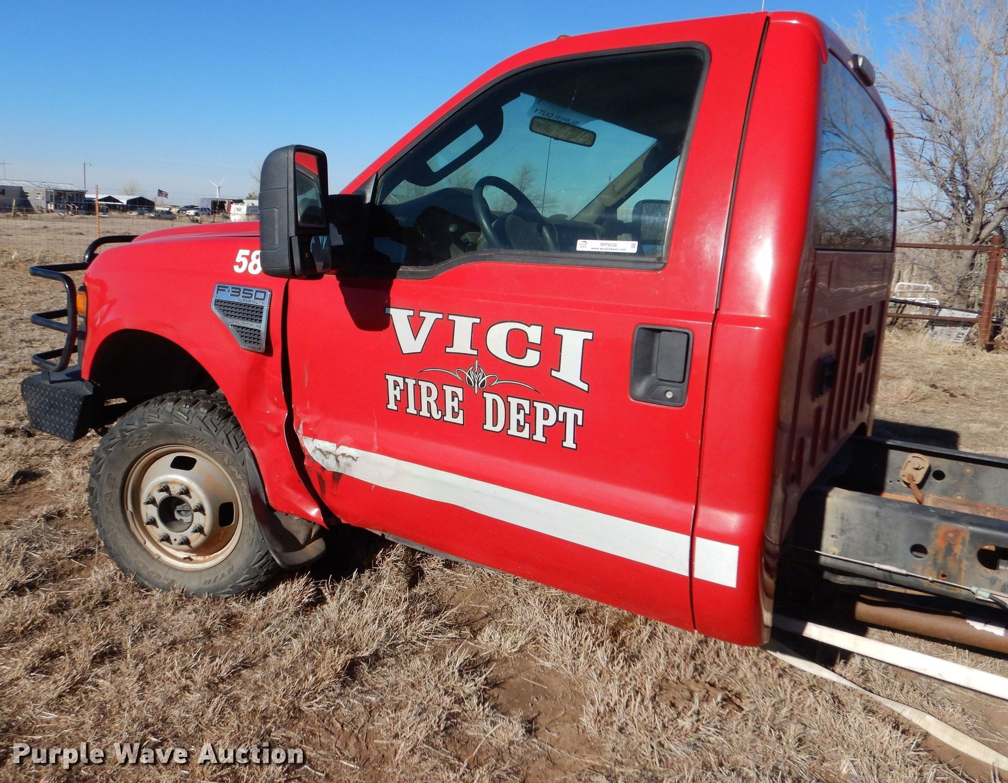 2008 Ford F350 Super Duty XL pickup truck cab and chassis. Miles: 18,435 on odometer, VIN: 1FDWF37Y38EE54467. Engine Displacement: 6.8L V10 SOHC, Cylinders: 10, Fuel type: Gas. Transmission Automatic, Four wheel drive. Interior AC, Heat, Cruise control. Features Chassis: 9'. Tires Size: 245/75R17. Notes Windshield chipped or cracked, Dead battery, Transfer case cracked , Engine block cracked, Non-operational unit. Oklahoma title. Title distribution may be delayed up to 14 days from verification of funds. Vici Fire Department. Vici, OK 73859