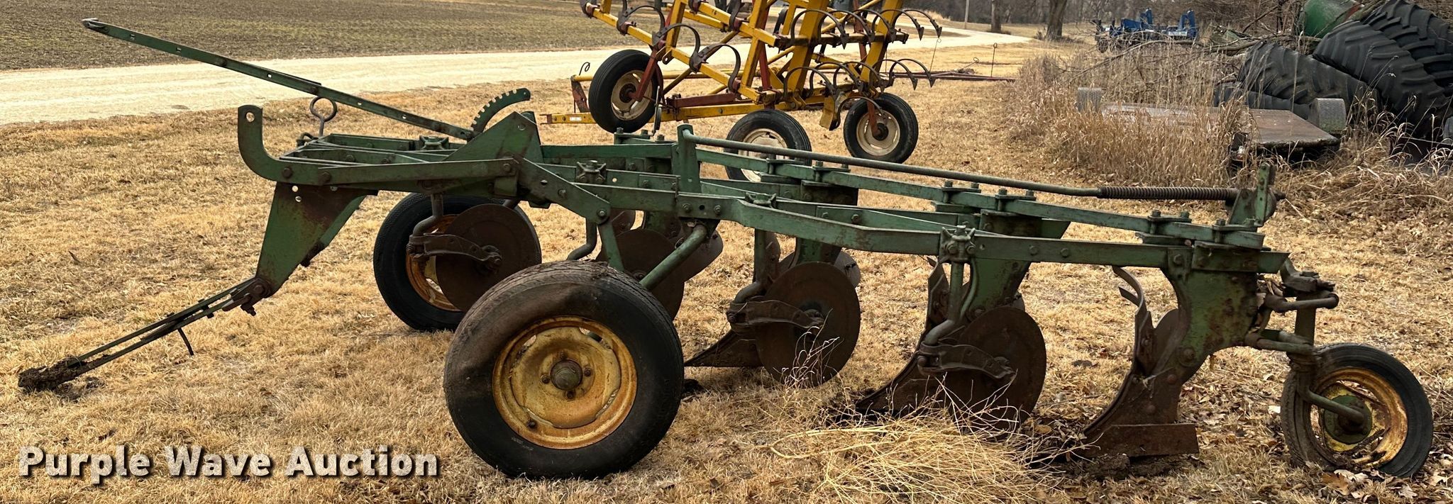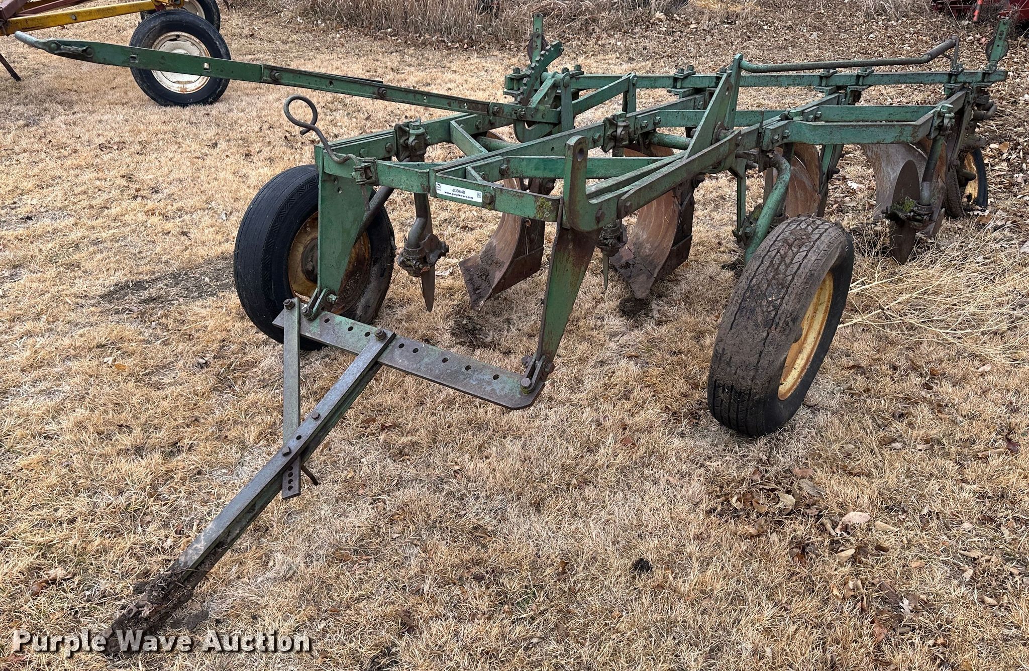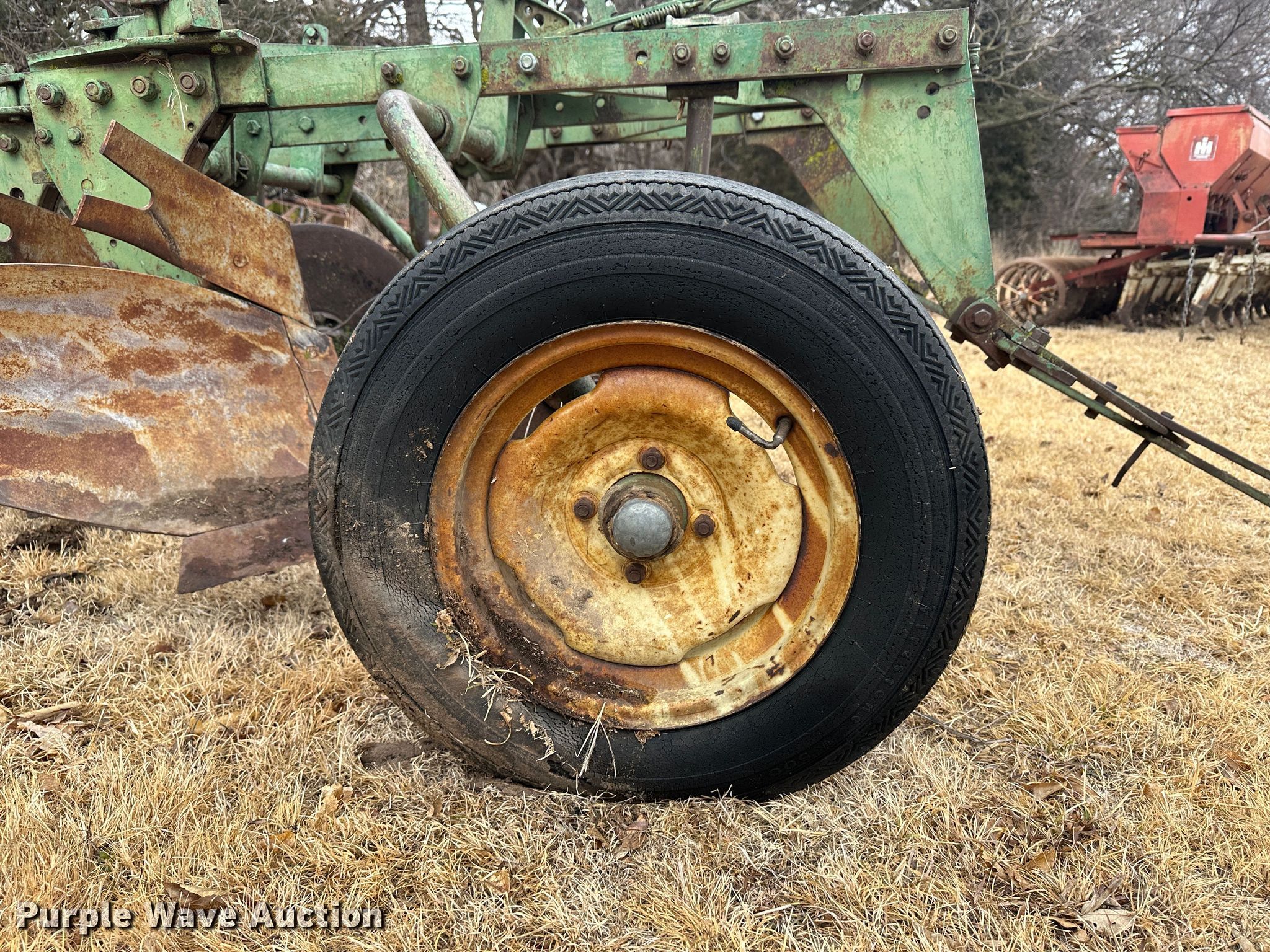 Purple Wave is selling a used Plow in Kansas. This item is a John Deere plow with the following: Overall width: 6', Tire size: 215/75R15, Gauge wheels