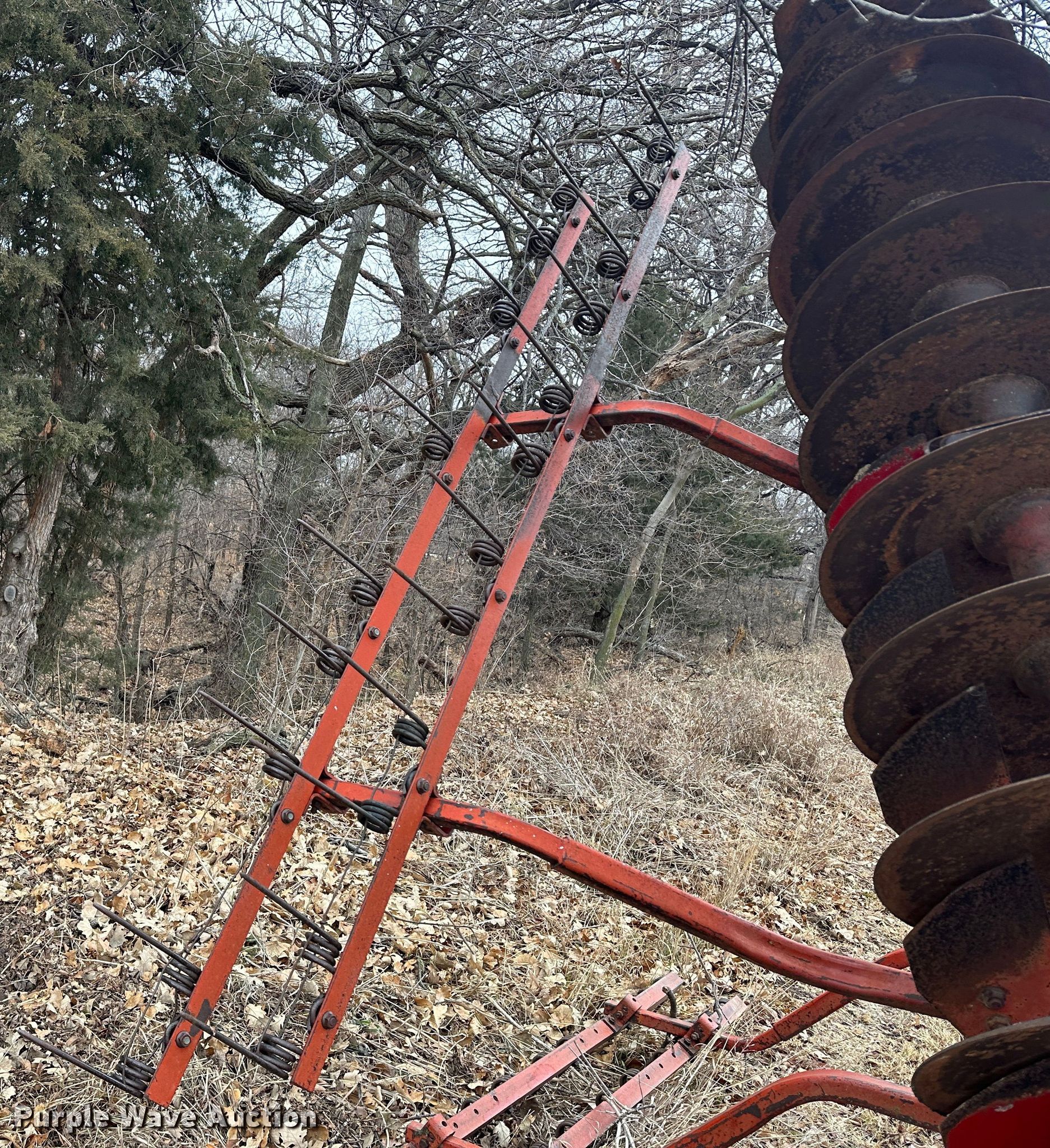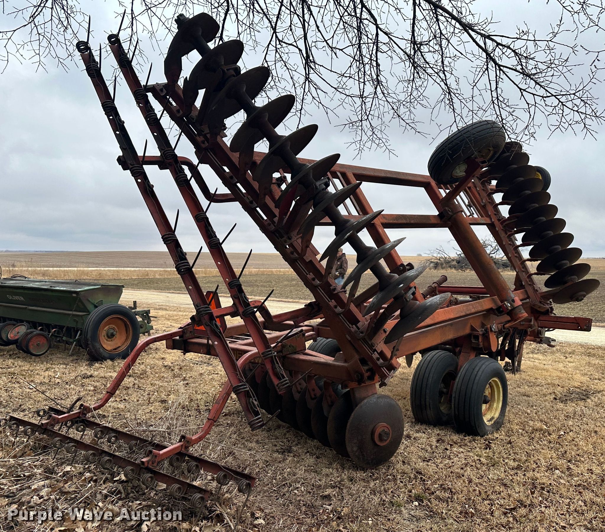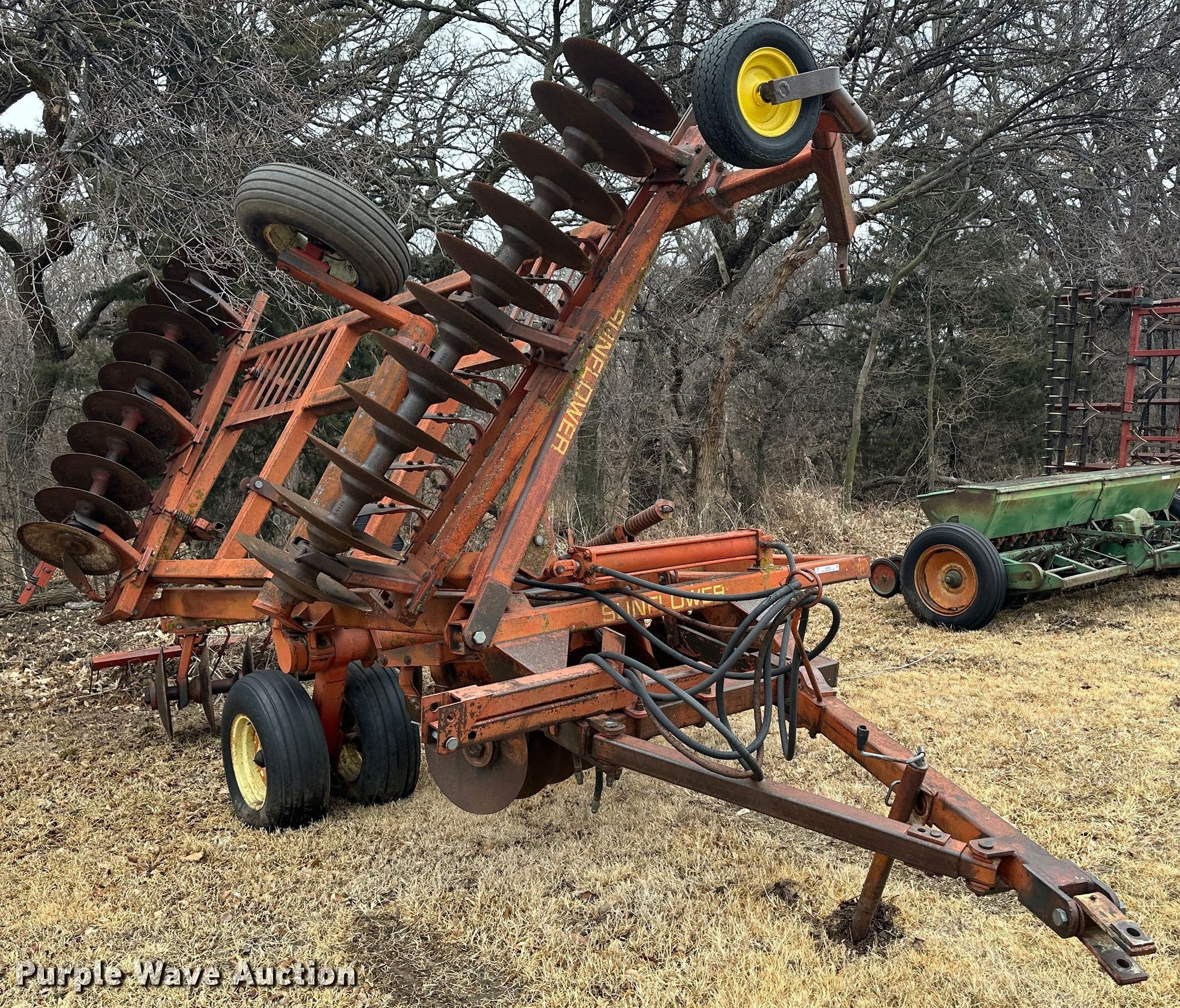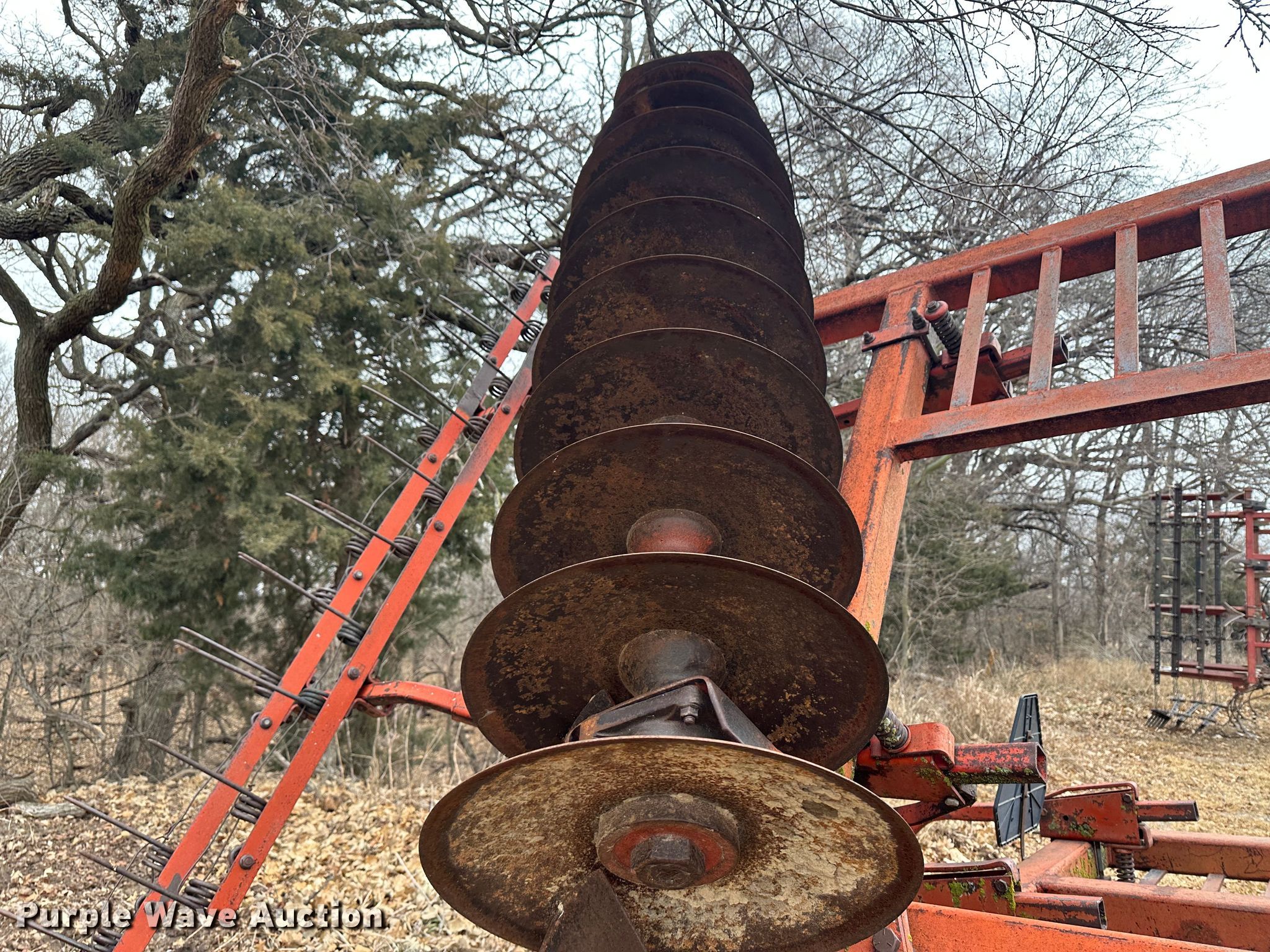 Sunflower disk. Overall width: 14'. Features Front blades Diameter: 19", Spacing: 7.5", Rear blades Diameter: 20", Spacing: 8.5", Disk scrapers, Operation Hydraulic lift, Hydraulic fold, Leveler: Manual, Attachments Tine harrow Harrow bars: 2.. Tires Tire size: 9.5L-15. Glen Elder, KS 67446